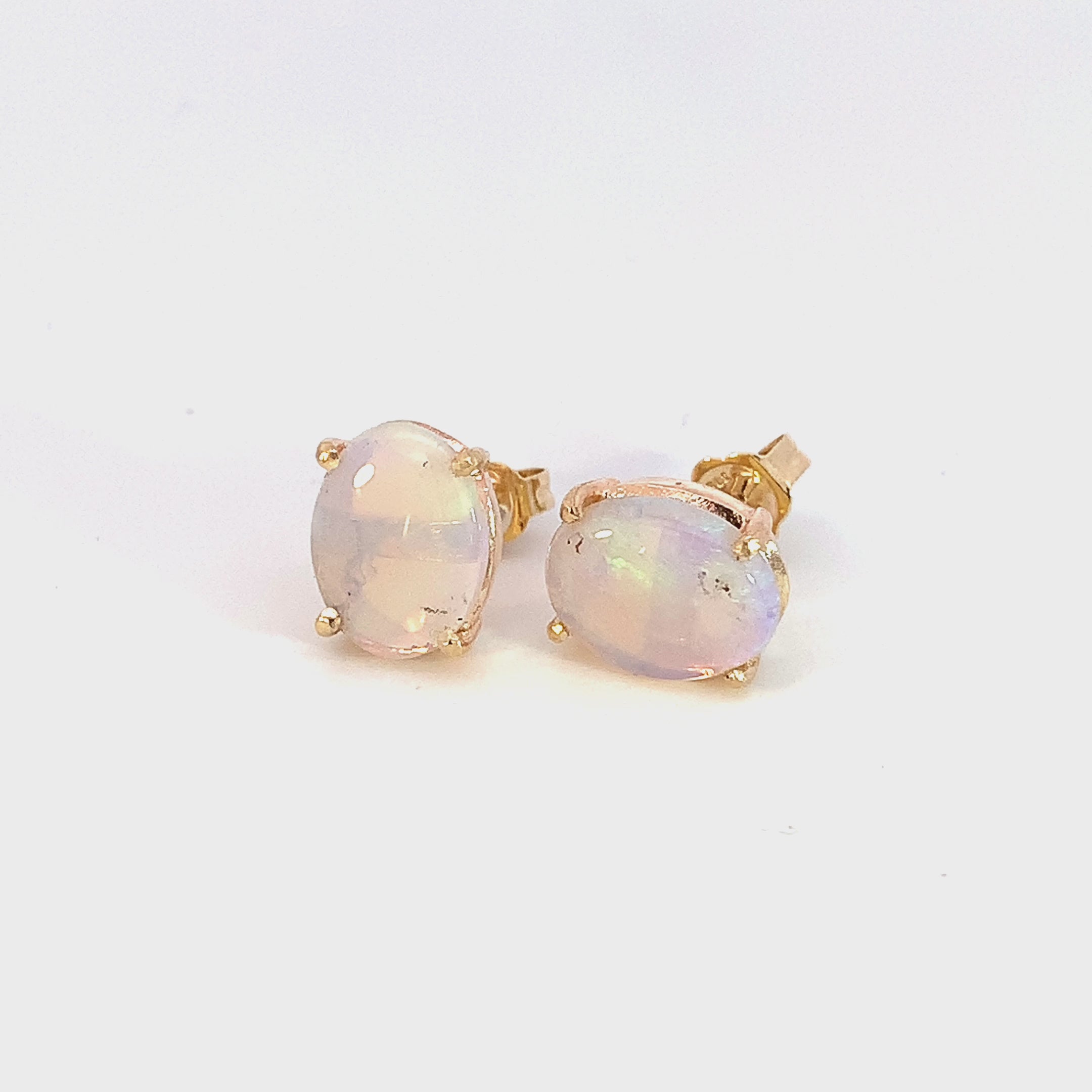 9kt Yellow Gold studs set with two 10x8mm Light Opals claw set 3ct
