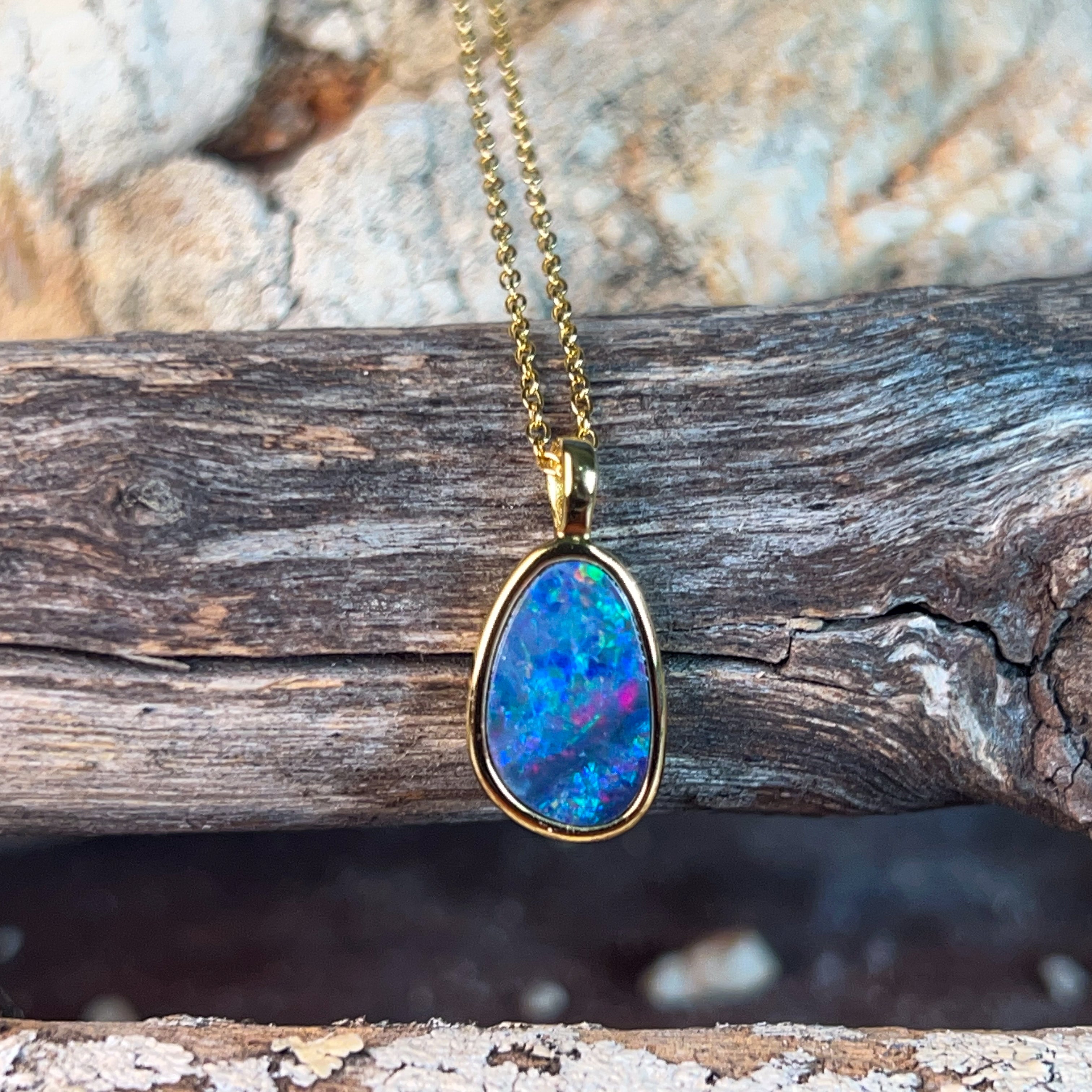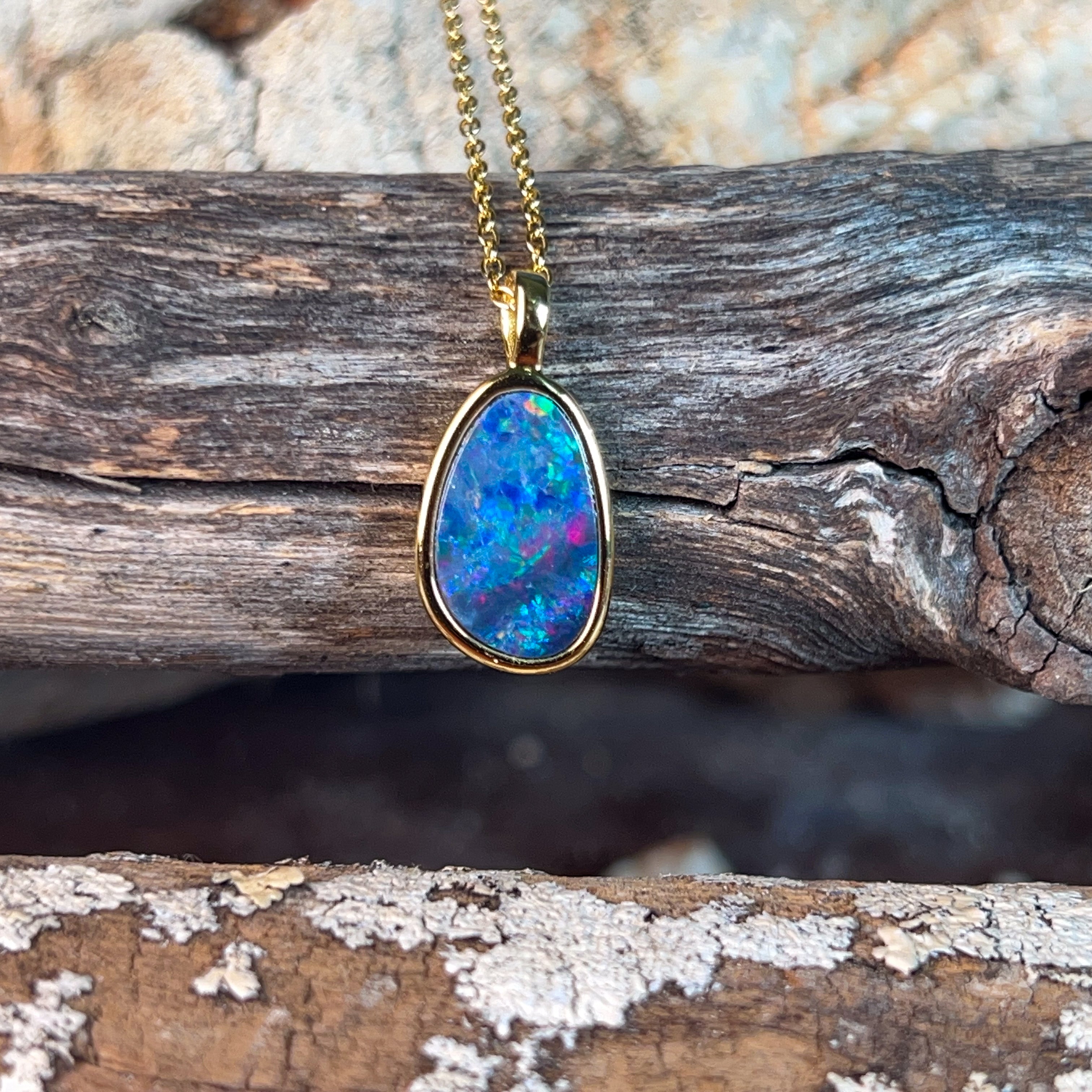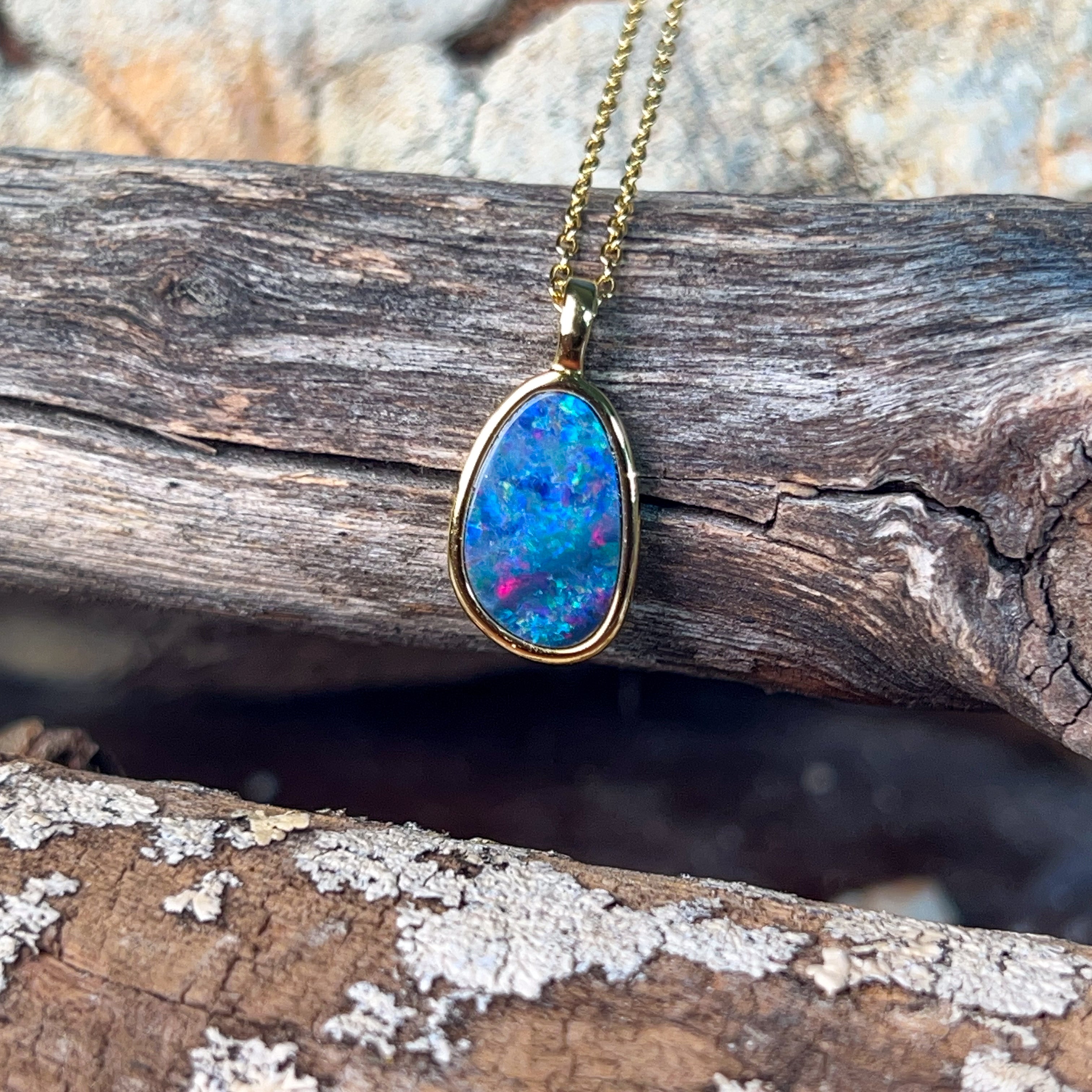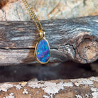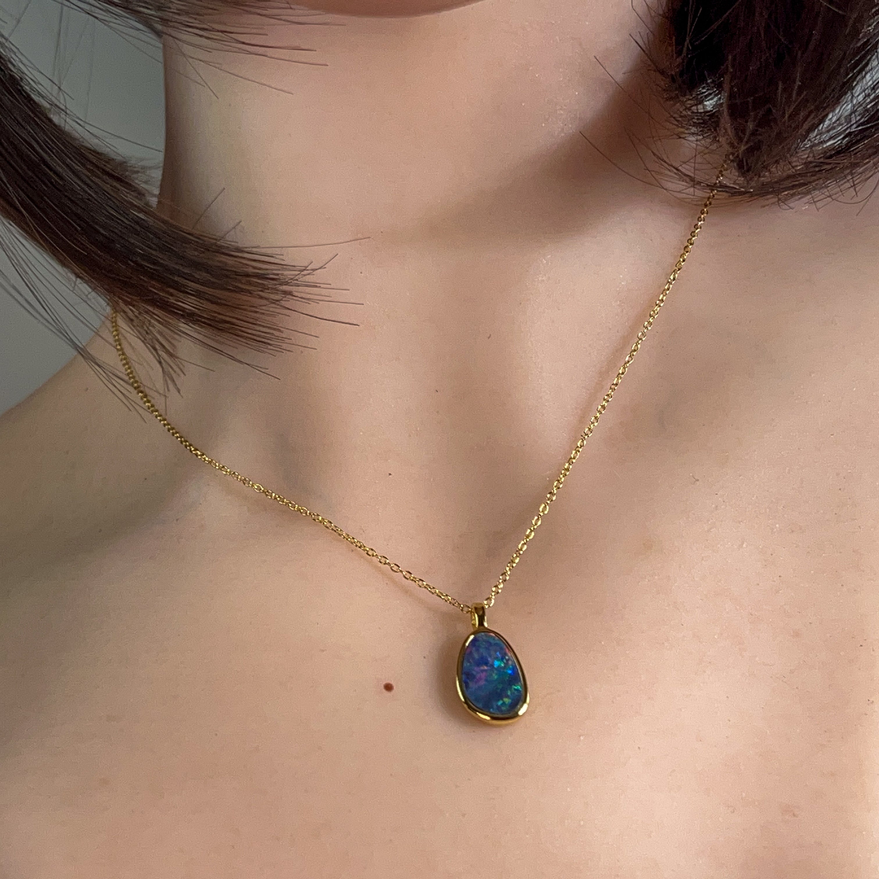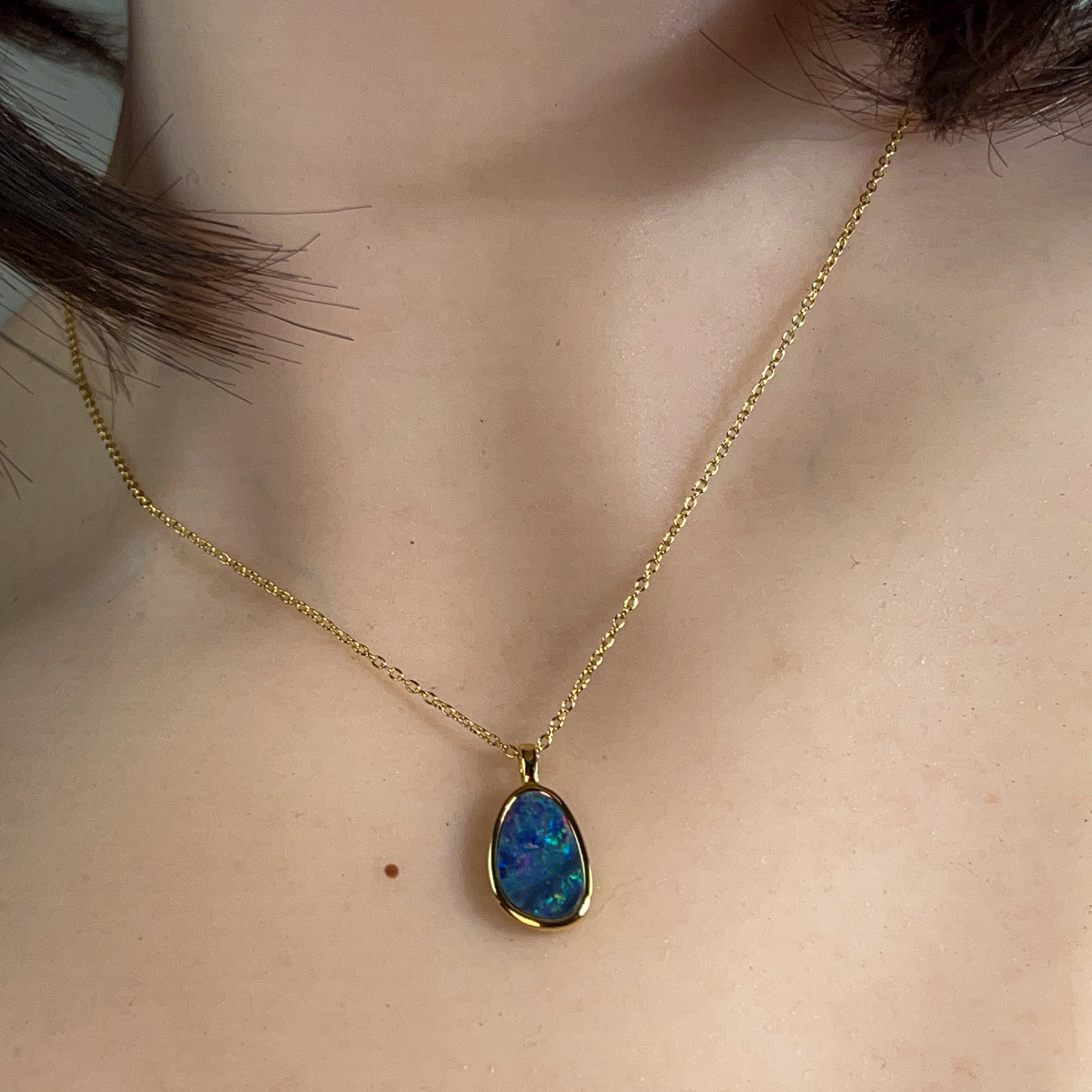 Delicate elegance meets timeless beauty with this exquisite opal doublet pendant. Crafted from quality silver and finished with luxurious gold plating, this 15x10mm piece captures the mesmerizing play of colour that opals are renowned for. The refined proportions make it perfect for layering or wearing solo, adding a touch of sophistication to any ensemble. Whether you're drawn to opals for their natural allure or seeking a meaningful gift, this dainty pendant delivers understated glamour that transcends trends.