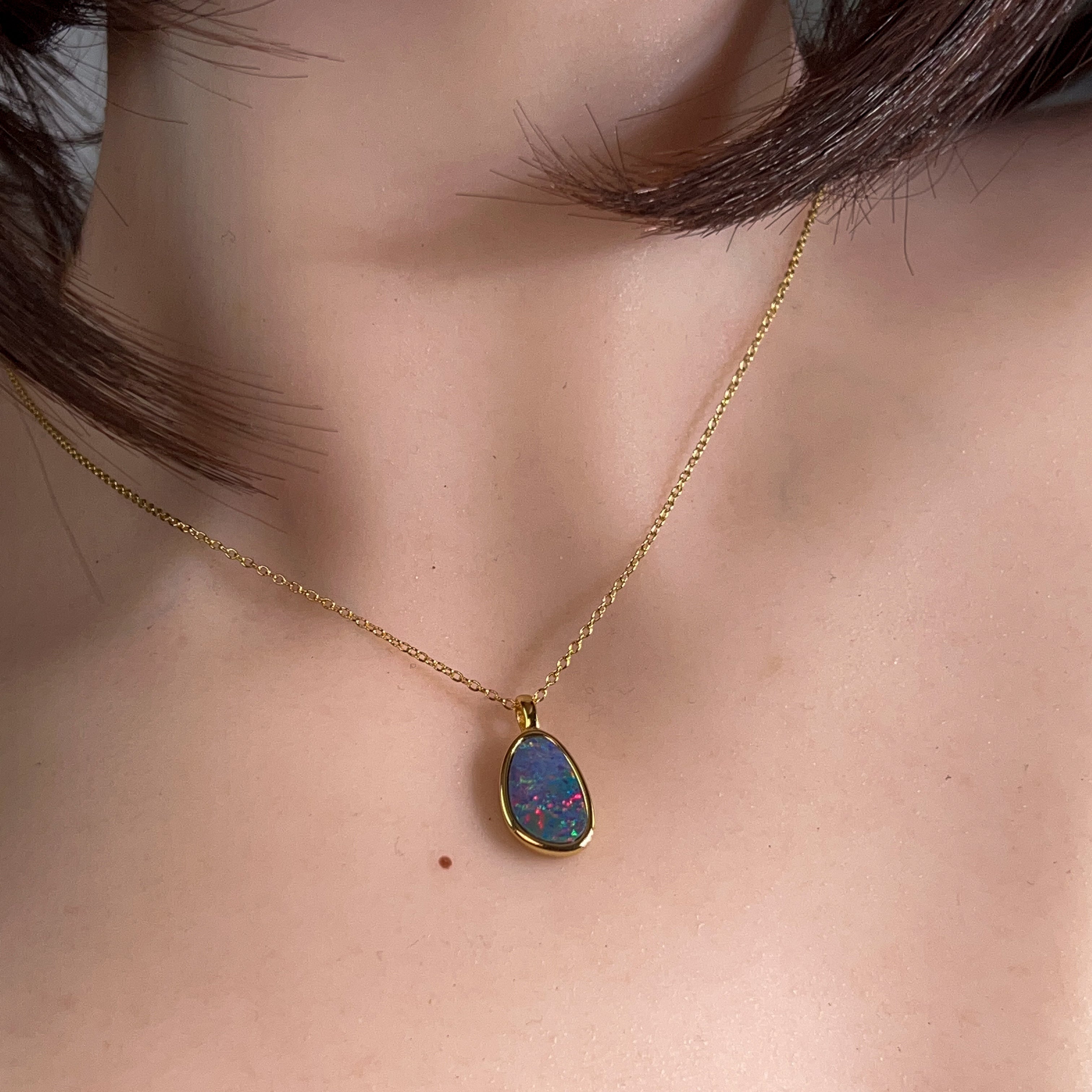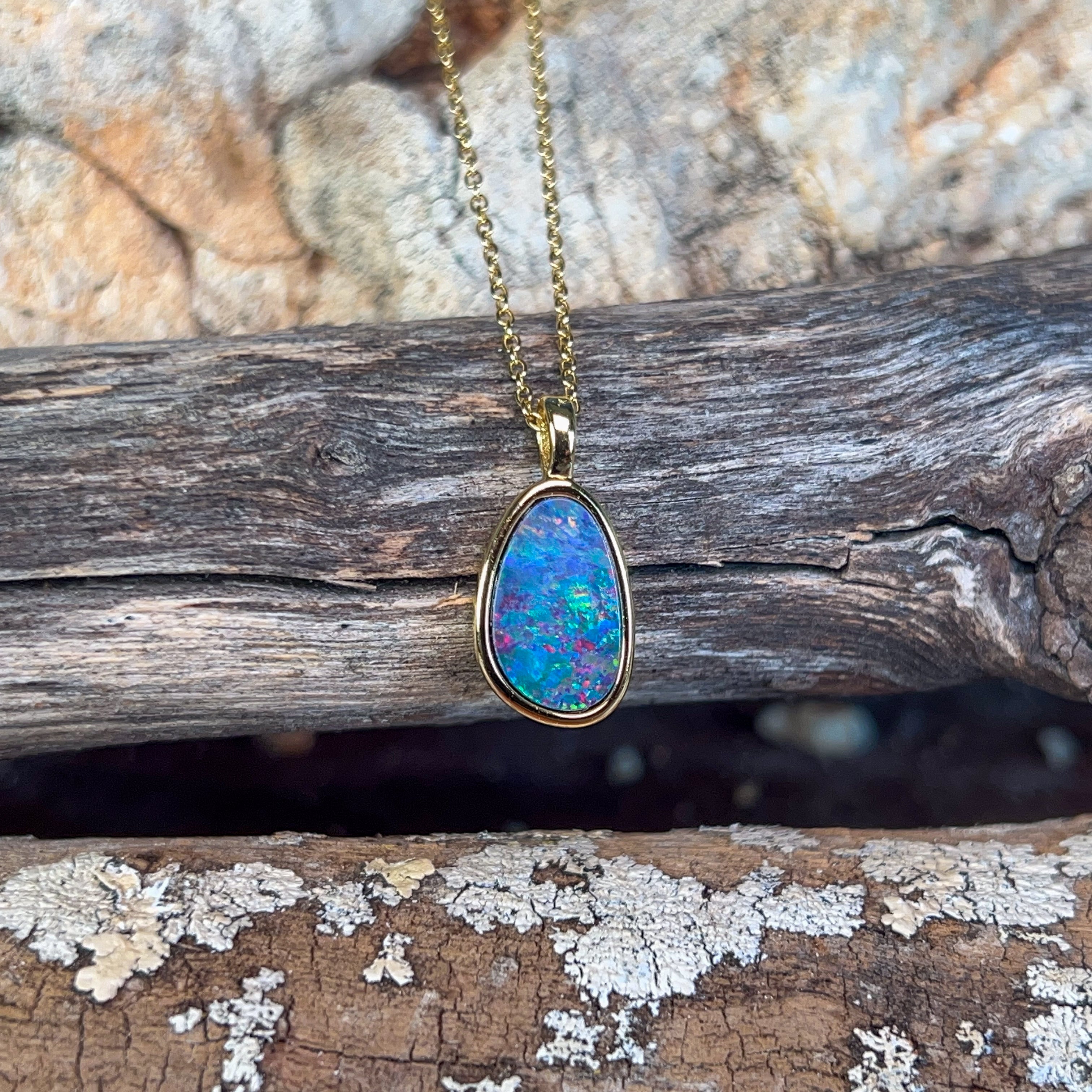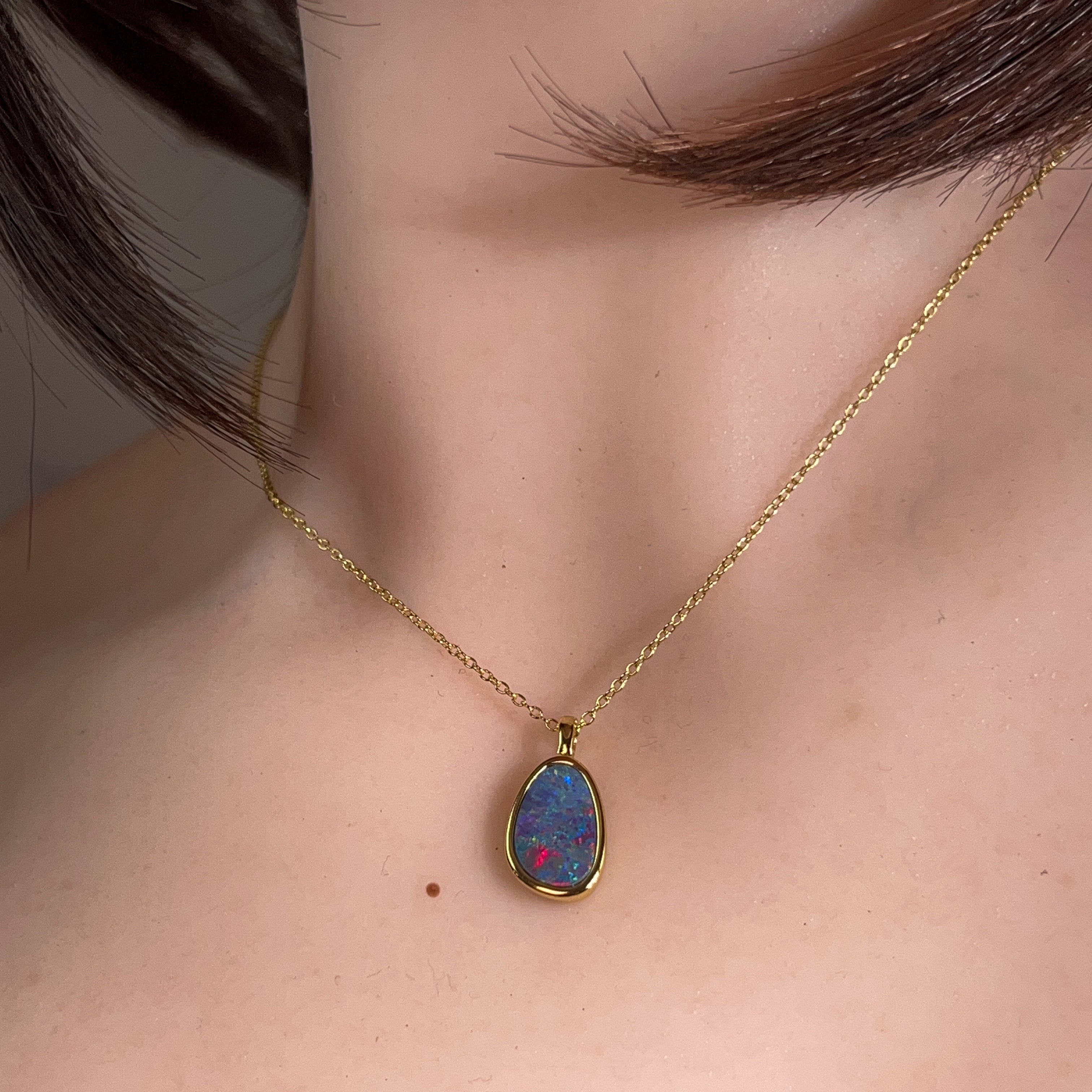 Catch the rainbow with this stunning gold-plated silver opal doublet pendant! Measuring 13x9mm, this little beauty bursts with vibrant, dancing colours that shift and shimmer with every movement. The playful interplay of brilliant hues makes it the perfect statement piece for anyone who loves to add a pop of personality to their jewellery collection. Whether you're dressing up or keeping it casual, this charming pendant brings instant joy and sparkle to your day.