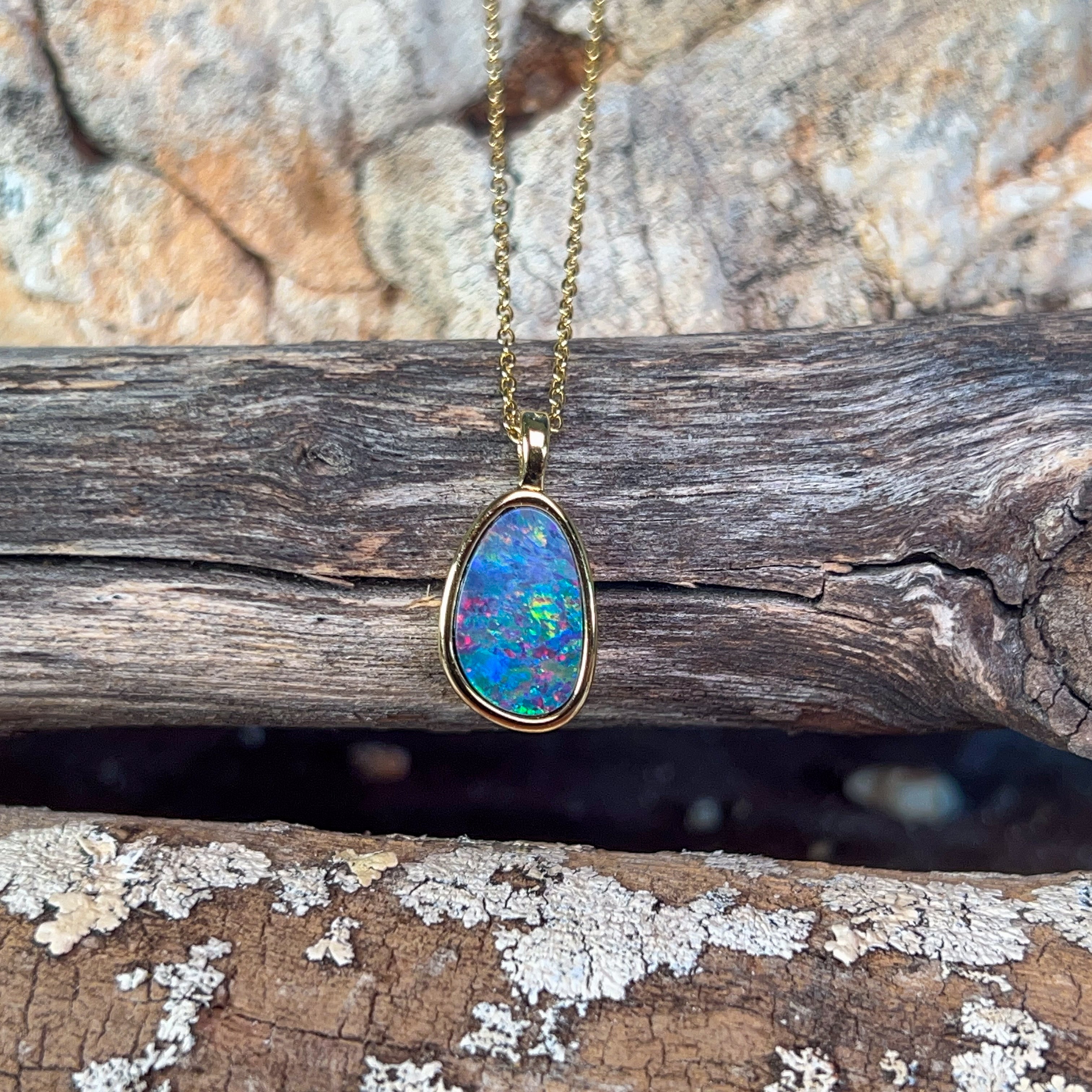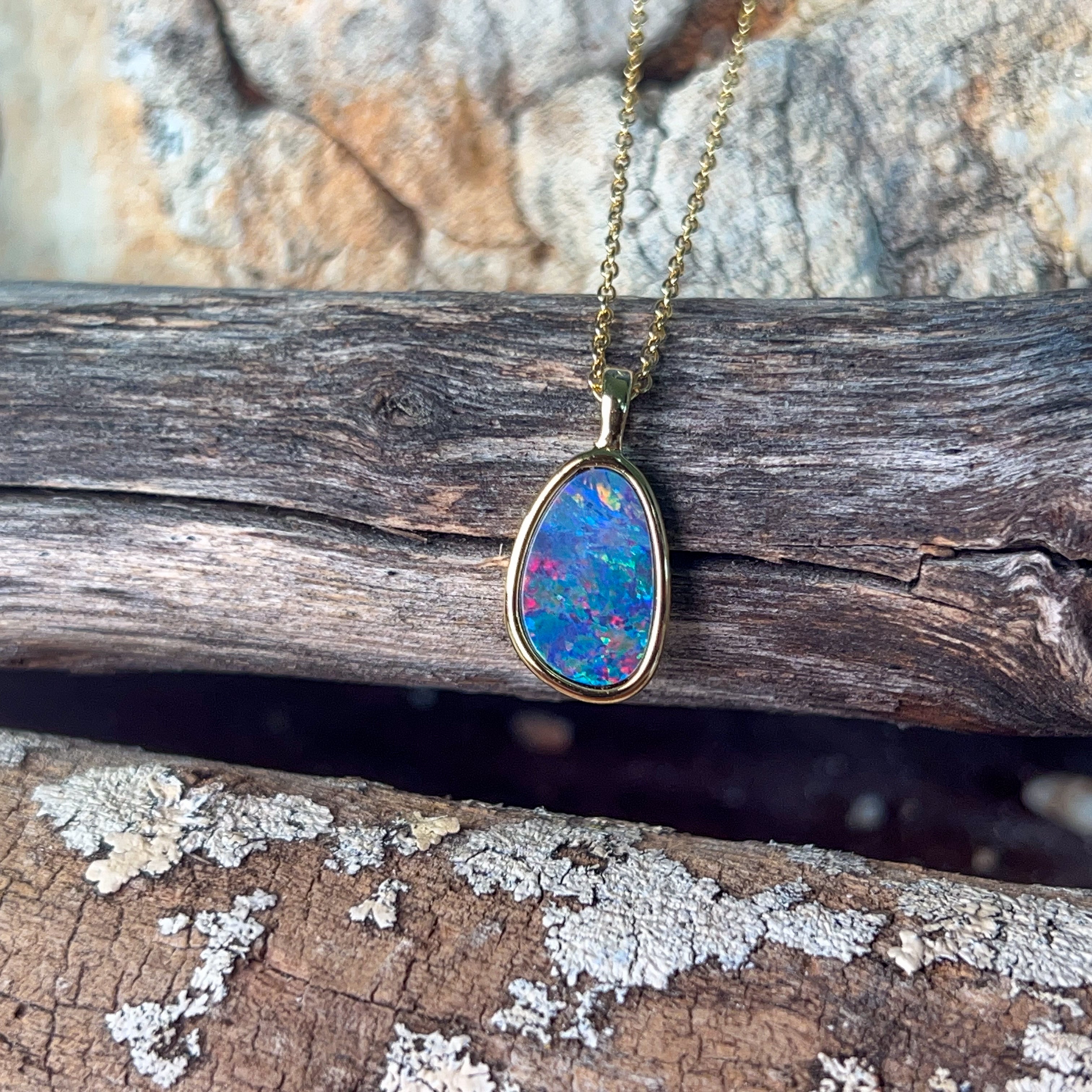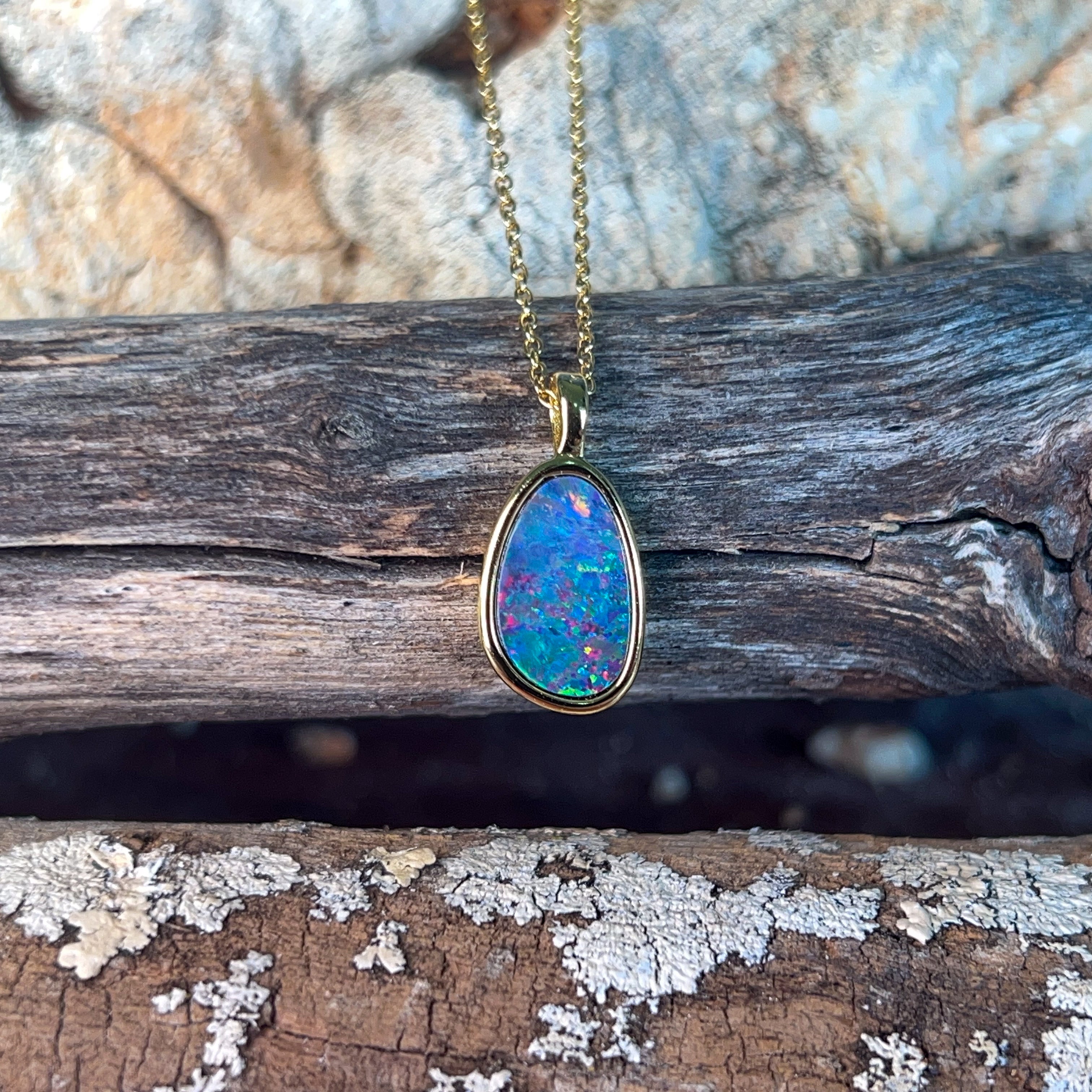 Catch the rainbow with this stunning gold-plated silver opal doublet pendant! Measuring 13x9mm, this little beauty bursts with vibrant, dancing colours that shift and shimmer with every movement. The playful interplay of brilliant hues makes it the perfect statement piece for anyone who loves to add a pop of personality to their jewellery collection. Whether you're dressing up or keeping it casual, this charming pendant brings instant joy and sparkle to your day.