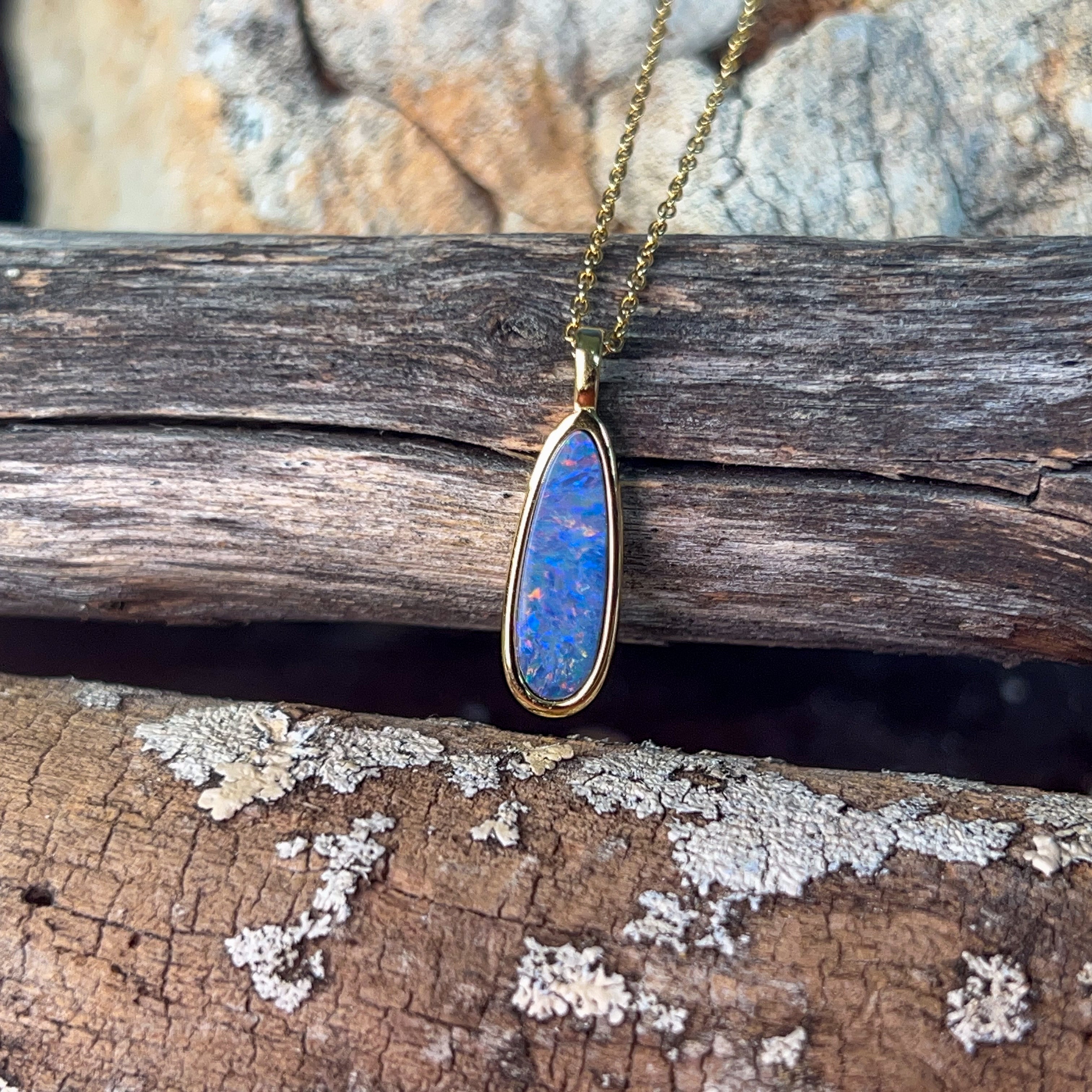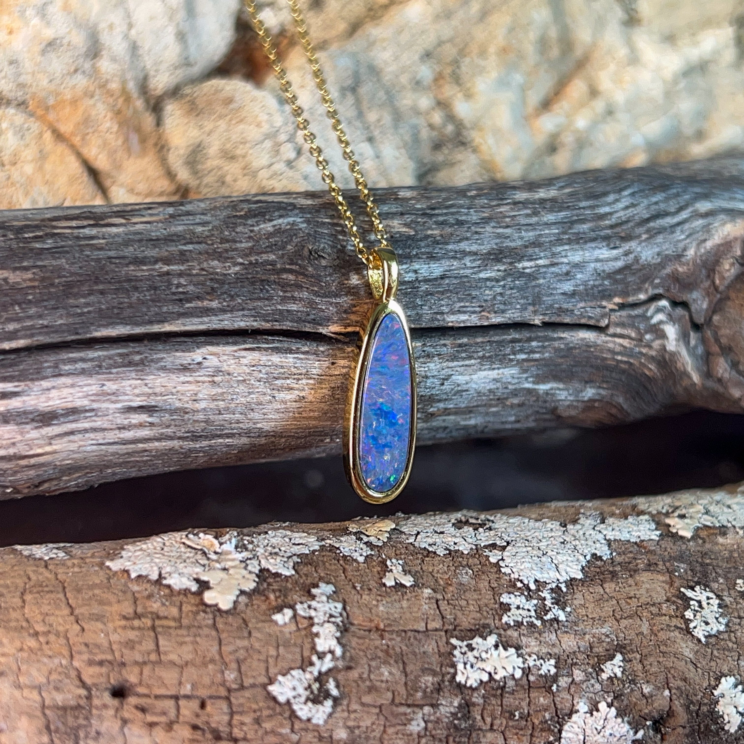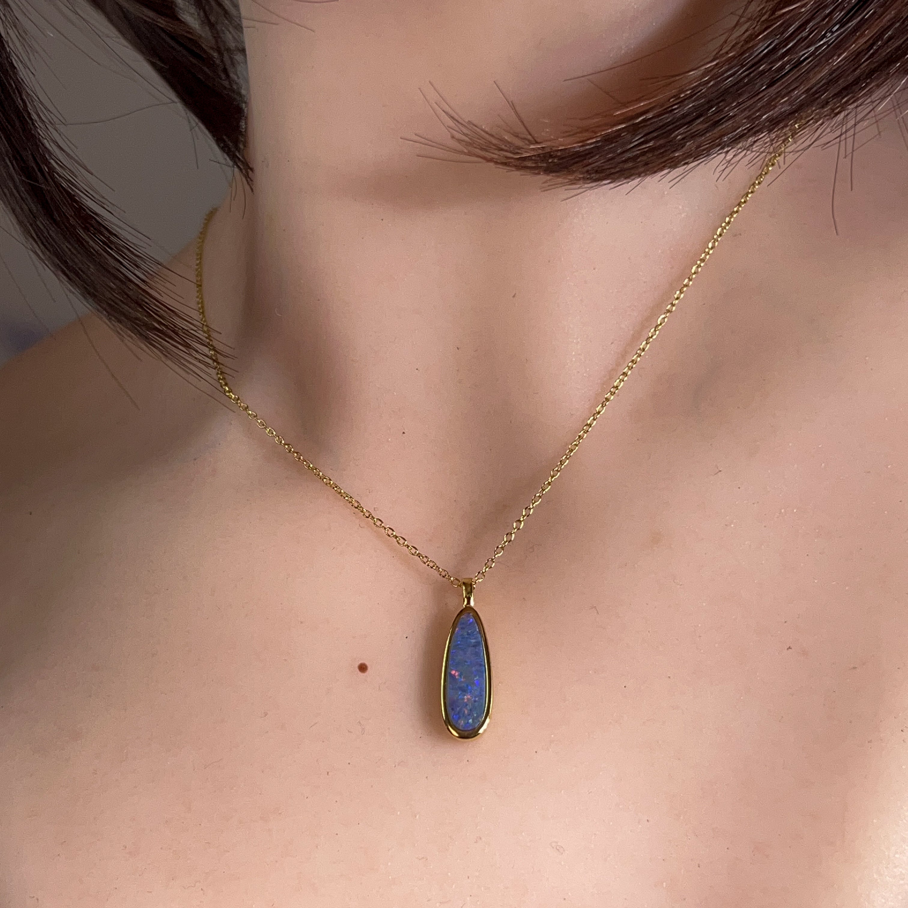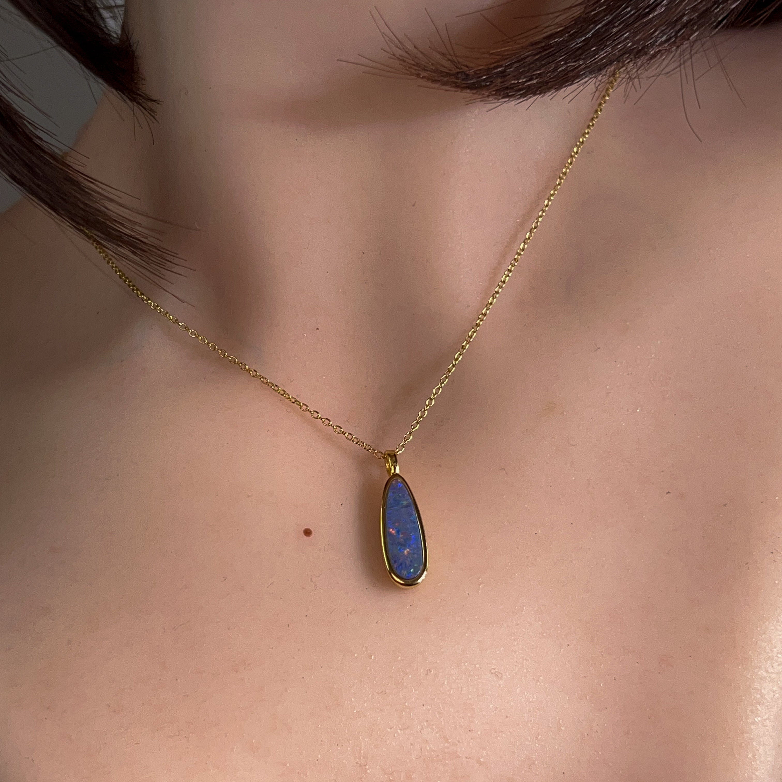 Elongated elegance meets understated charm with this sleek opal doublet pendant. Measuring a graceful 17x6mm, its slender silhouette drapes beautifully along the neckline, catching light with every movement. The opal's mesmerising play-of-colour dances across the surface, while the gold plating adds a warm, luxurious finish to the sterling silver base. Perfect for layering or wearing solo, this refined piece brings a touch of natural wonder to your everyday style. A modern take on timeless gemstone jewellery that whispers rather than shouts.