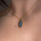 Dive into ocean-inspired elegance with this stunning gold-plated silver opal doublet pendant. Measuring 17x6mm, this petite treasure showcases mesmerizing green sea hues that dance with light, capturing the essence of coastal beauty. The doublet construction offers brilliant colour play while the precious metal plating adds a touch of luxury. Perfect for layering or wearing solo, this pendant brings a splash of aquatic charm to any jewellery collection. Let the waves of colour transport you to seaside serenity.
