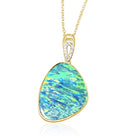Adorn yourself with this sublimely elegant pendant, crafted of 14kt yellow gold and adorned with a stunningly beautiful opal doublet featuring vibrant stripes of captivating blue, green and yellow hues. Adding a touch of understated elegance, a delicate diamond-studded bail loop sparkles with graceful sophistication. A timeless classic for any jewelry collection.