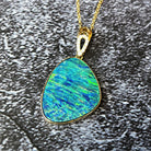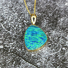One 14kt Yellow gold pendant set with one Freeform South Australian Opal stripe pattern doublet weighing 9.87ct bezel set with 12 Round Brilliant cut diamonds weighing 0.1ct, colour G, clarity VS-SI pave set loop.Weight of item = 4.01g
