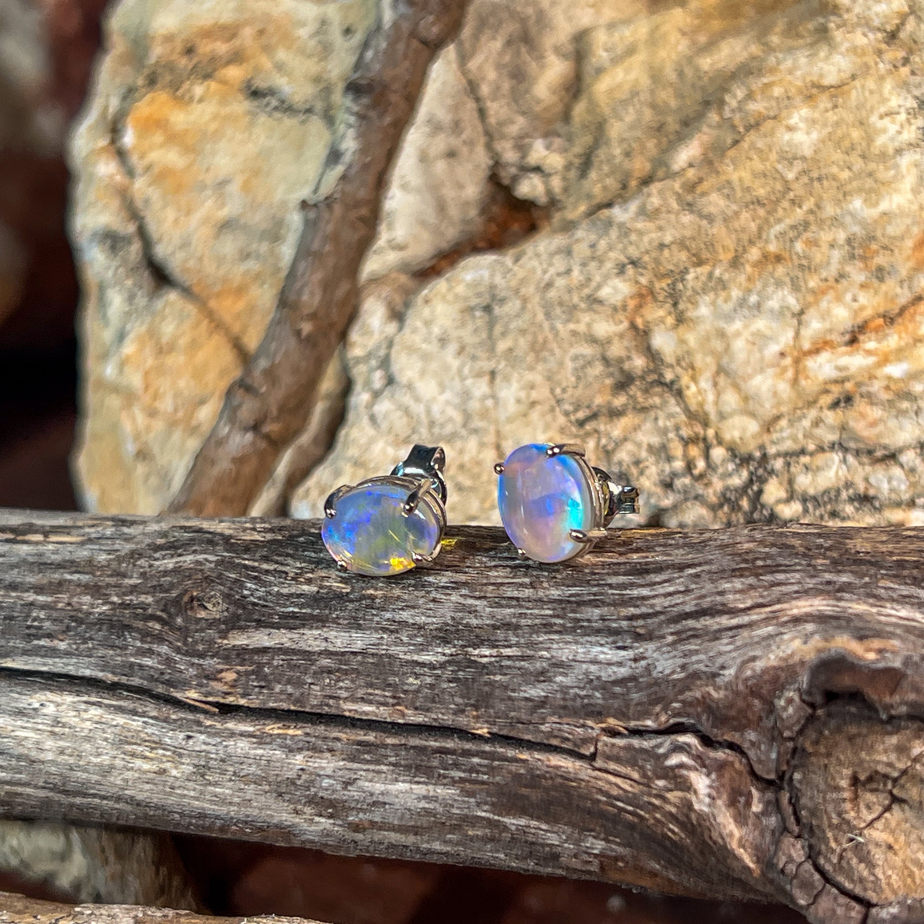 Experience the allure of natural beauty with this pair of sterling silver claw-set black opal stud earrings, featuring 2.37 carats of untreated blue-green opals. Each stone showcases unique play-of-color and depth, highlighting the opal’s pure, unaltered essence. Perfectly crafted for elegance and everyday sophistication, these earrings offer a timeless addition to your collection.