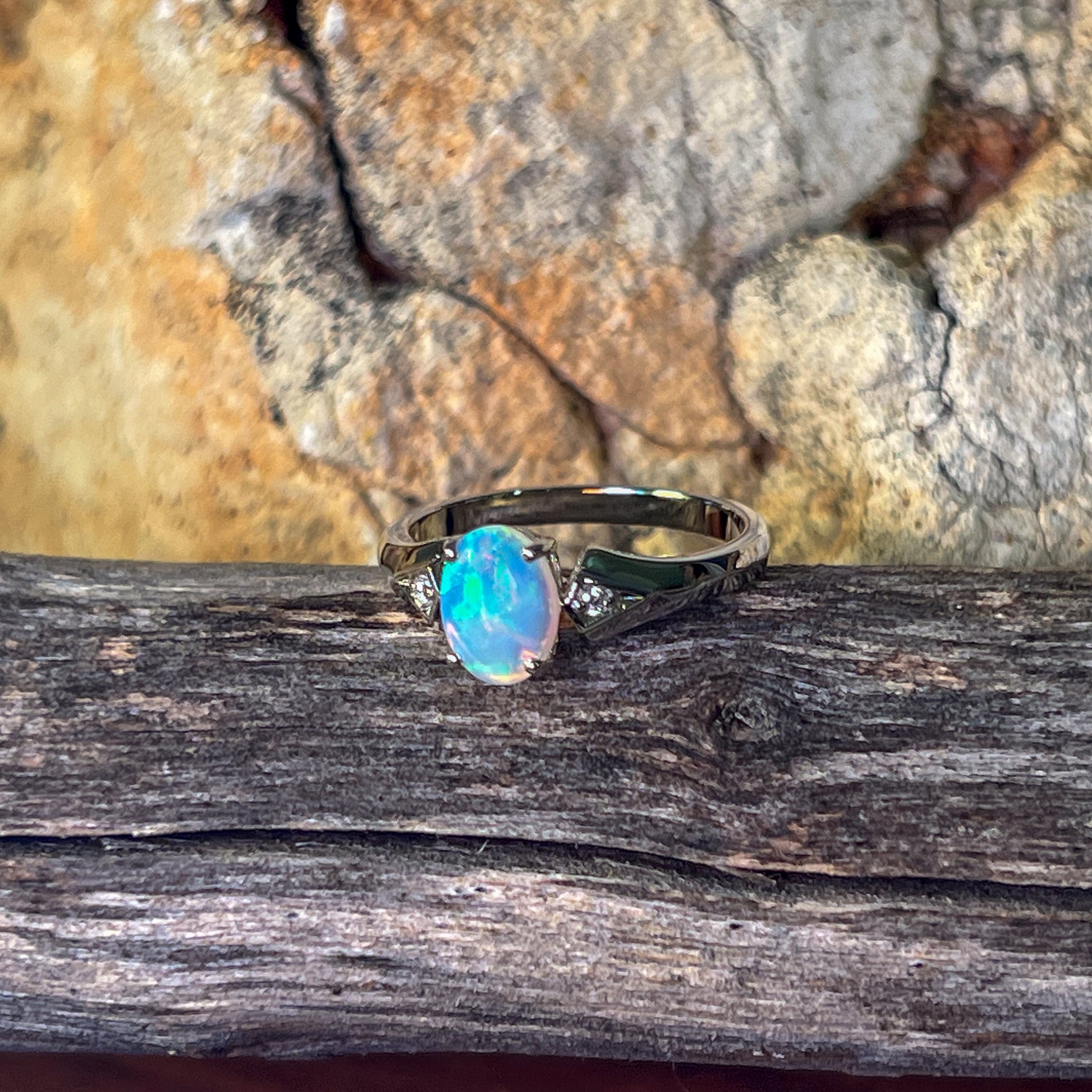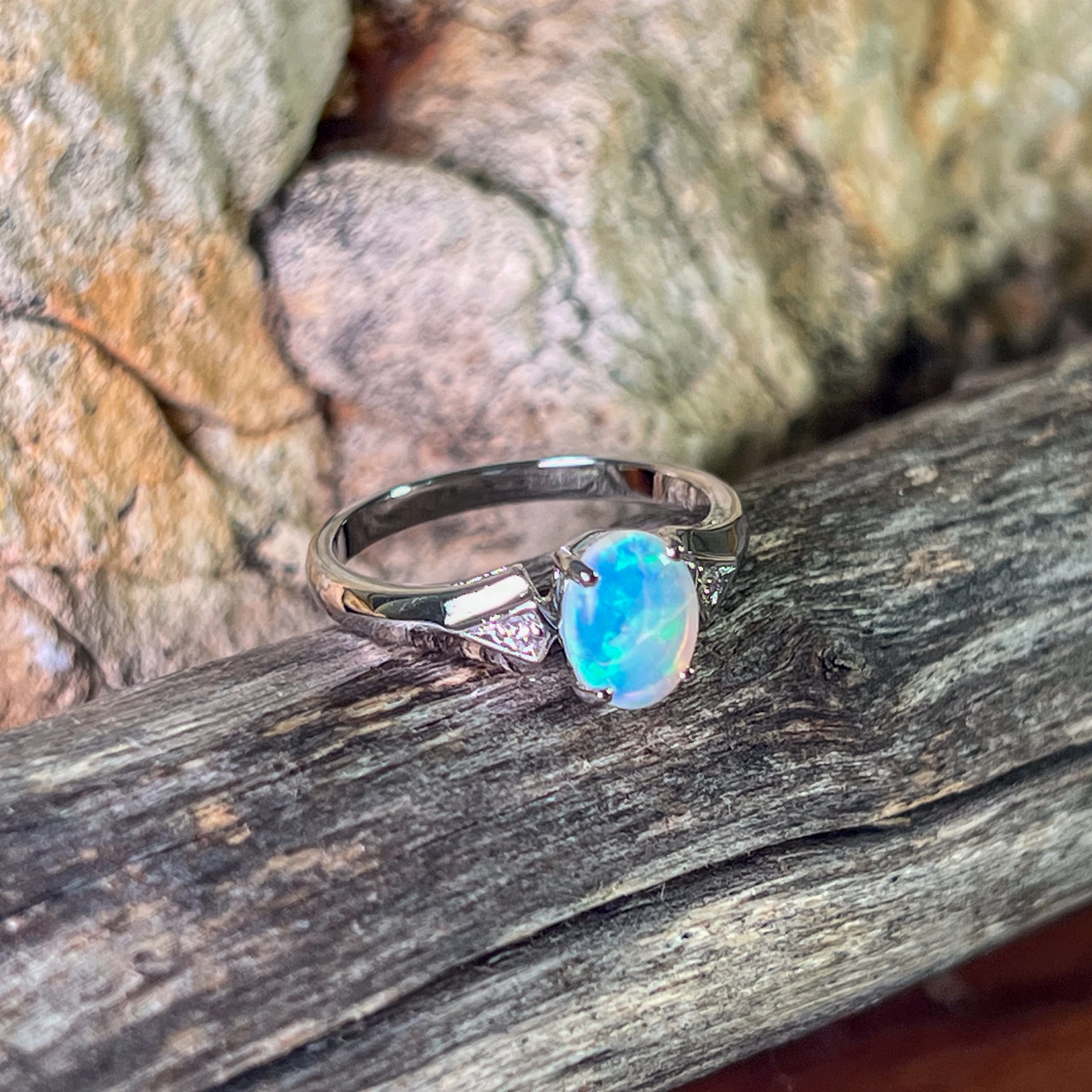 One Sterling Silver 8x6mm Light Opal and side cz ring