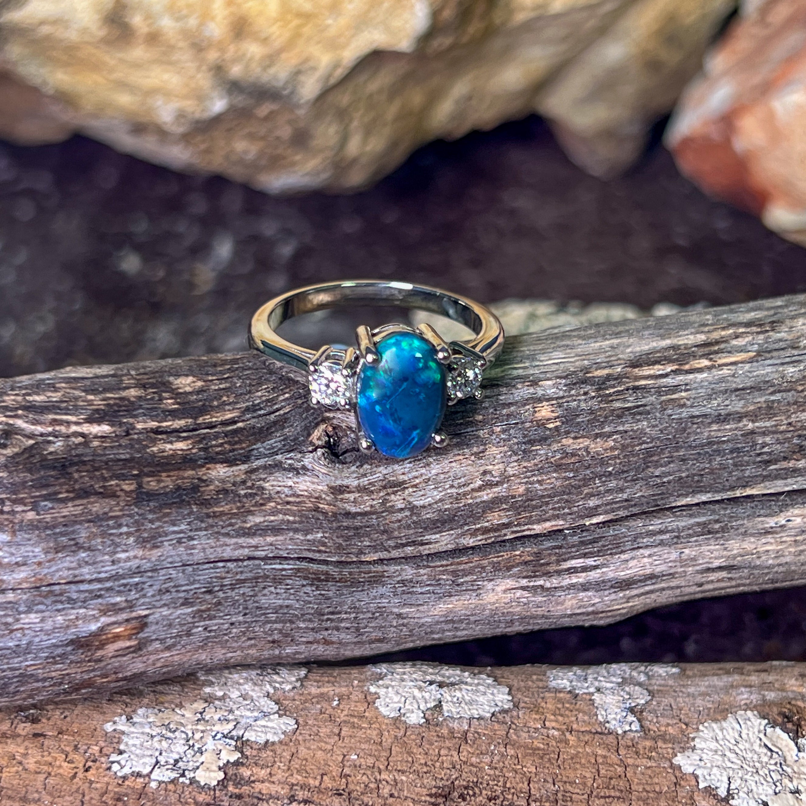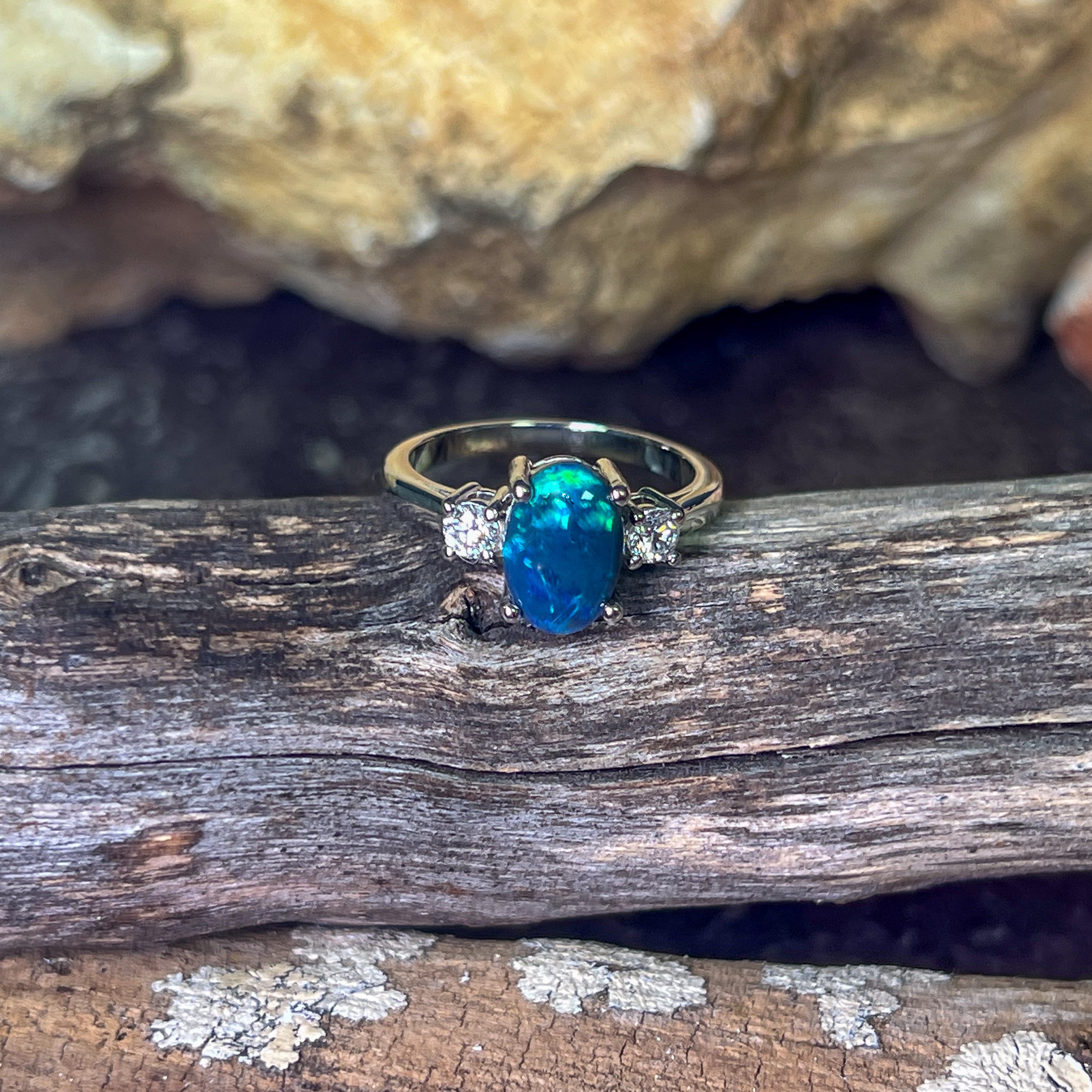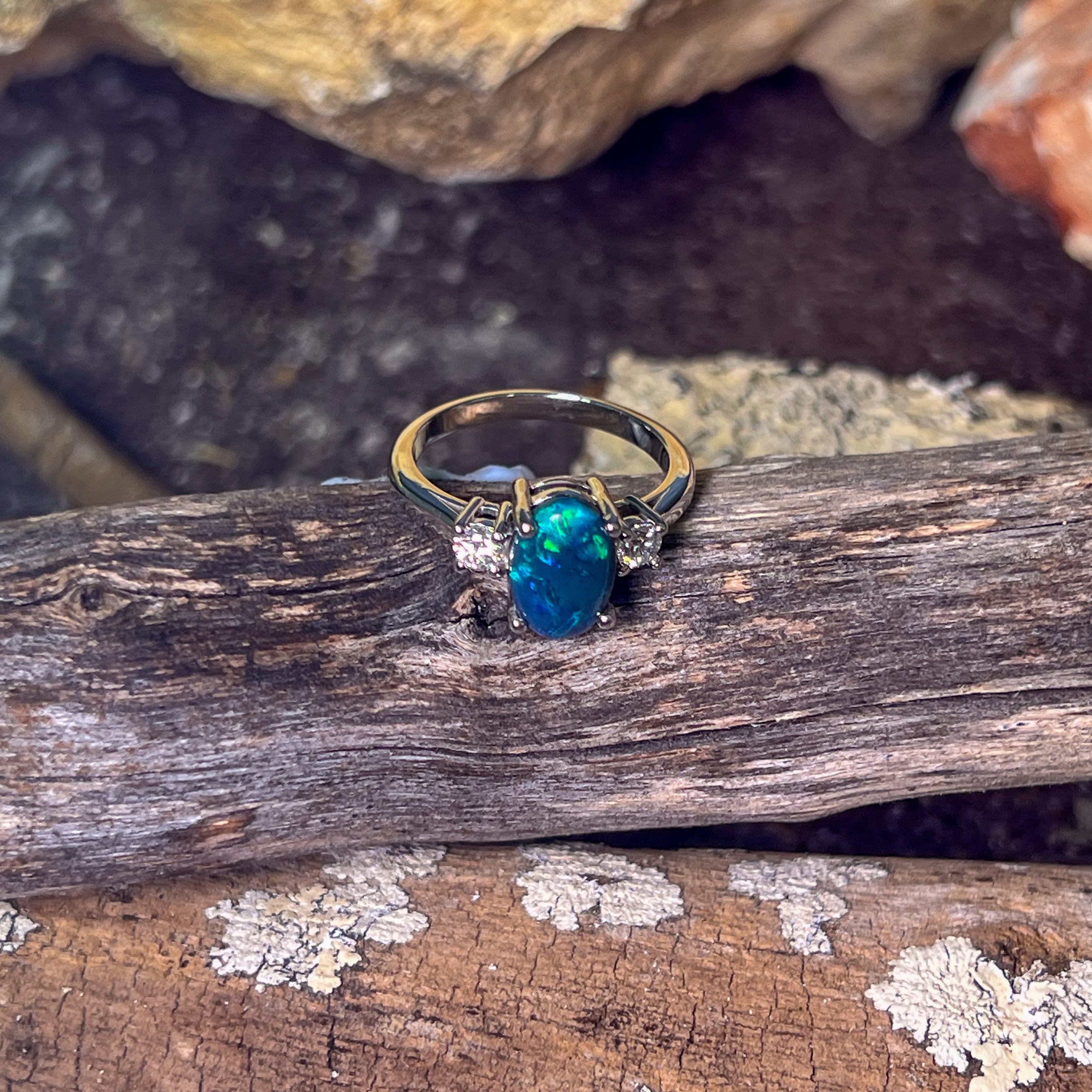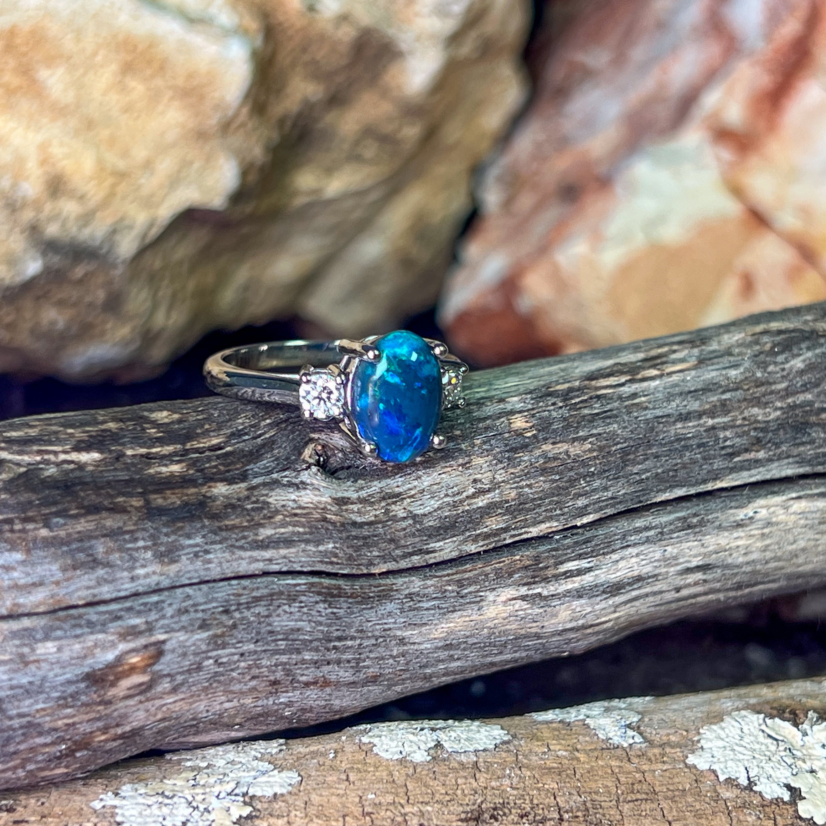 Experience the luxury and opulence of our Platinum Black Opal and Diamond trilogy ring. Featuring a stunning deep ocean Blue opal, this trilogy design will take your breath away. Elevate your engagement with a touch of elegance.