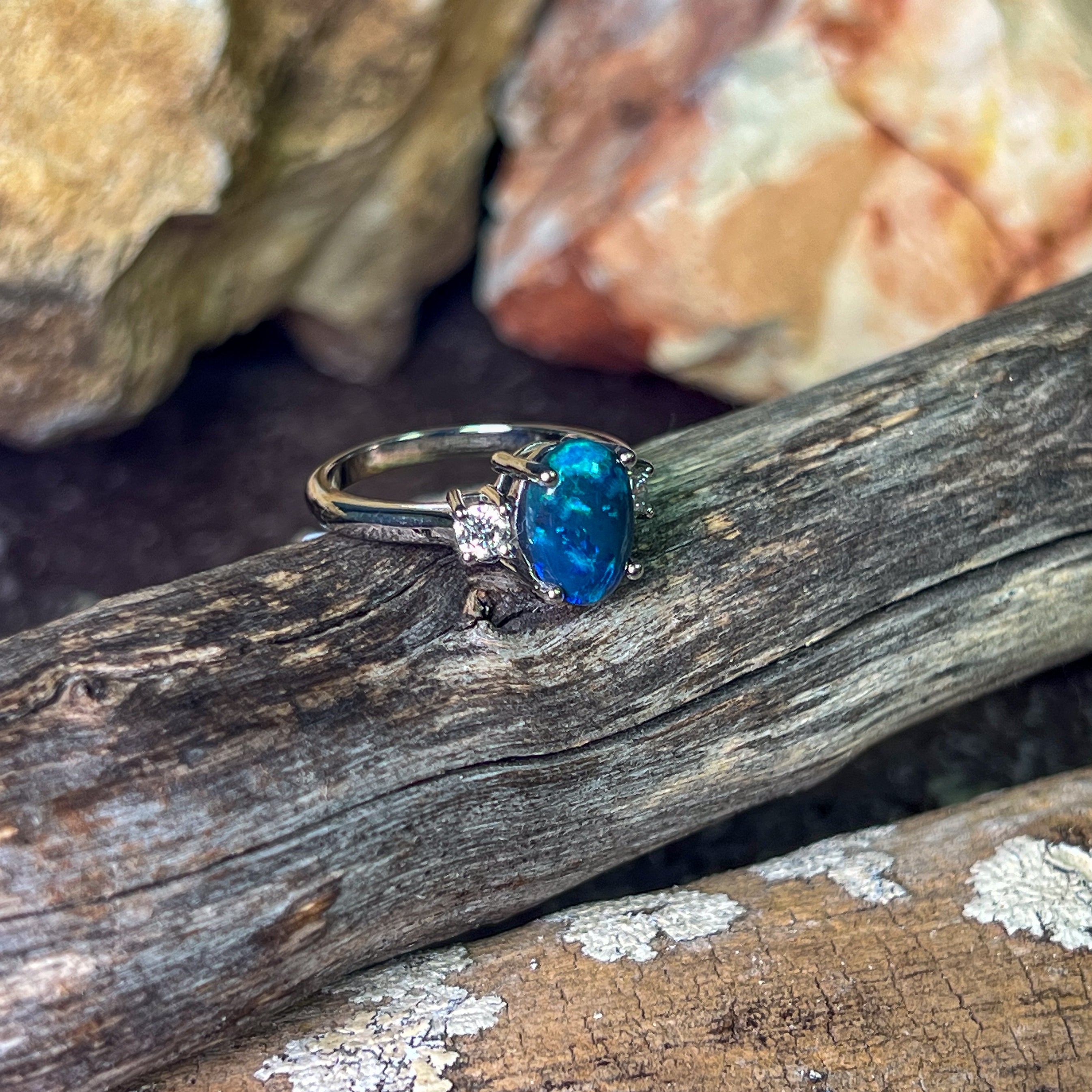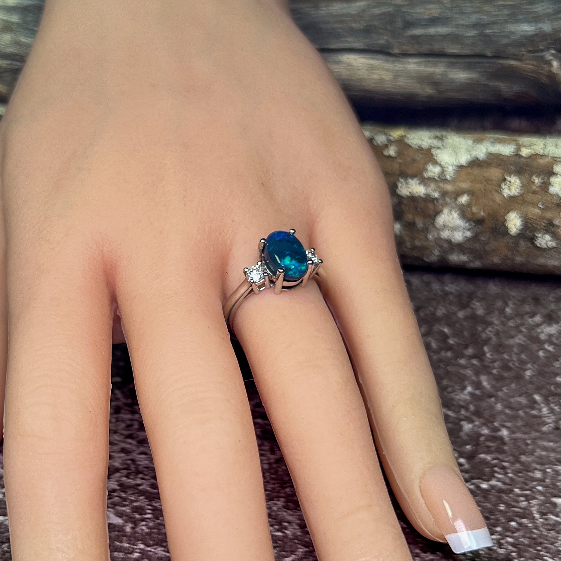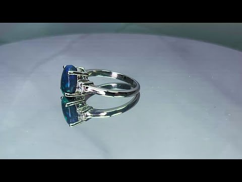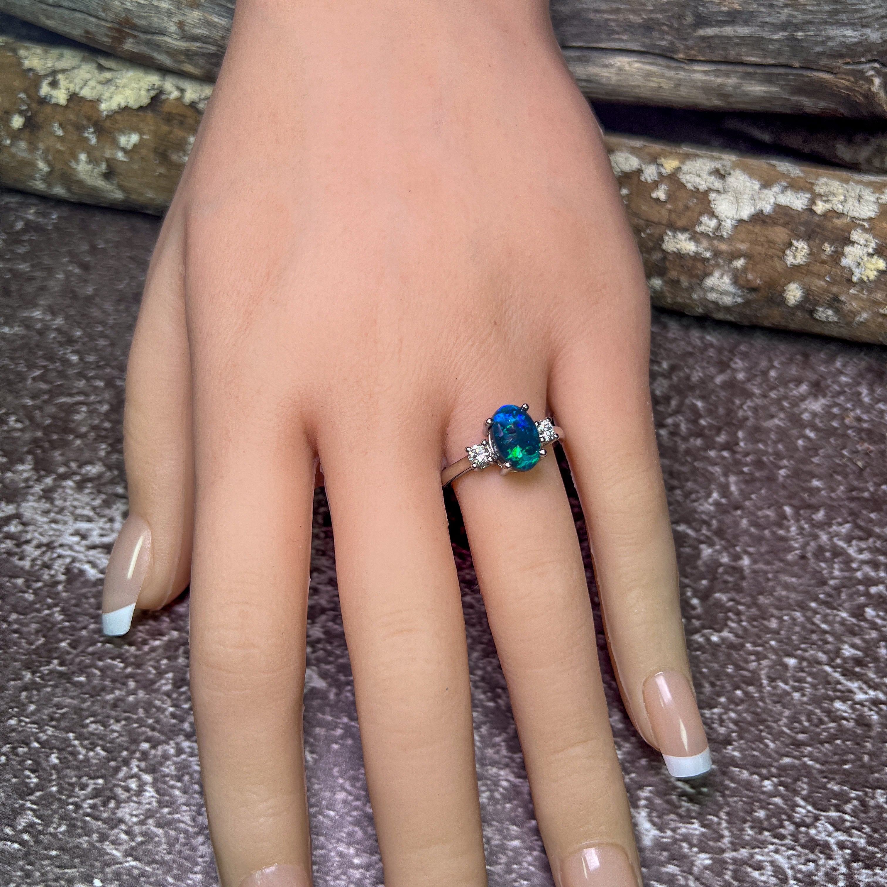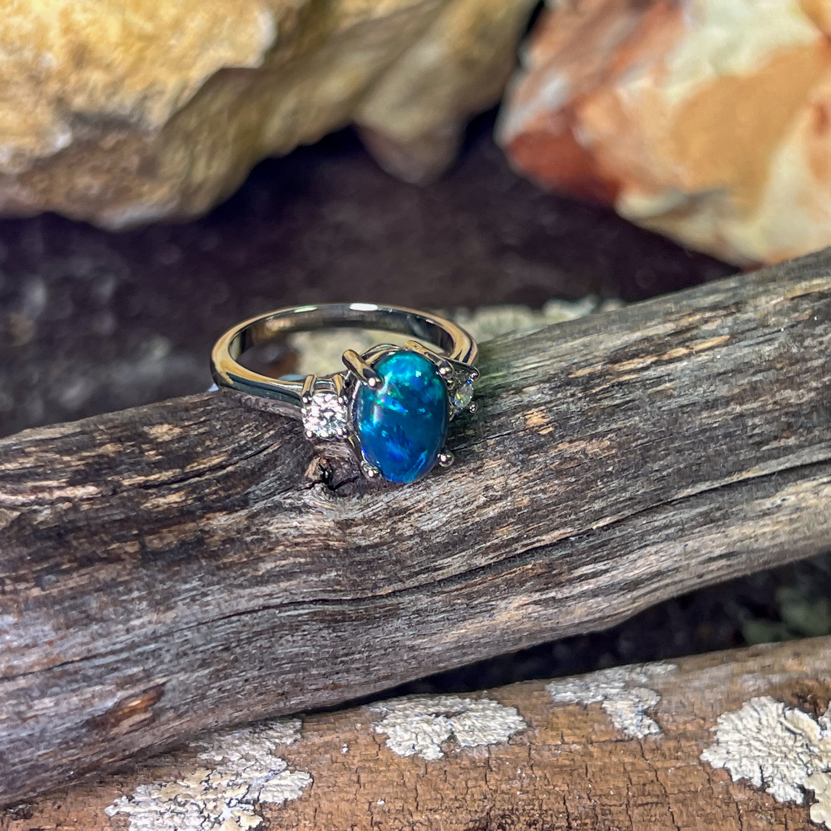 Experience the luxury and opulence of our Platinum Black Opal and Diamond trilogy ring. Featuring a stunning deep ocean Blue opal, this trilogy design will take your breath away. Elevate your engagement with a touch of elegance.