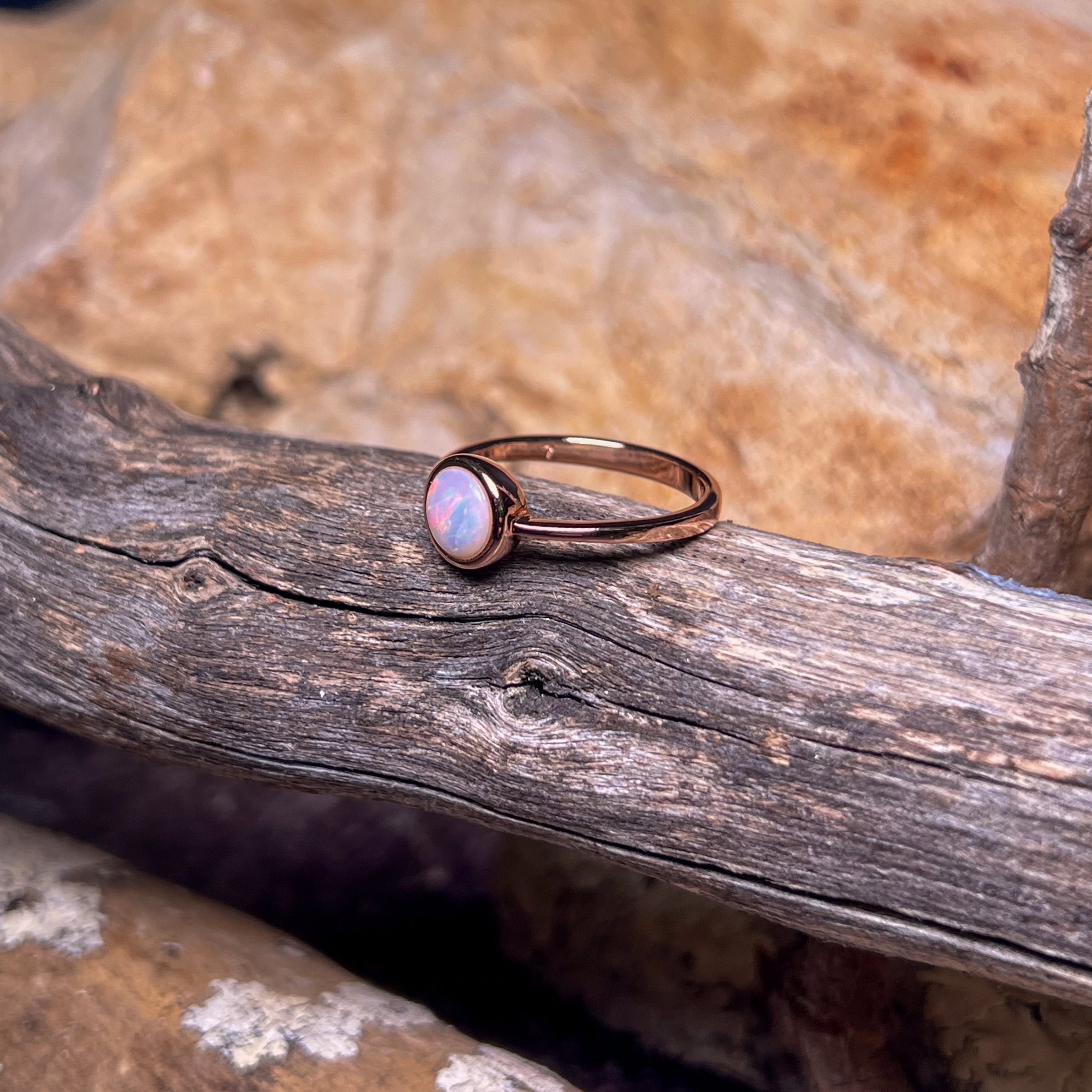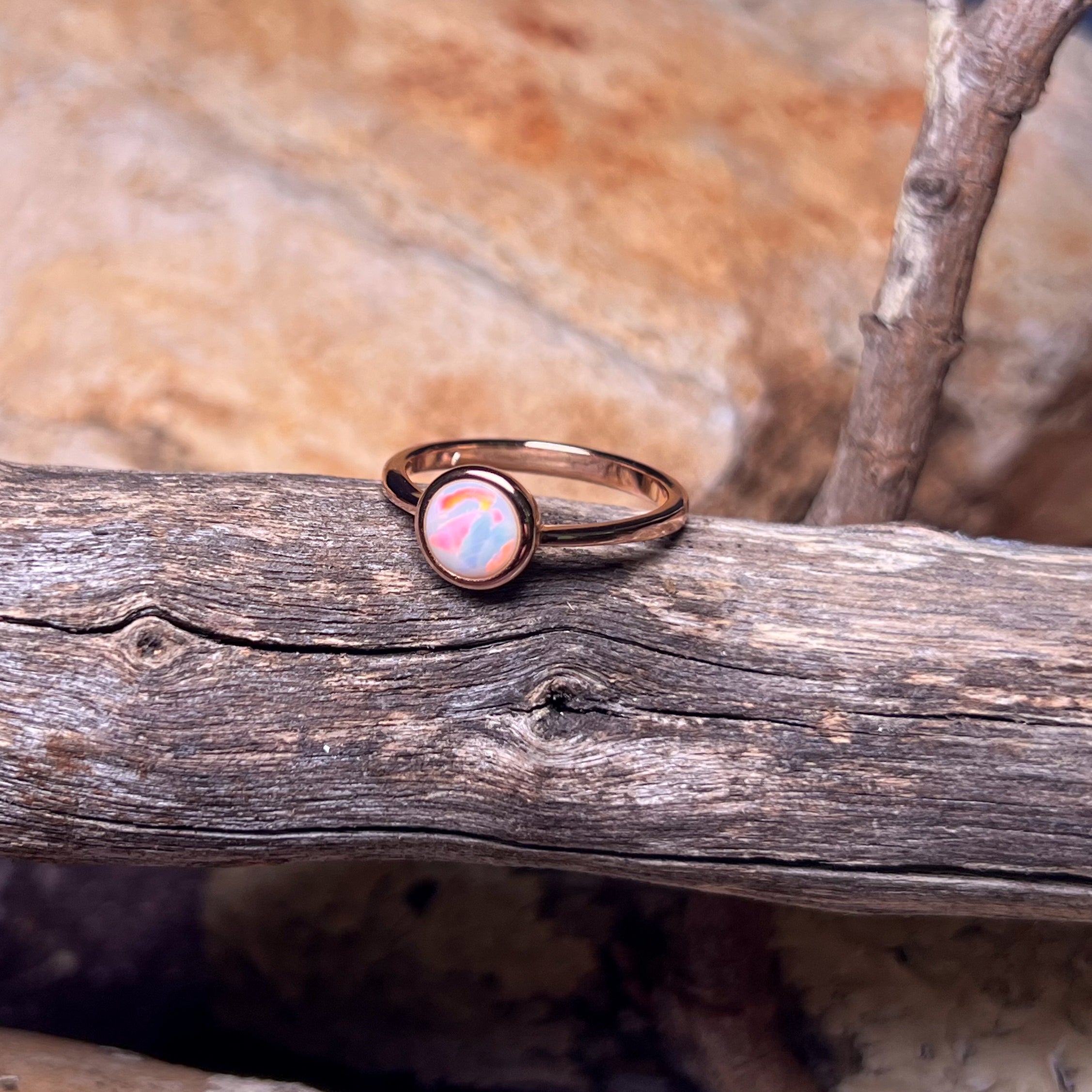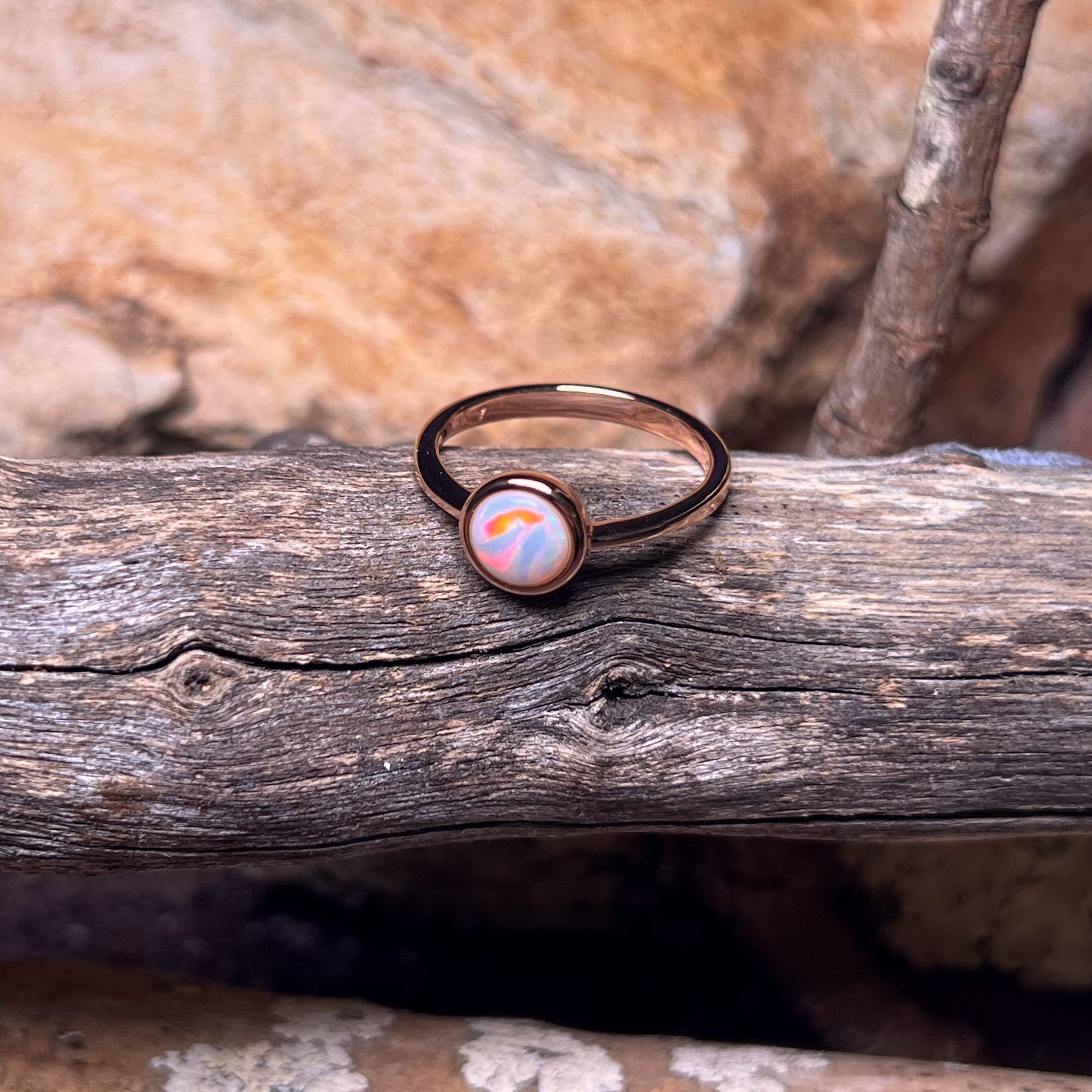 Indulge in elegant simplicity with our Rose Gold Plated 7mm White Opal solitaire ring. Its minimalist design showcases a mesmerizing opal stone, creating a luxurious and timeless look. Elevate your style and add a touch of sophistication with this exquisite piece.
