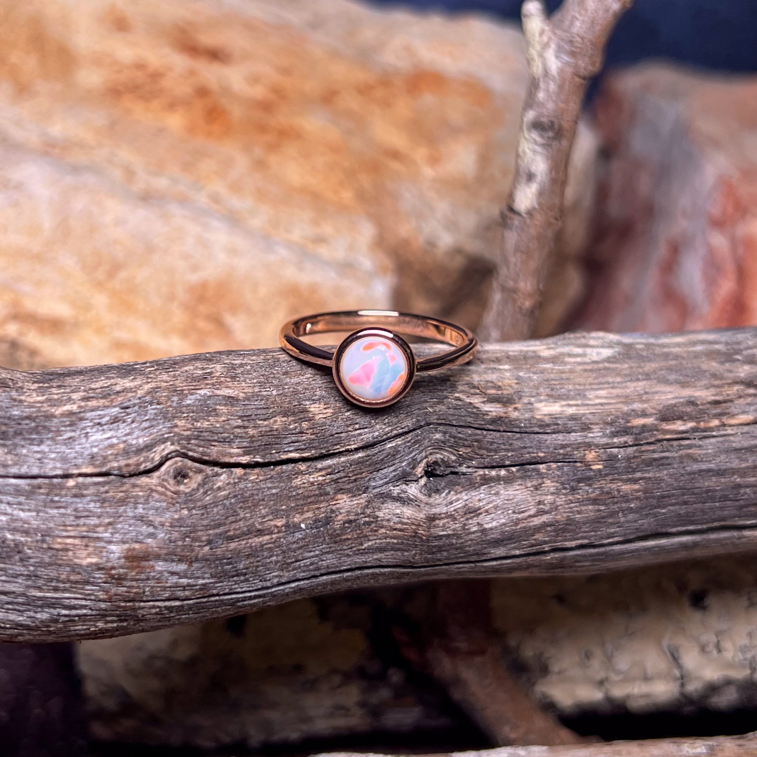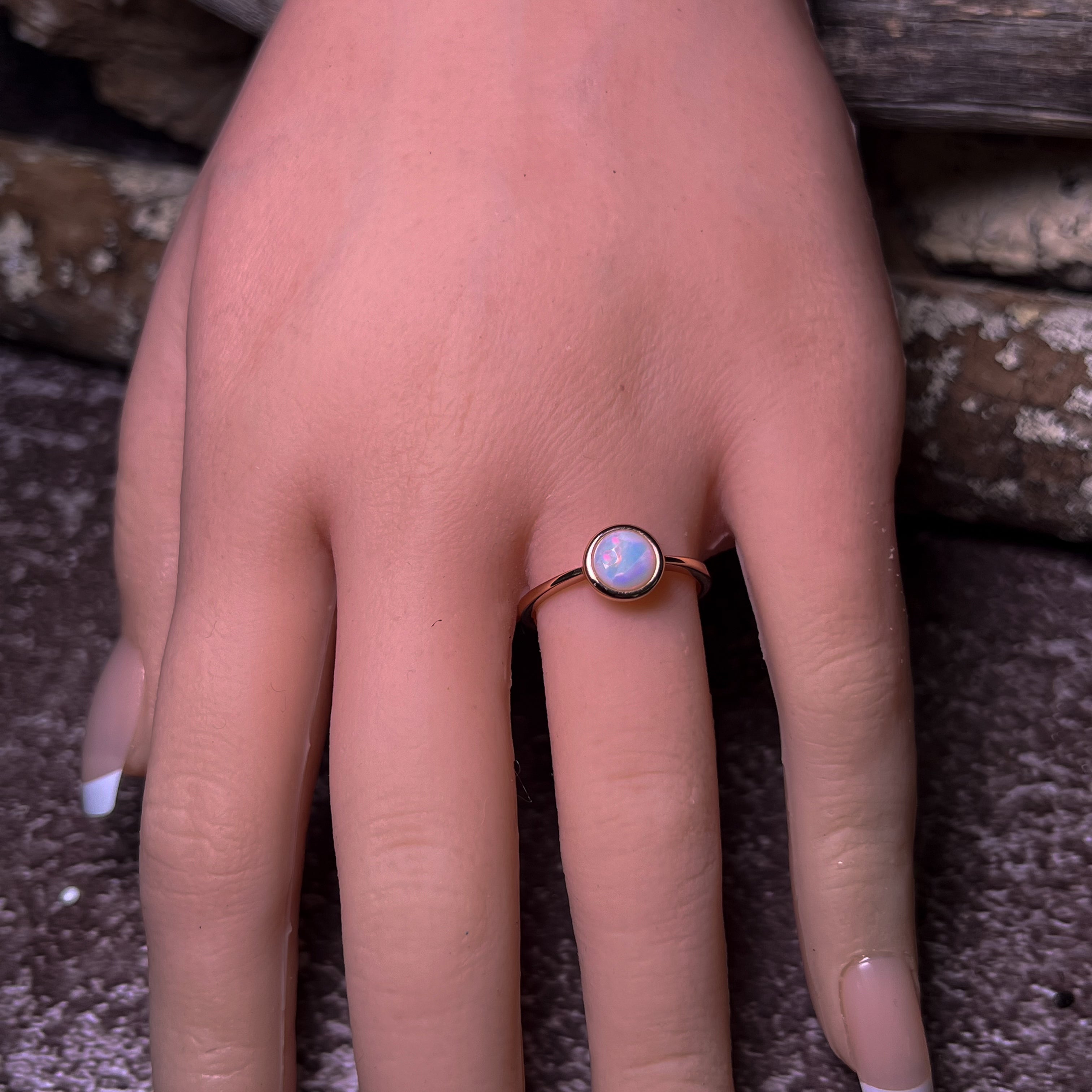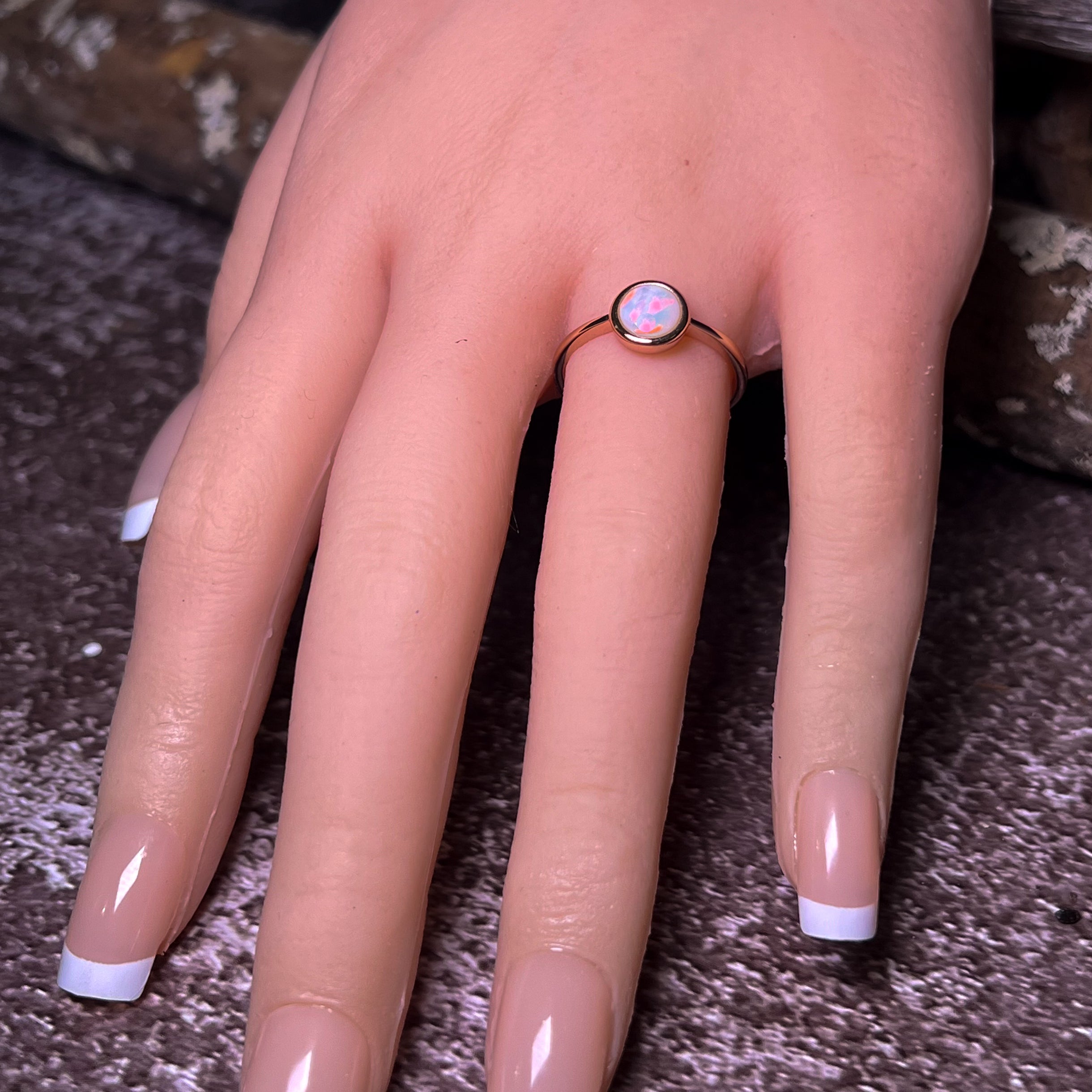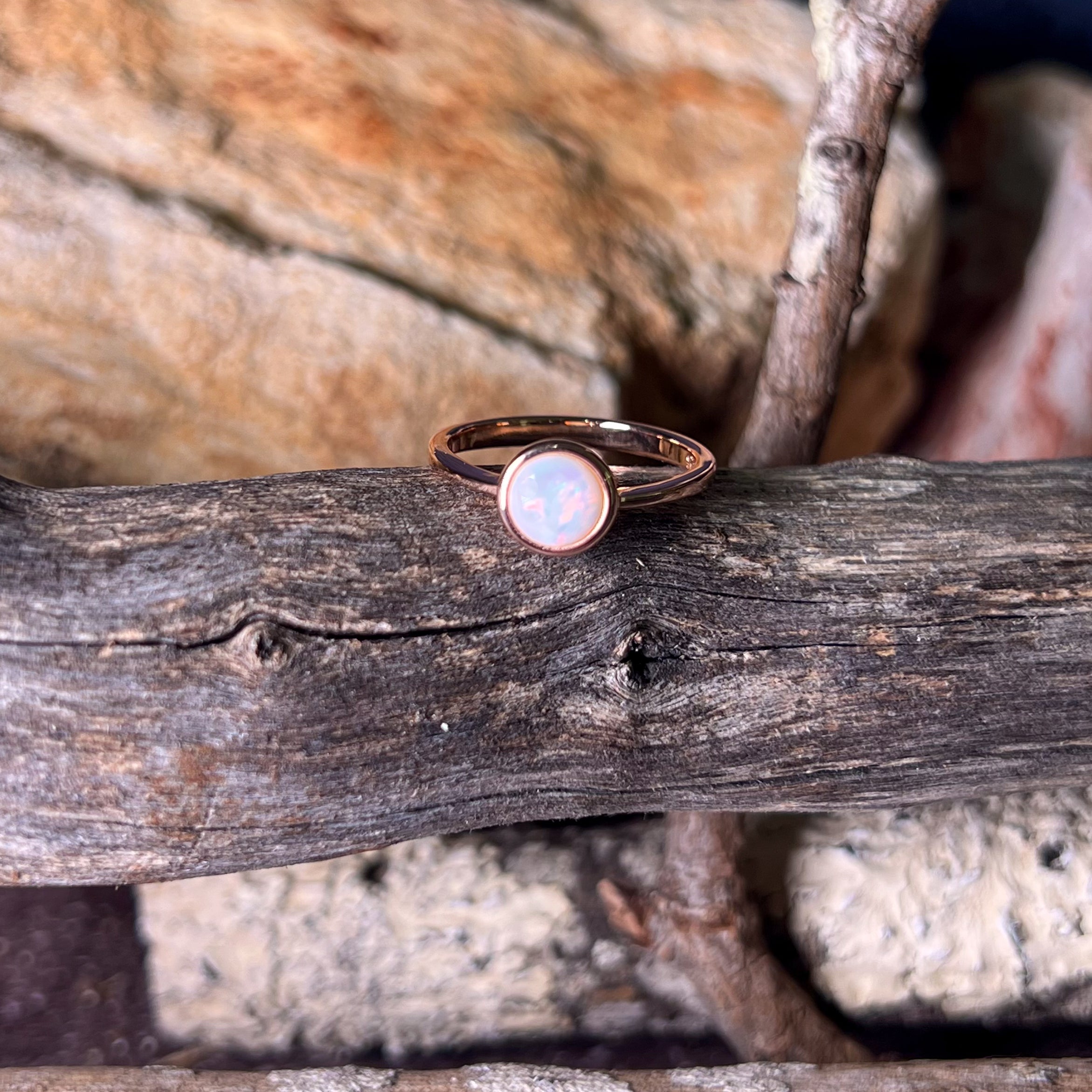 Indulge in elegant simplicity with our Rose Gold Plated 7mm White Opal solitaire ring. Its minimalist design showcases a mesmerizing opal stone, creating a luxurious and timeless look. Elevate your style and add a touch of sophistication with this exquisite piece.
