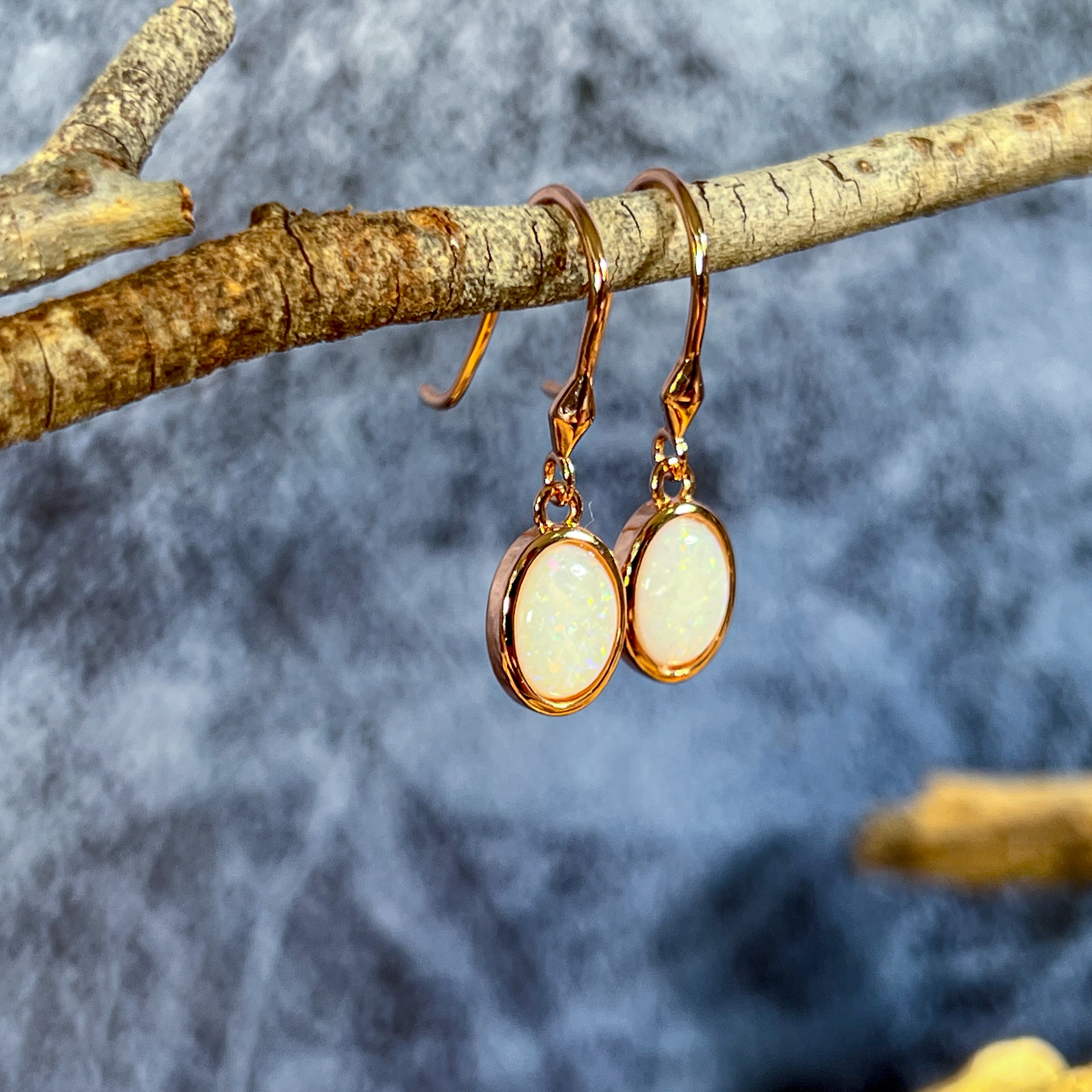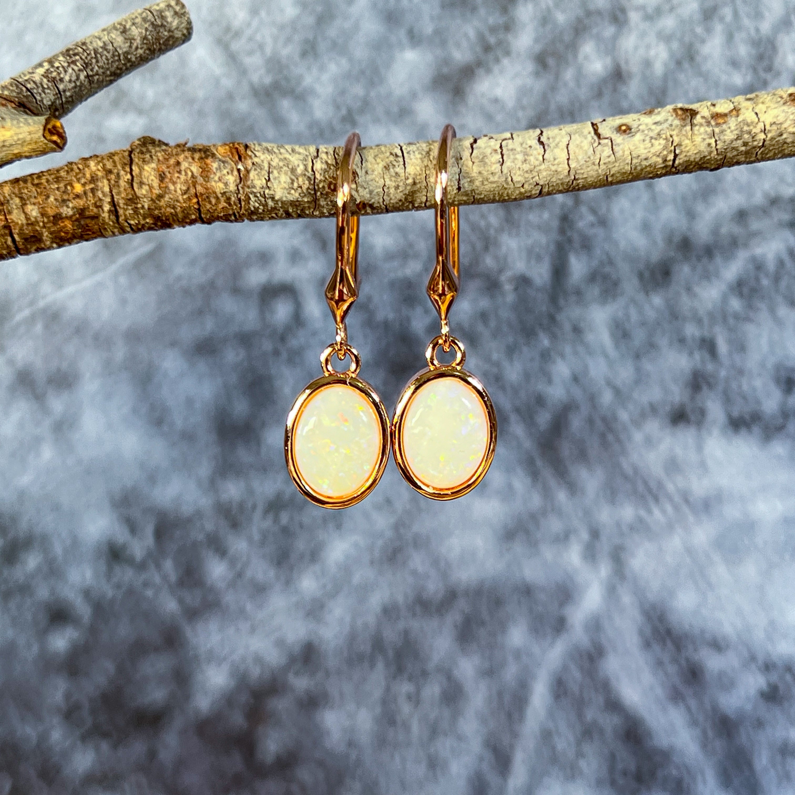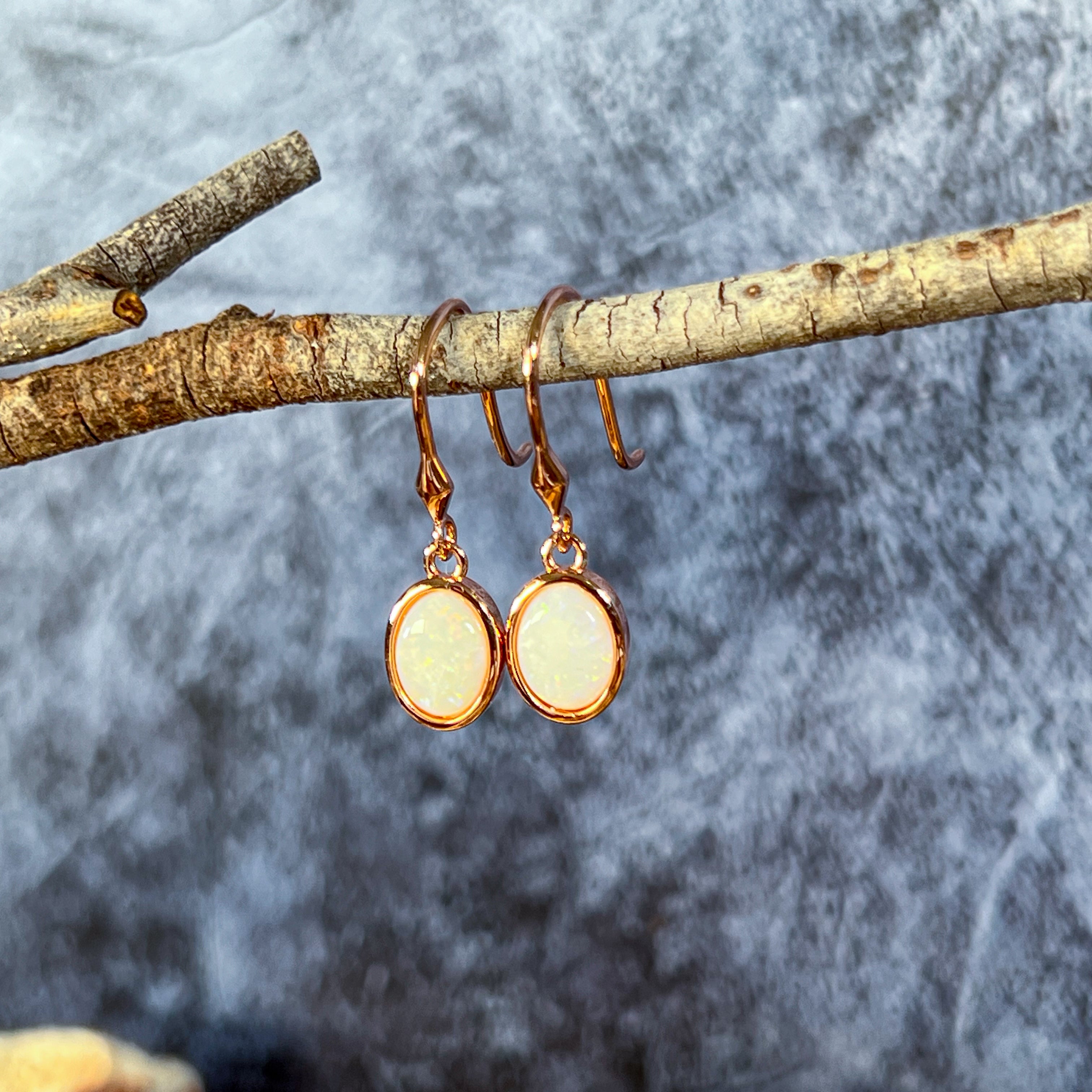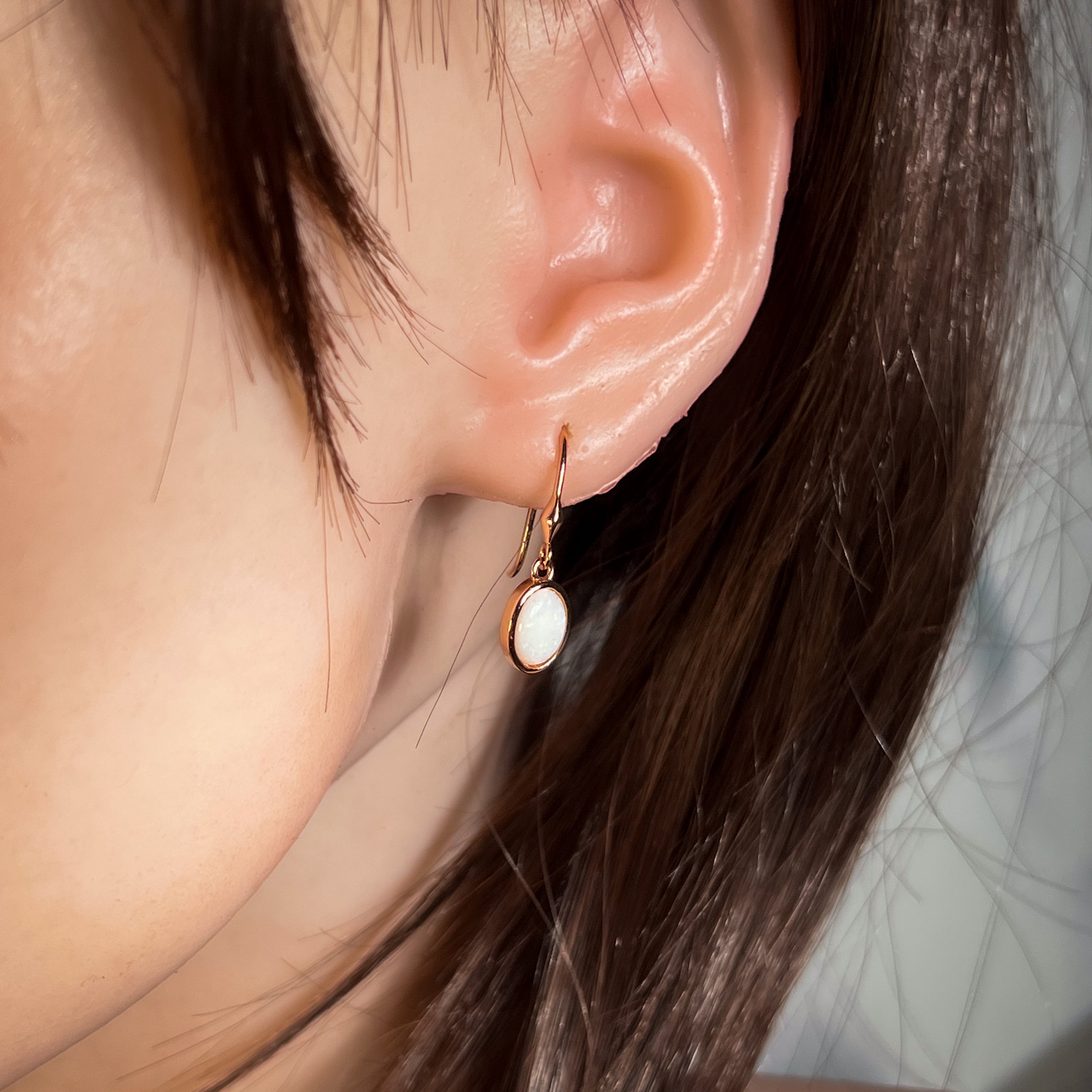 Rose Gold plated Silver danglng bezel set White Opals on hooks
