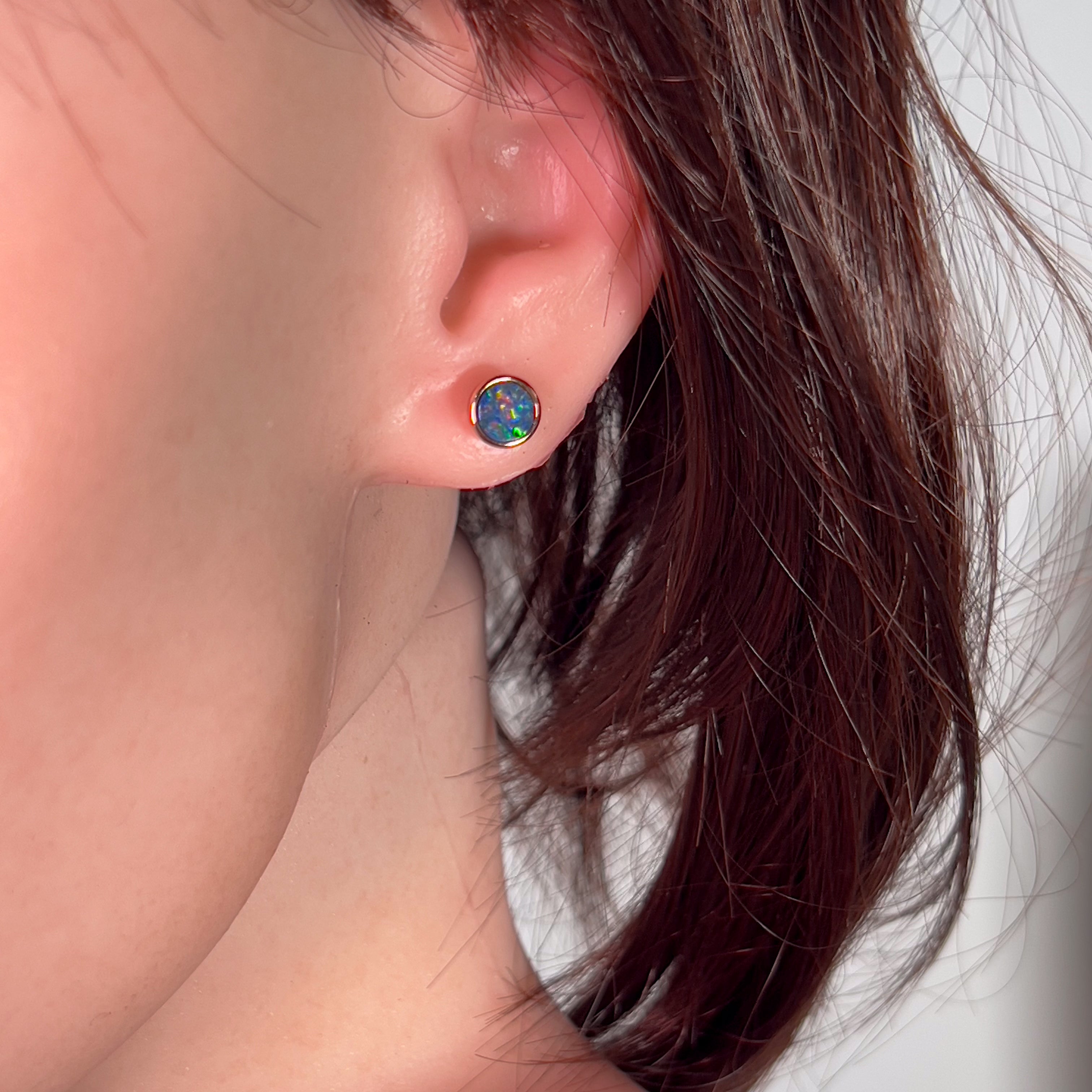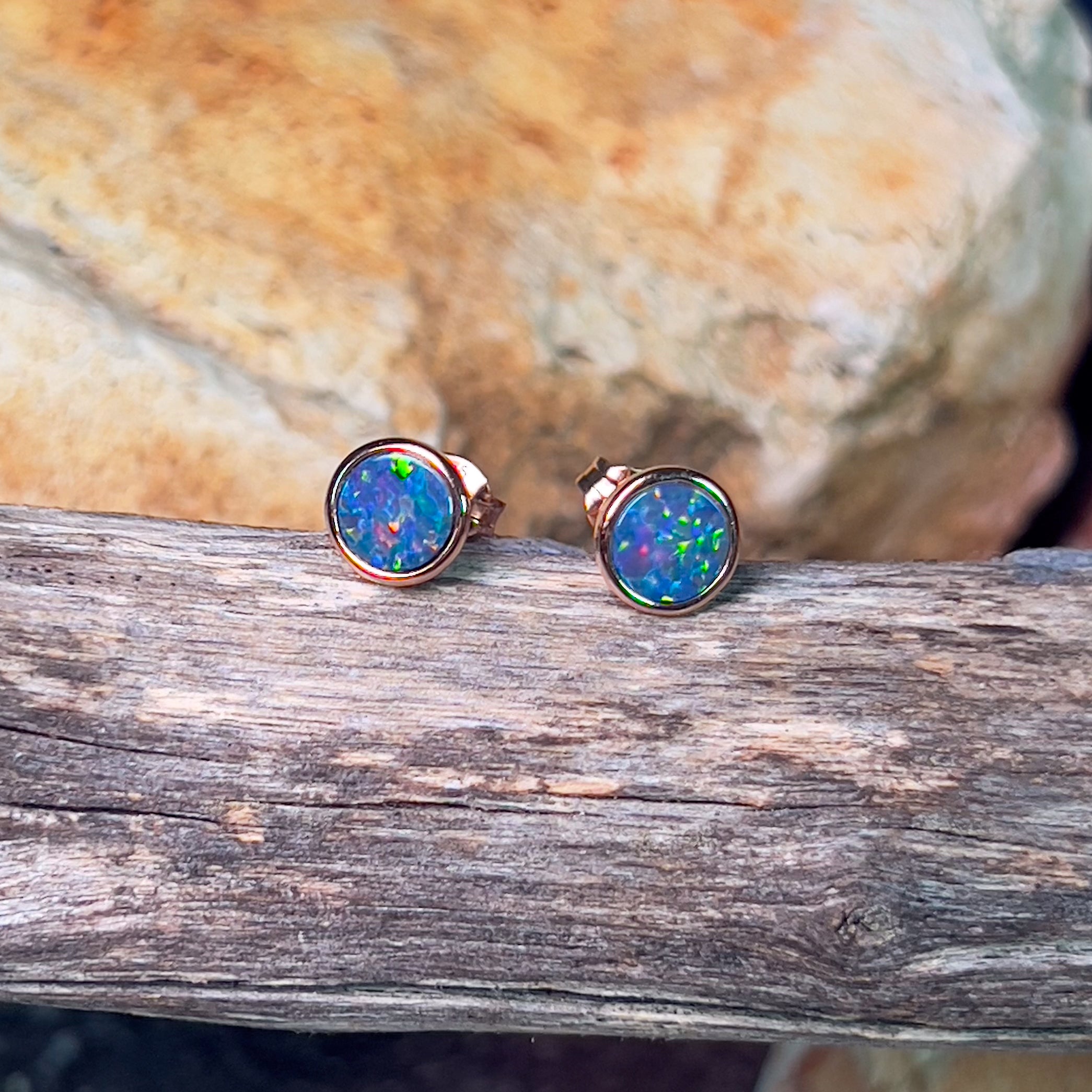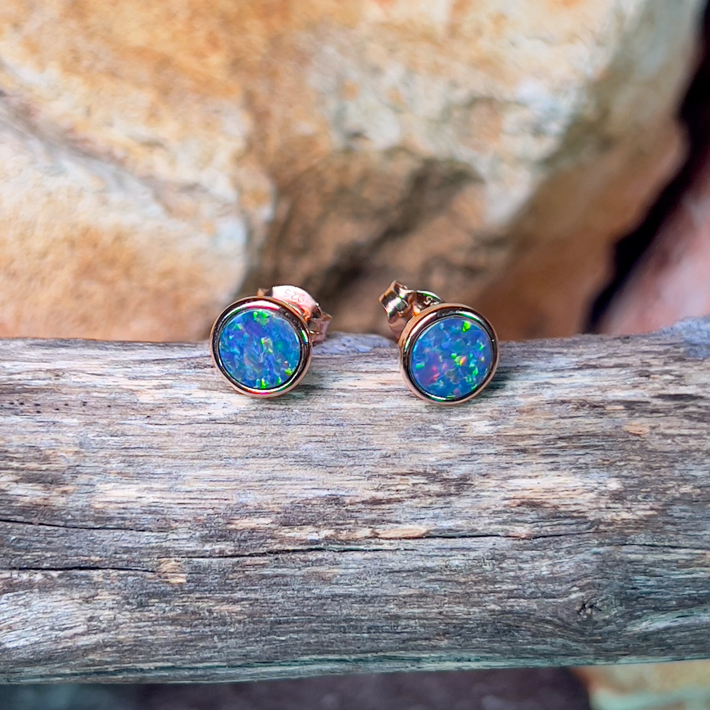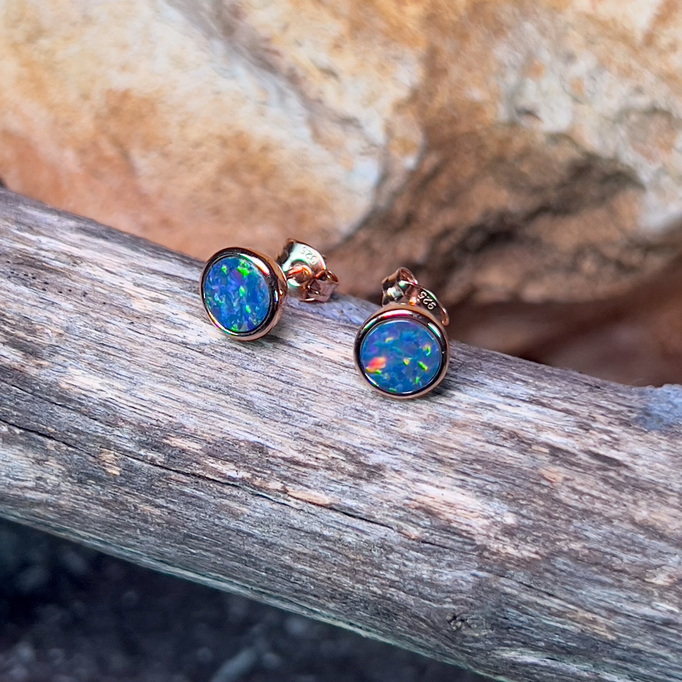 Indulge in elegant luxury with our Rose Gold plated Silver Round Opal doublet studs. These classic earrings feature a stunning round design that adds a touch of timeless sophistication to any outfit. Let the opal doublet stones sparkle and shine, making you feel like a true gem.