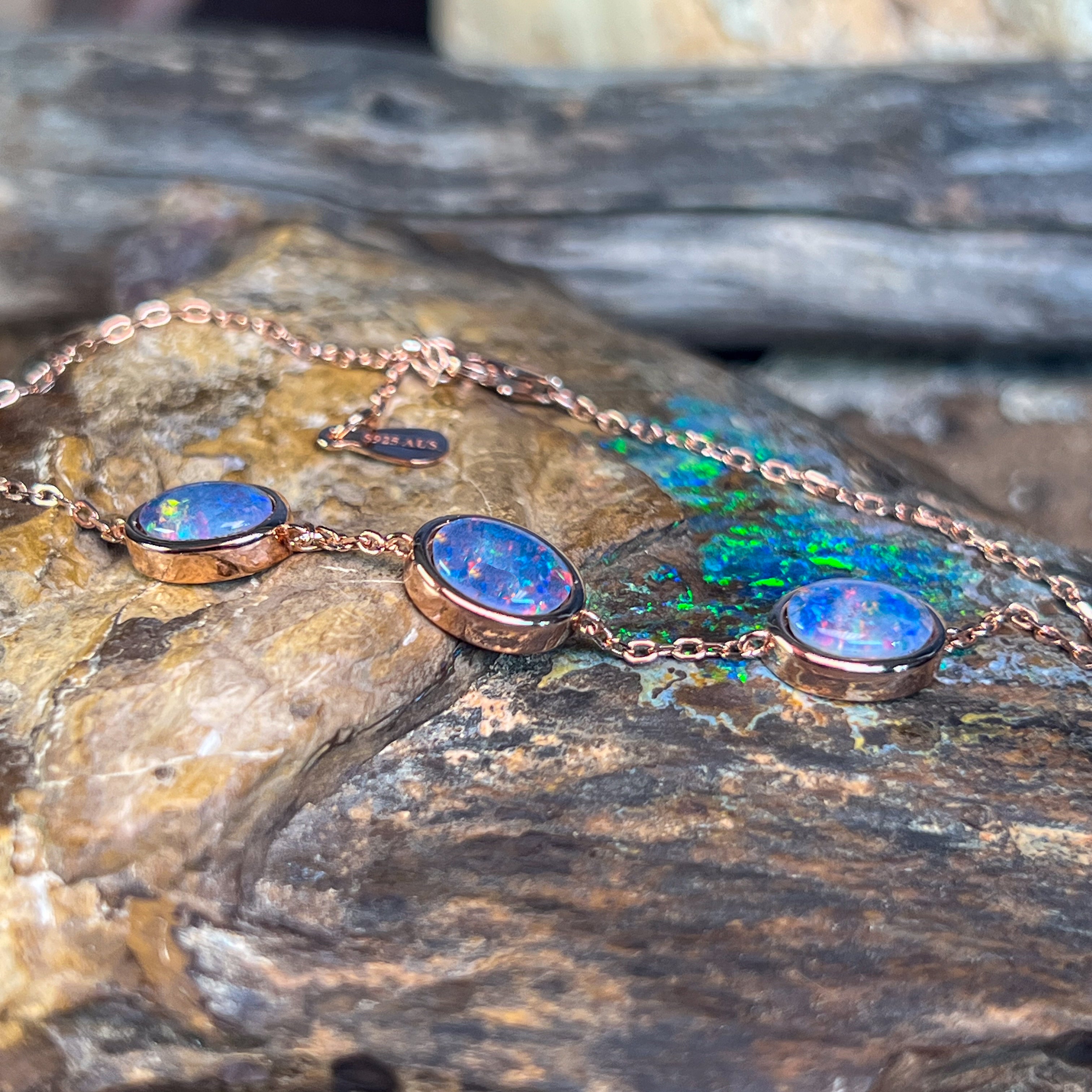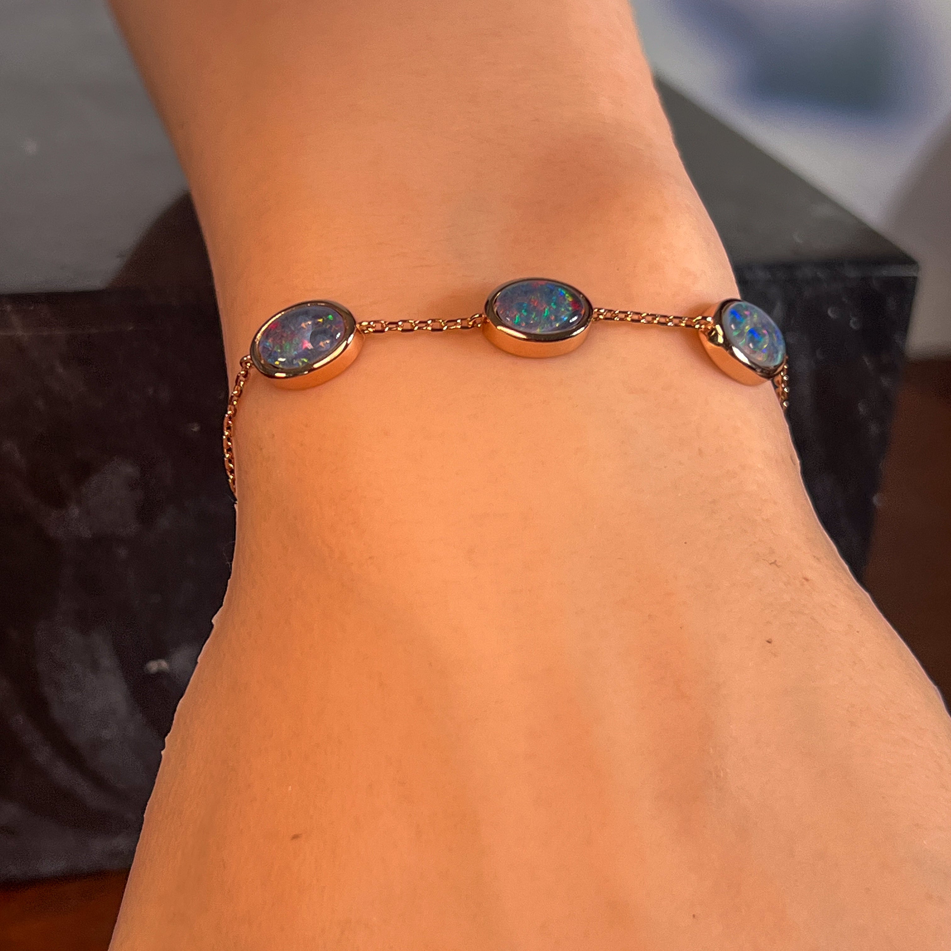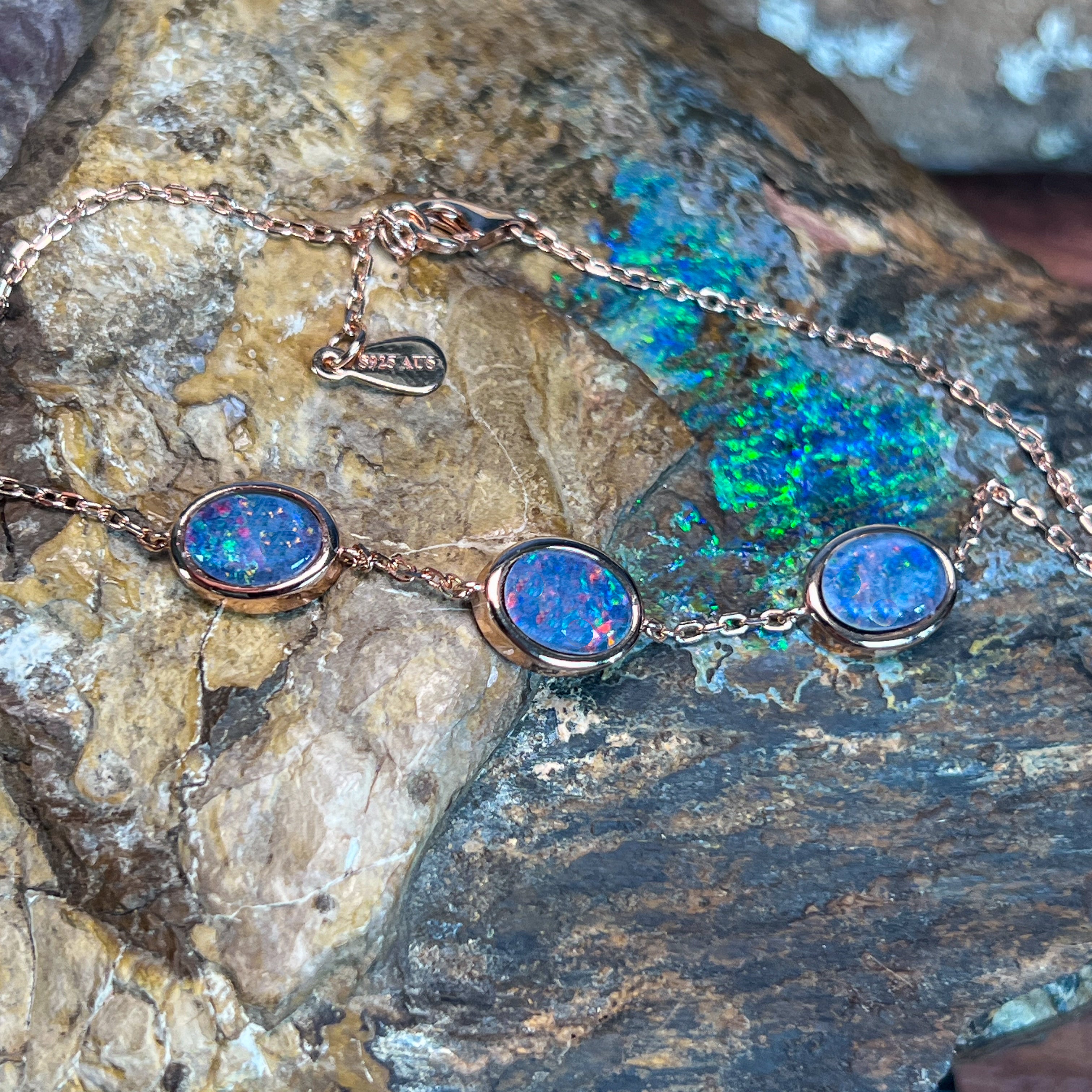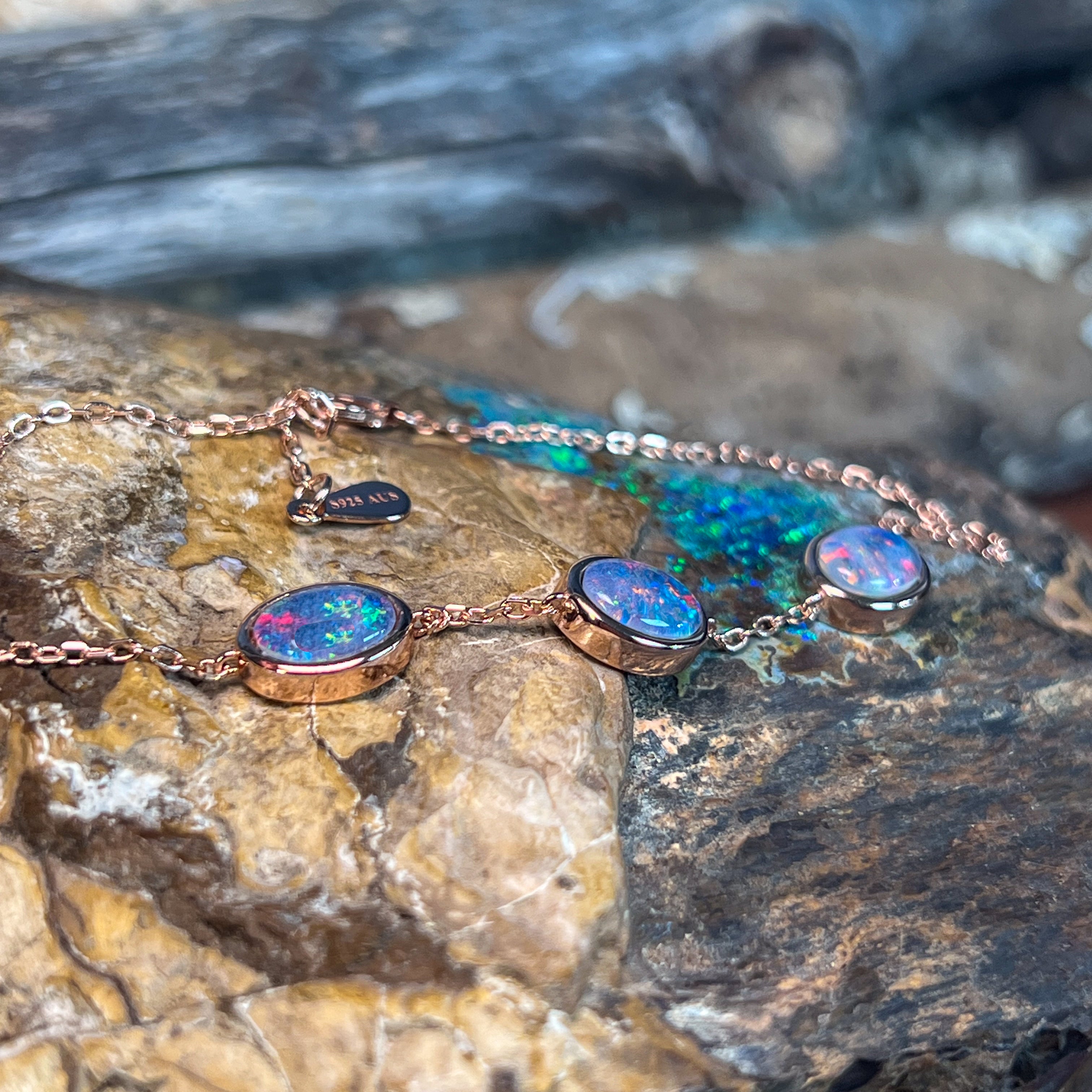 One Rose Gold plated Sterling Silver 3 stone bracelet featuring three stunning Australian Opal Triplets spaced elegantly along the band. Each opal measures 8x6mm, showcasing the natural play-of-colour these gemstones are renowned for. The bracelet adjusts from 19.5cm to 21.5cm, making it comfortable for most wrist sizes. Weighing just 3.35g, it's lightweight and perfect for everyday wear or special occasions. A timeless piece that celebrates Australia's most iconic gemstone.