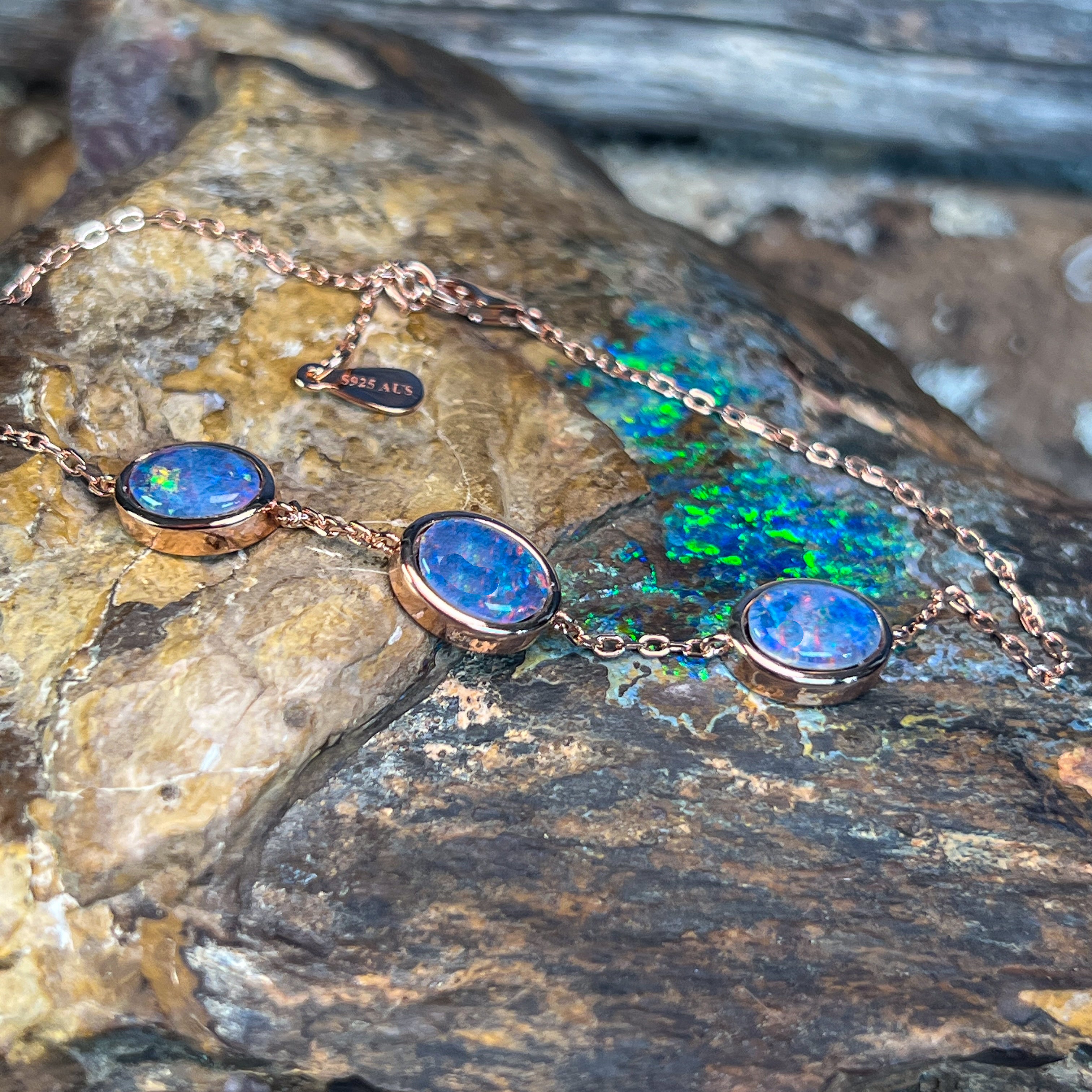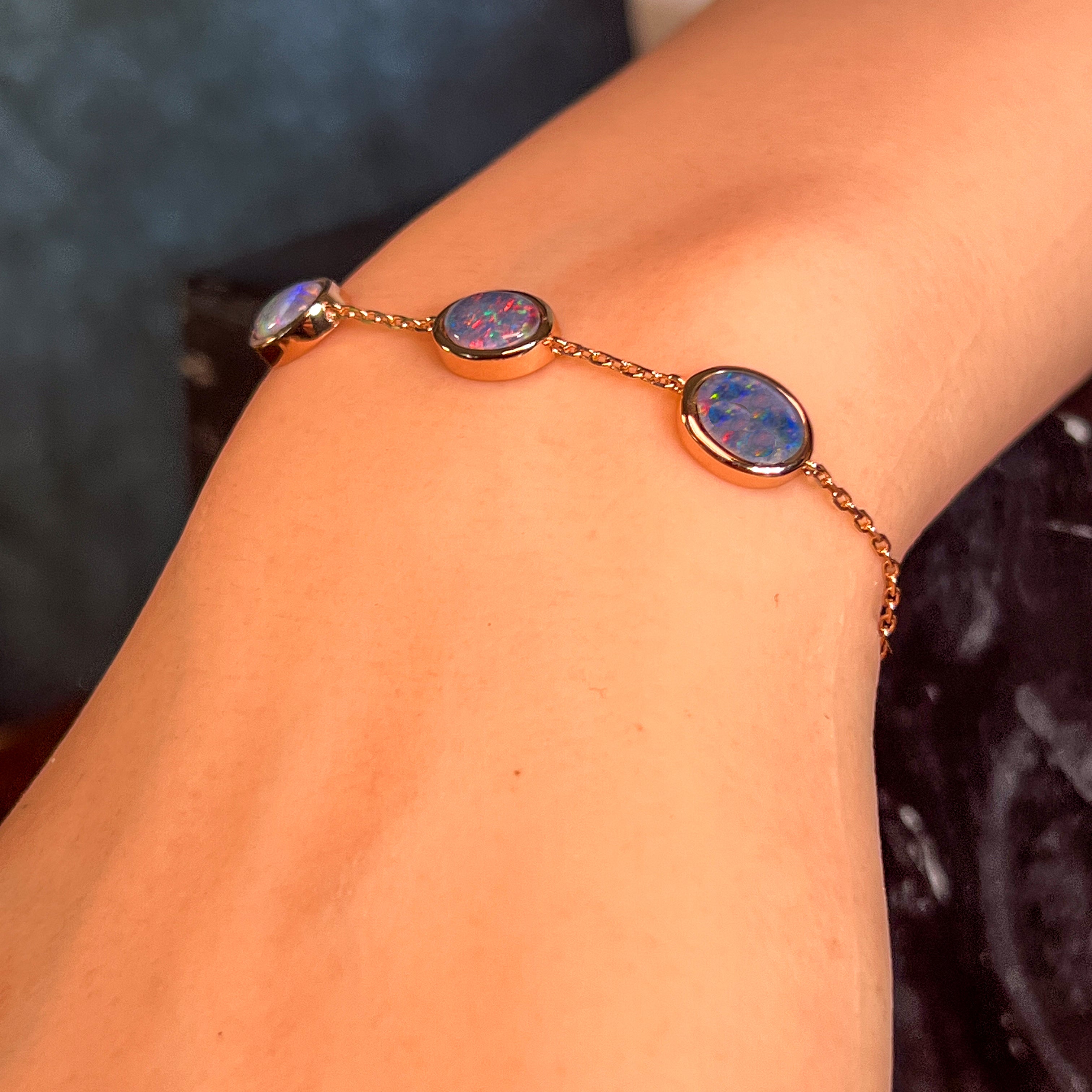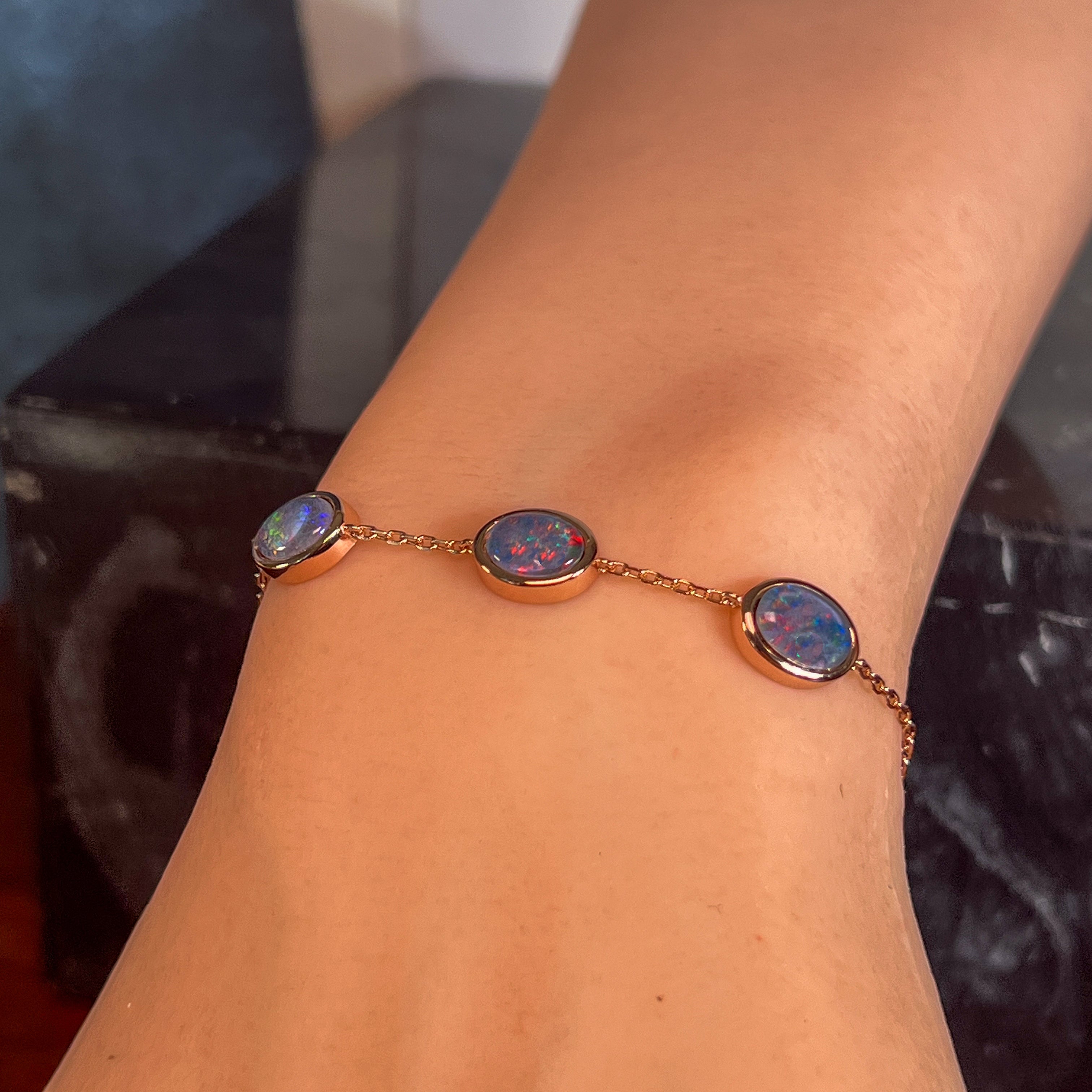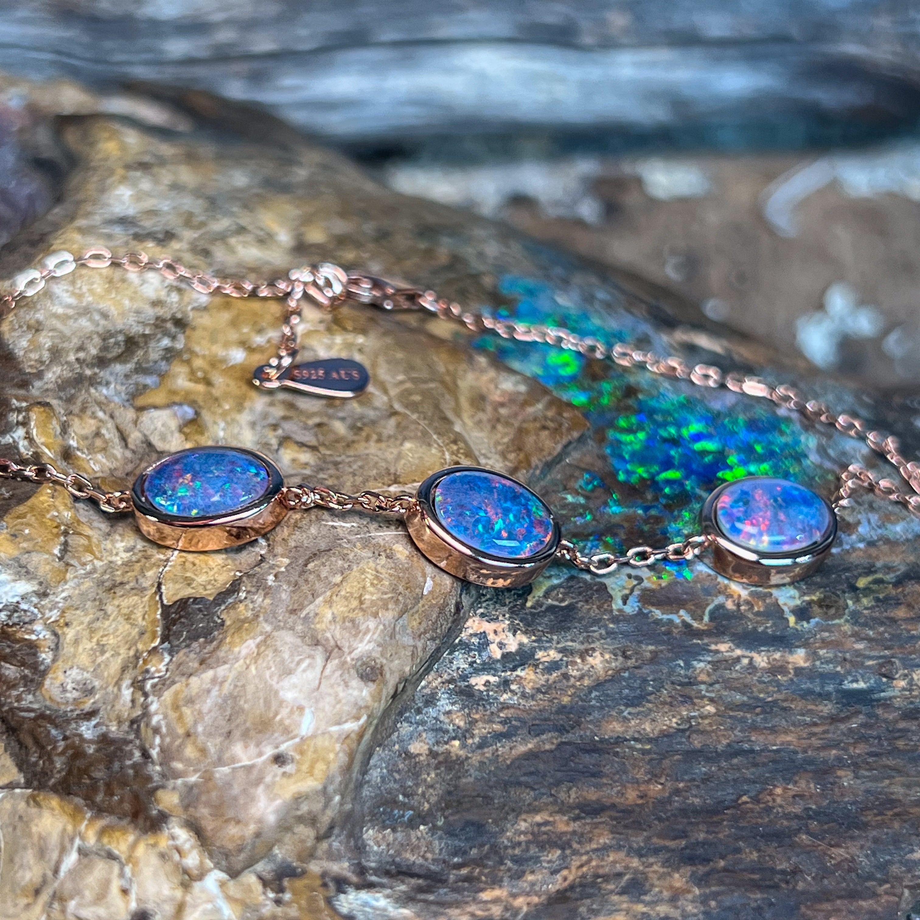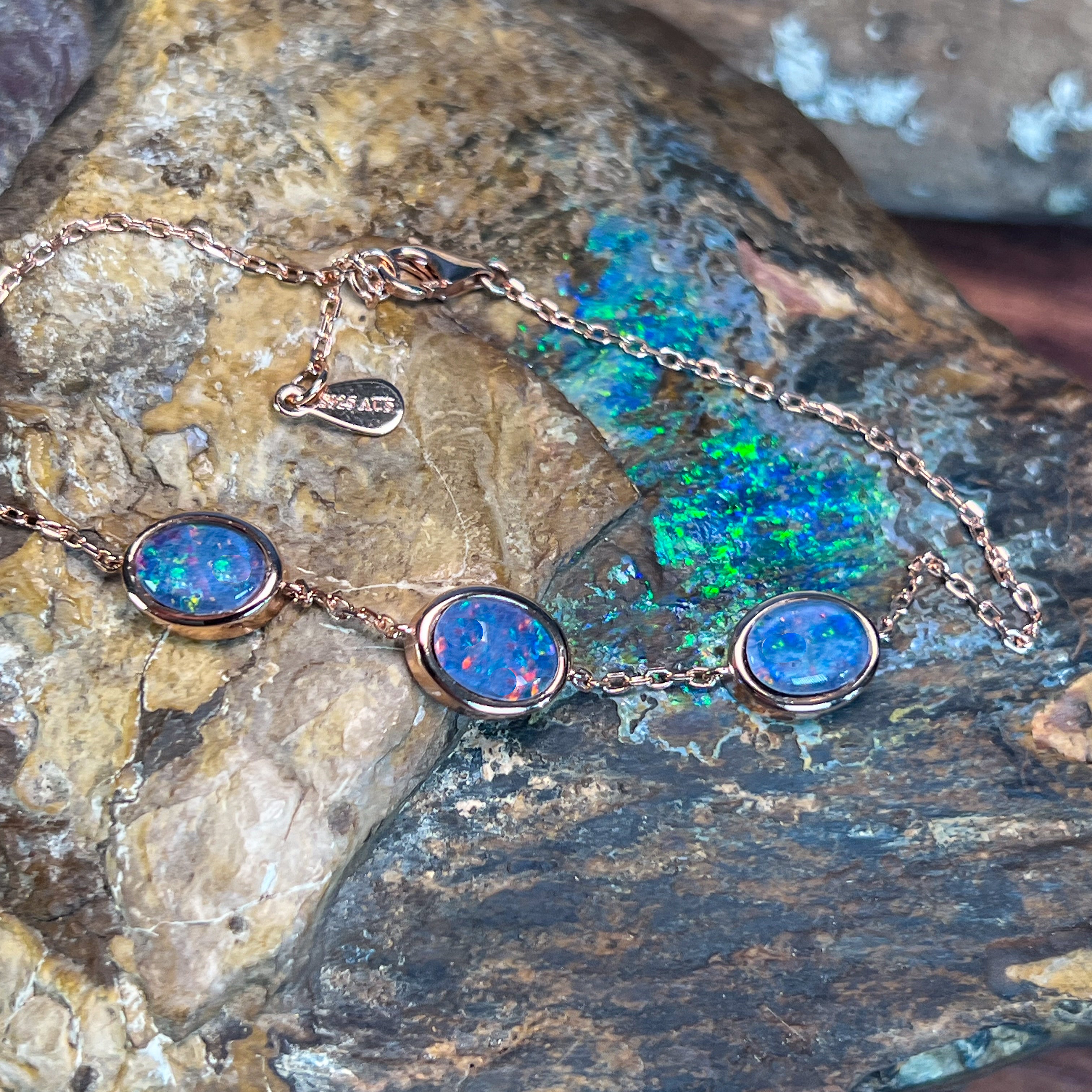 One Rose Gold plated Sterling Silver 3 stone bracelet featuring three stunning Australian Opal Triplets spaced elegantly along the band. Each opal measures 8x6mm, showcasing the natural play-of-colour these gemstones are renowned for. The bracelet adjusts from 19.5cm to 21.5cm, making it comfortable for most wrist sizes. Weighing just 3.35g, it's lightweight and perfect for everyday wear or special occasions. A timeless piece that celebrates Australia's most iconic gemstone.