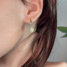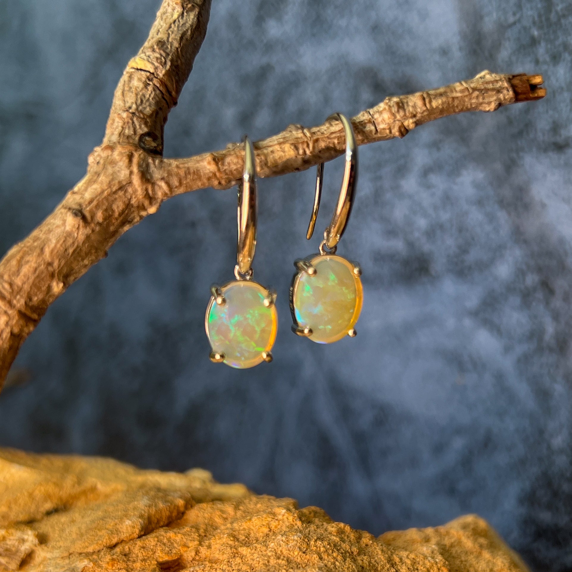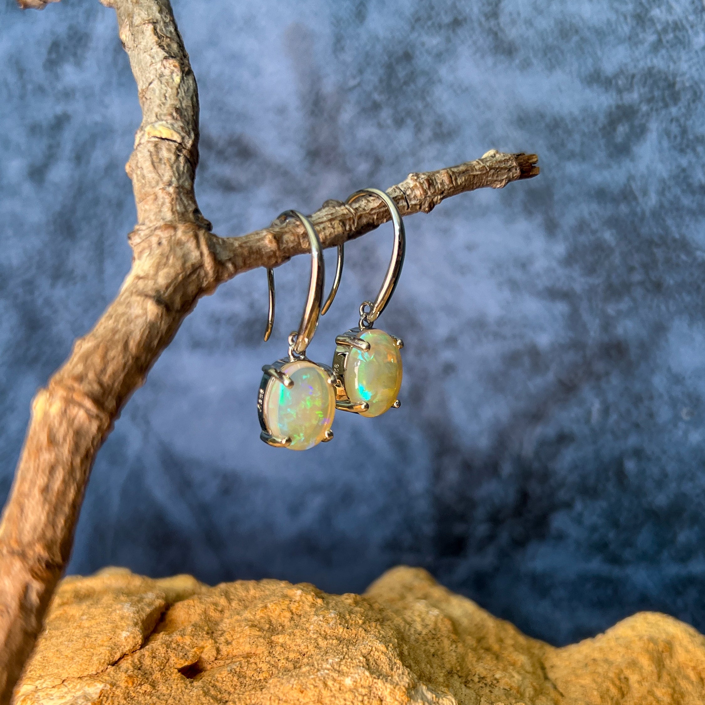 Elevate your style with these sterling silver earrings featuring 10x8mm light opals in captivating green and blue hues. Expertly claw set and designed with elegant dangling hooks, they catch the light beautifully, adding a touch of sophisticated charm to any outfit. Perfect for enhancing your everyday look or making a statement on special occasions.