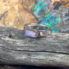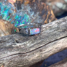 This elegant sterling silver ring features a beautiful Boulder opal set in a timeless design. Adorned with pink and blue hues, this ring will add a touch of color and sophistication to any outfit.One Sterling Silver Boulder opal ring bezel set