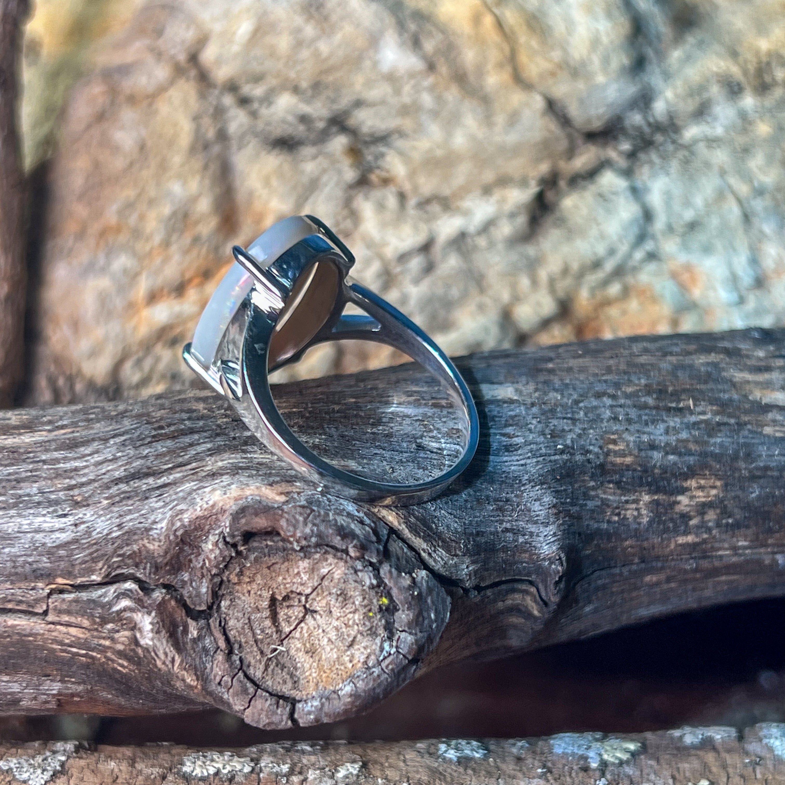 Make a striking impression with this large oval-shaped statement ring featuring a stunning 6.35ct dark opal set in sterling silver. The claw setting and split shank design enhance the opal’s deep, captivating colors, offering a unique blend of elegance and bold style. Perfect for elevating any look, this ring combines craftsmanship with eye-catching beauty.