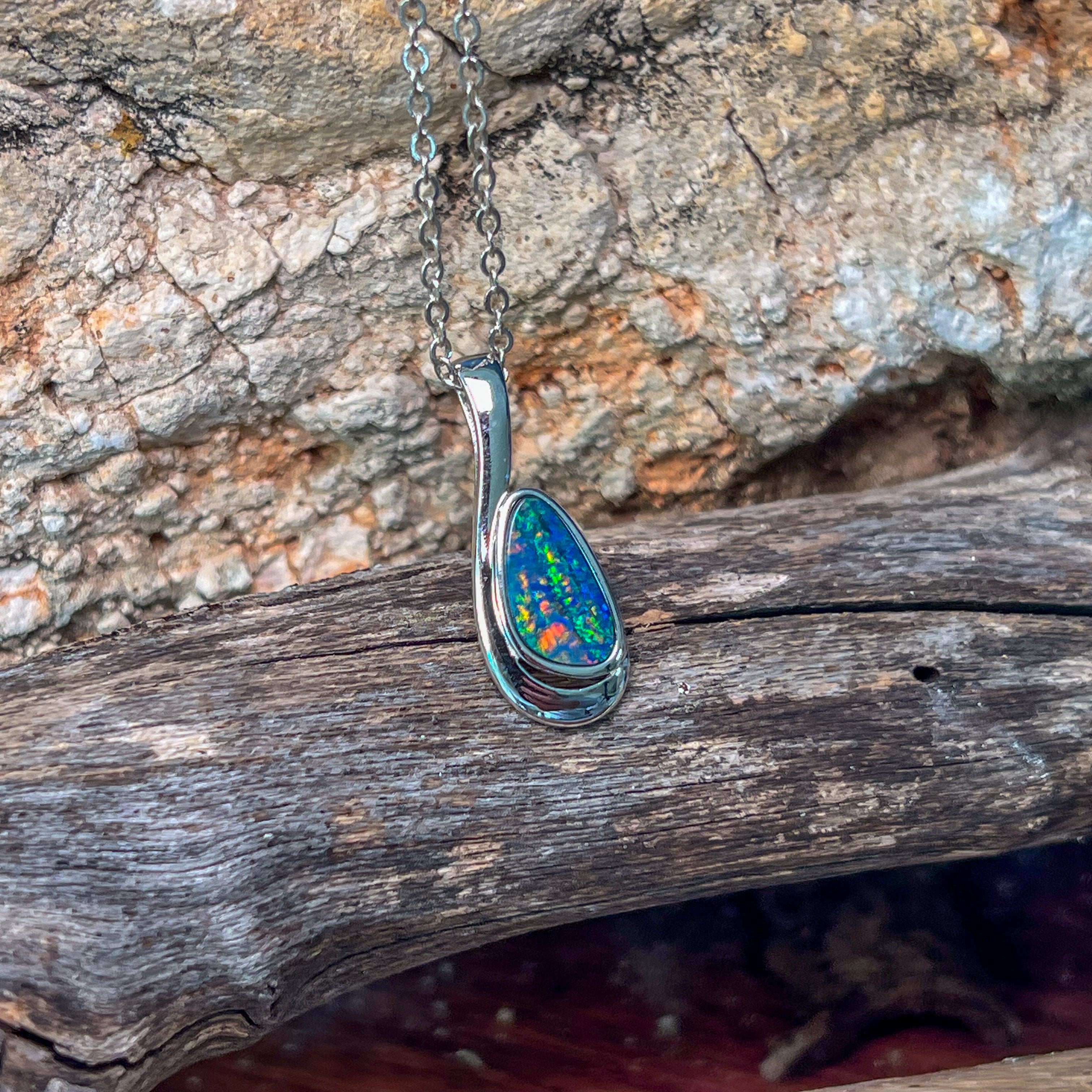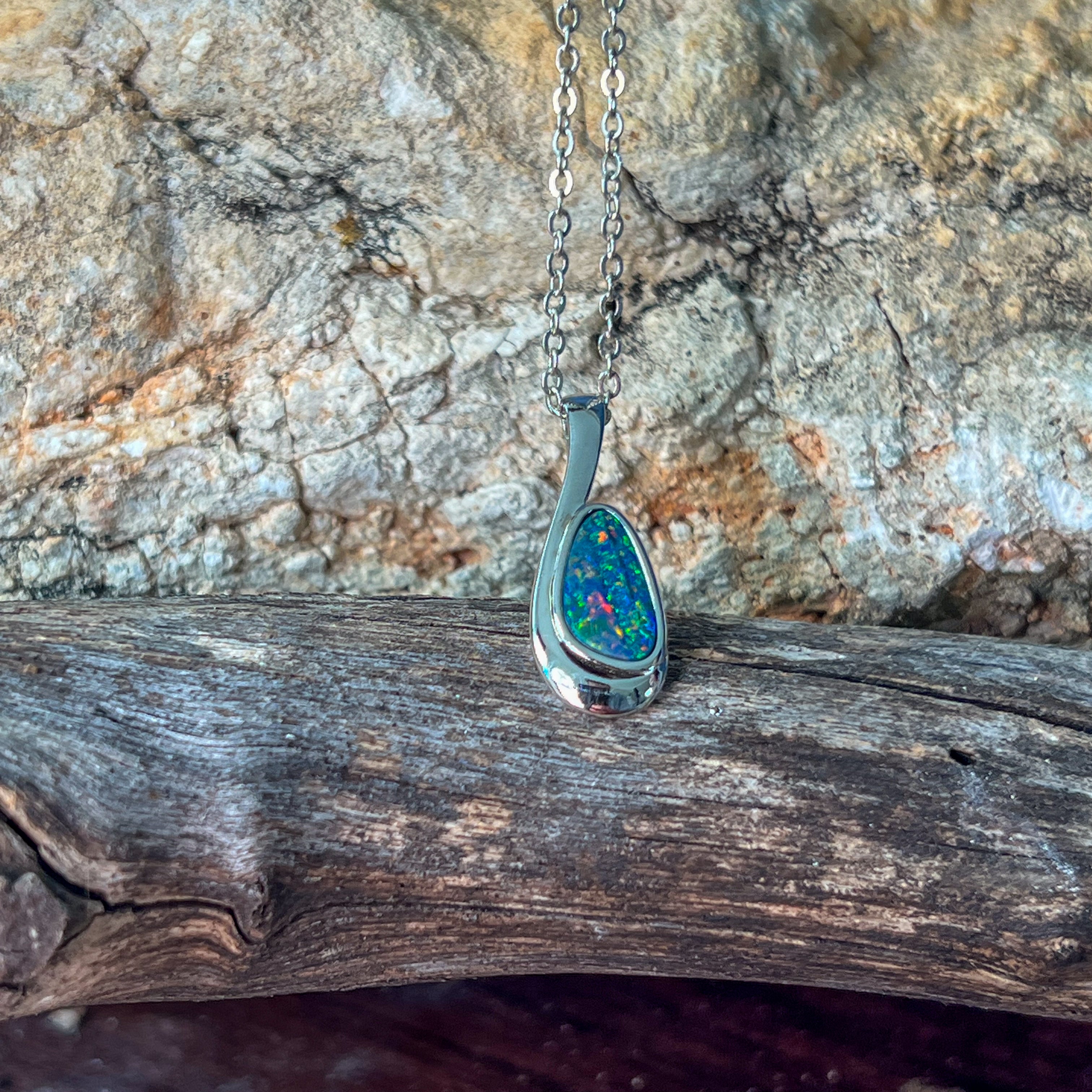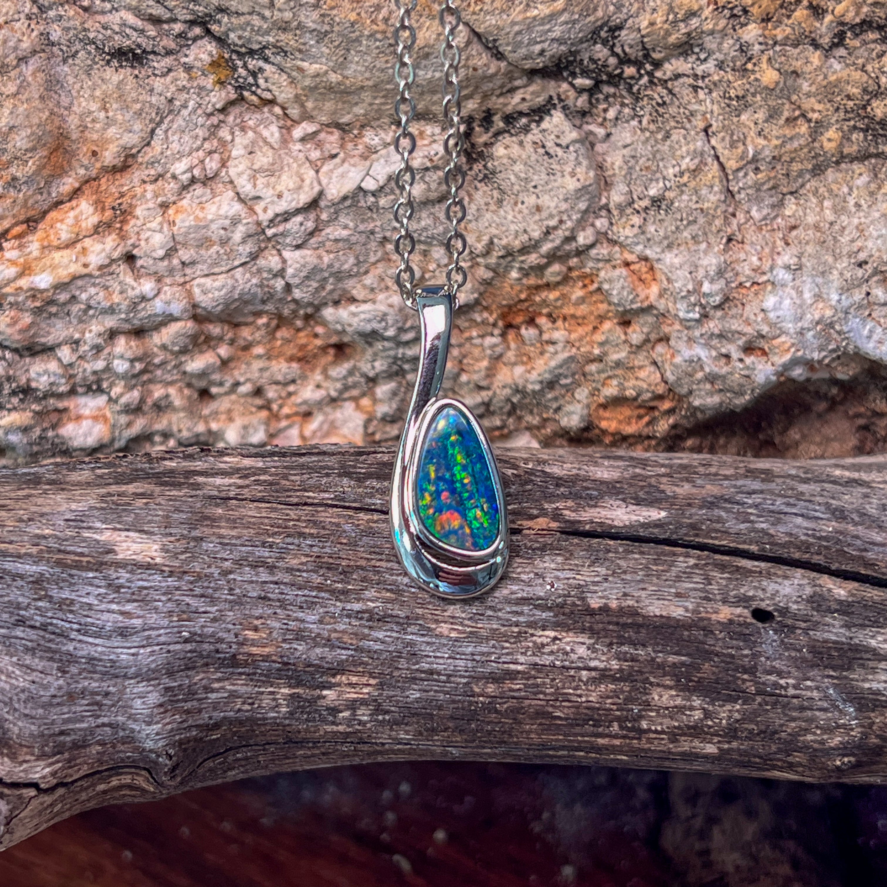 Add a splash of magic to your day with this Sterling Silver drop-shaped opal doublet pendant. Bursting with striking red and green hues, it’s like wearing a tiny rainbow that dances with every move. Perfect for adding a playful pop of colour to any outfit!