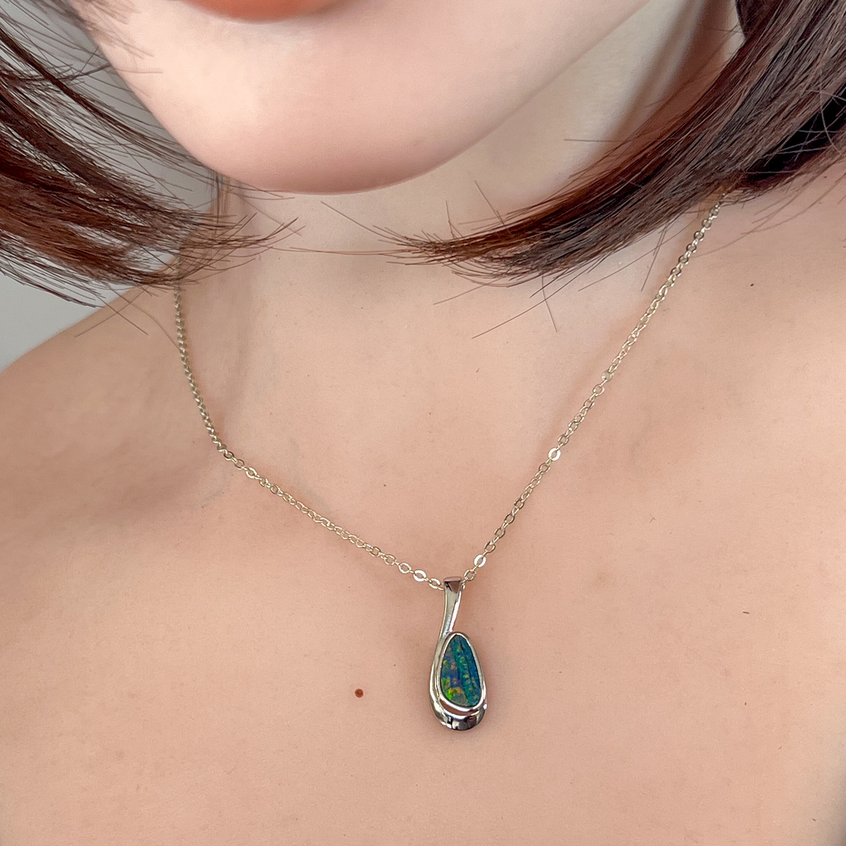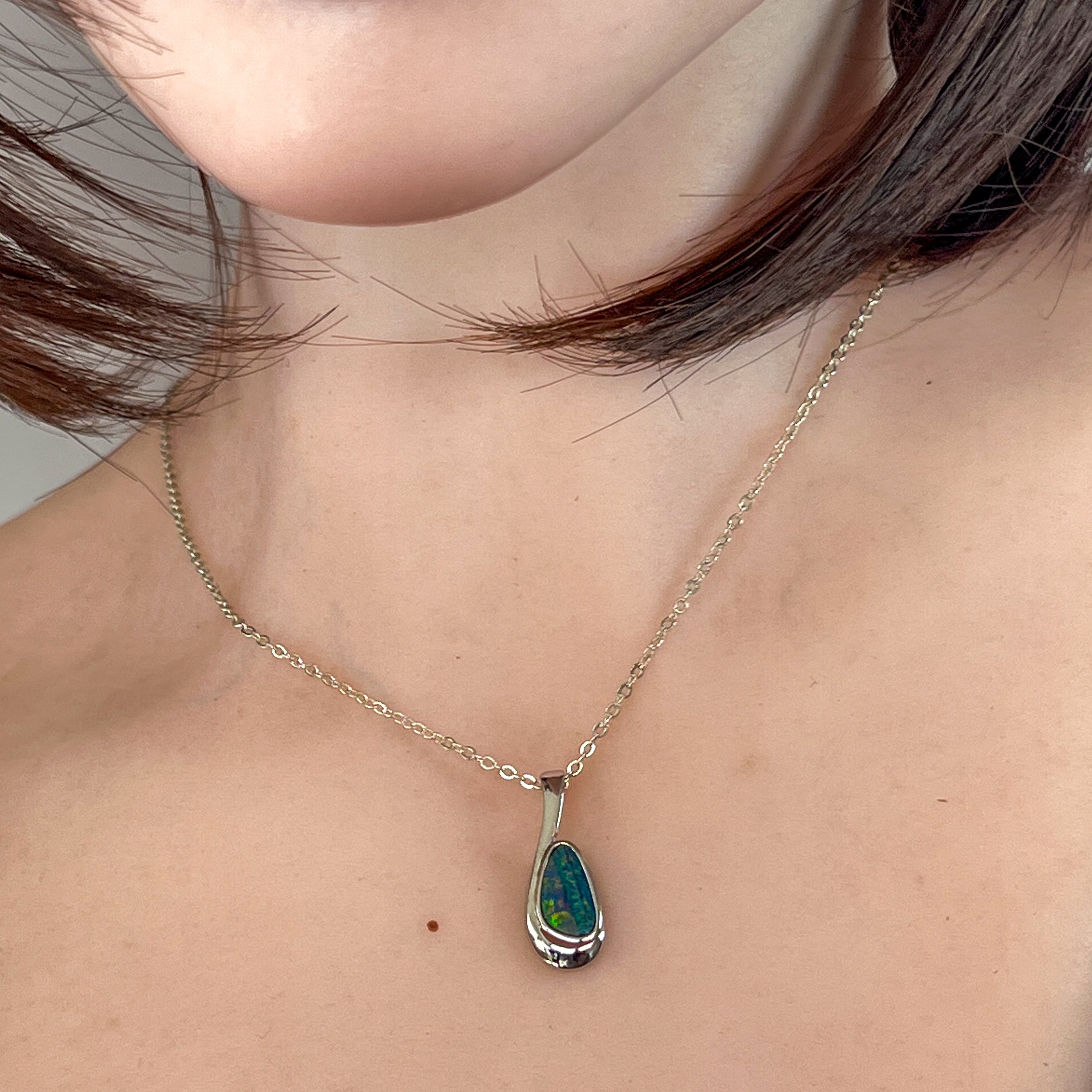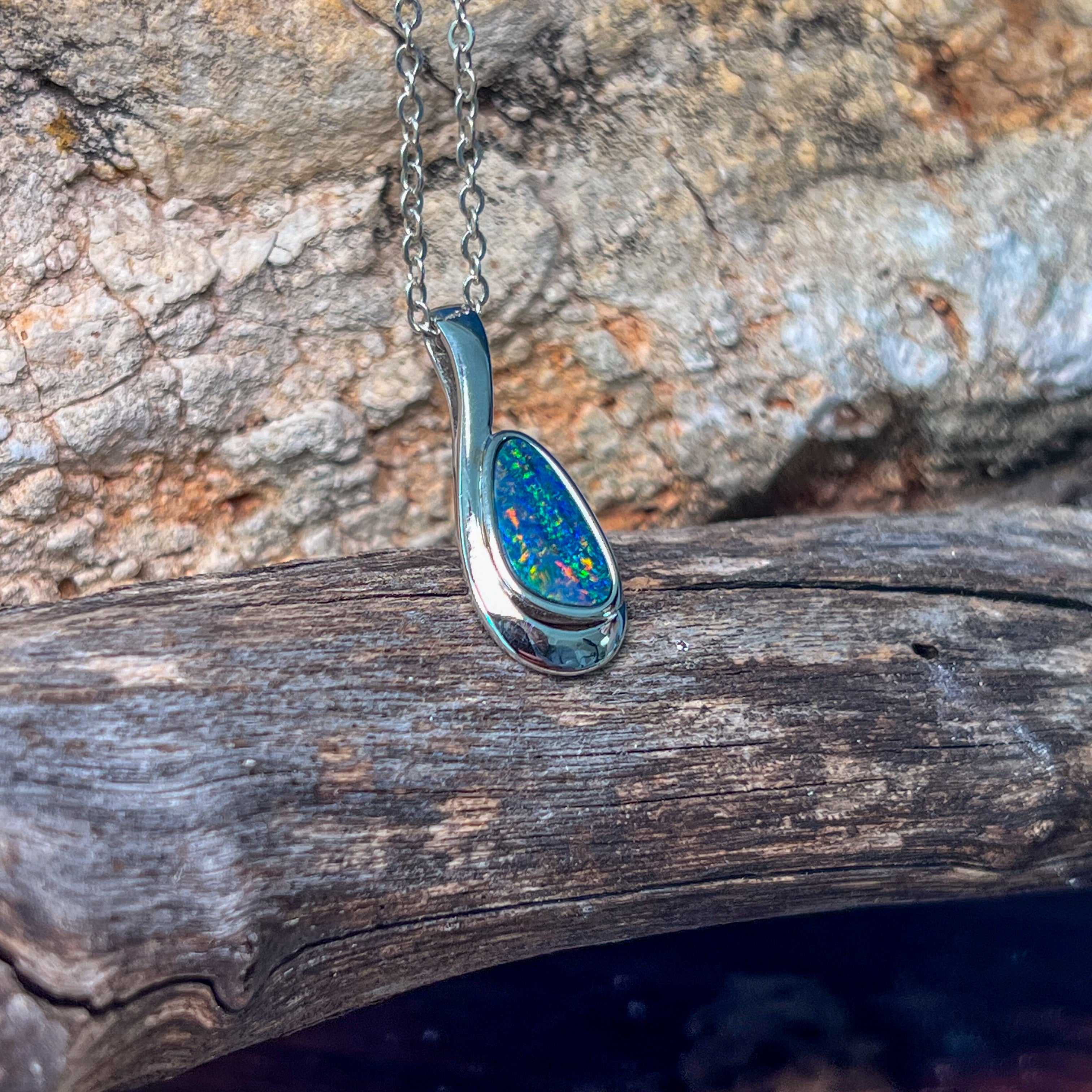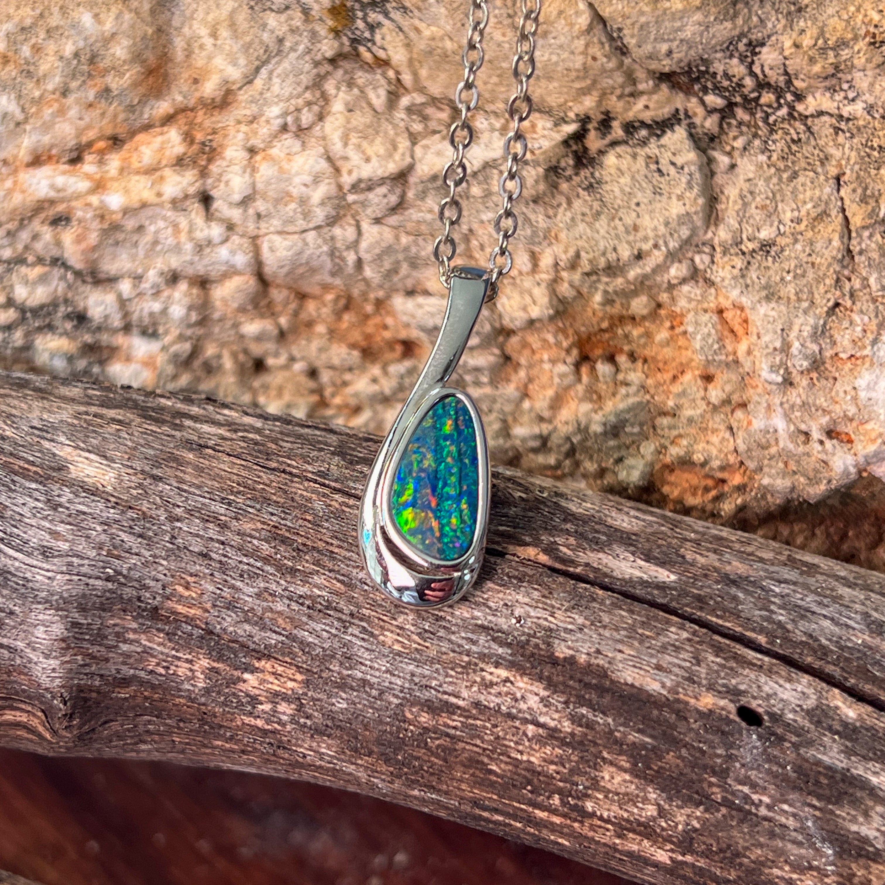 Add a splash of magic to your day with this Sterling Silver drop-shaped opal doublet pendant. Bursting with striking red and green hues, it’s like wearing a tiny rainbow that dances with every move. Perfect for adding a playful pop of colour to any outfit!