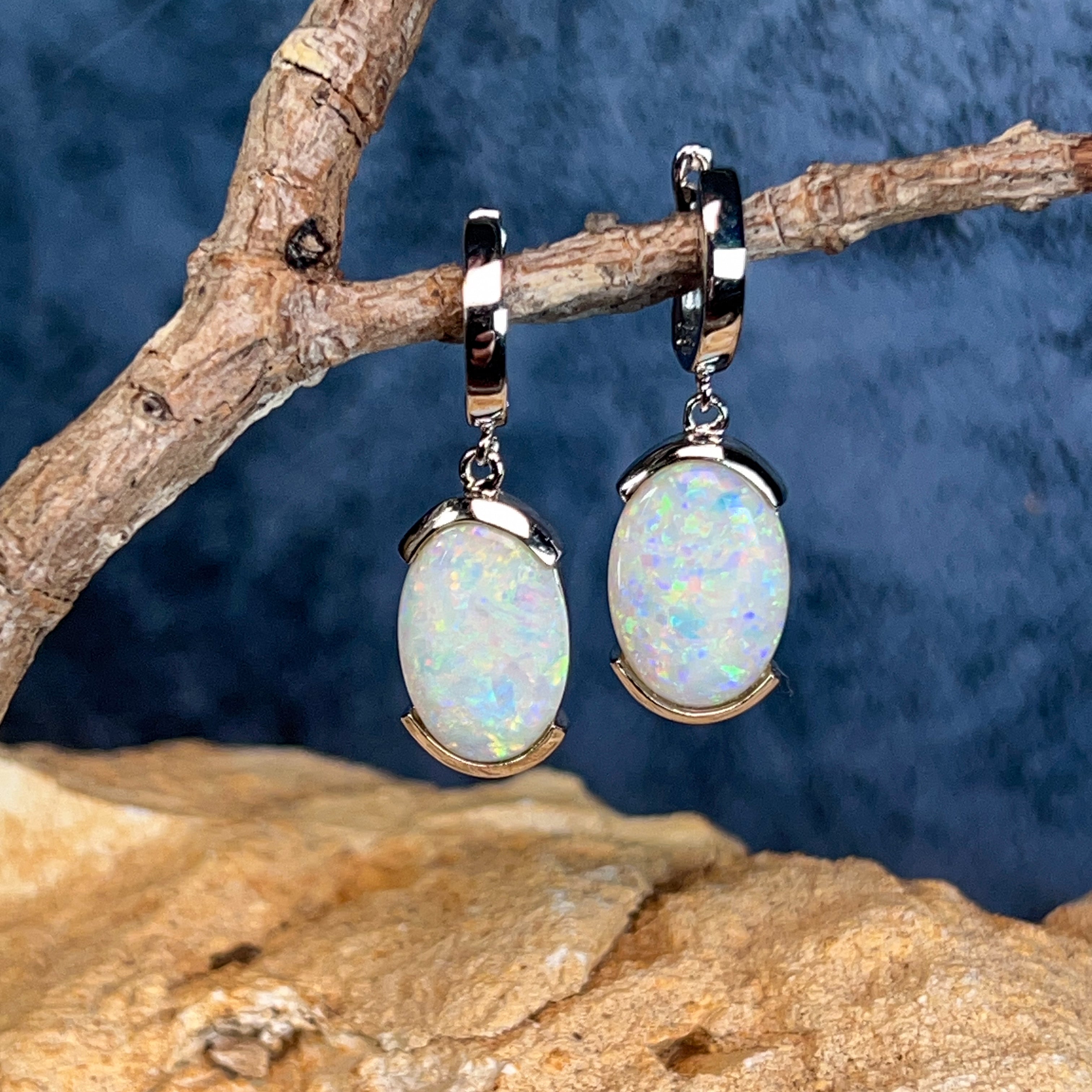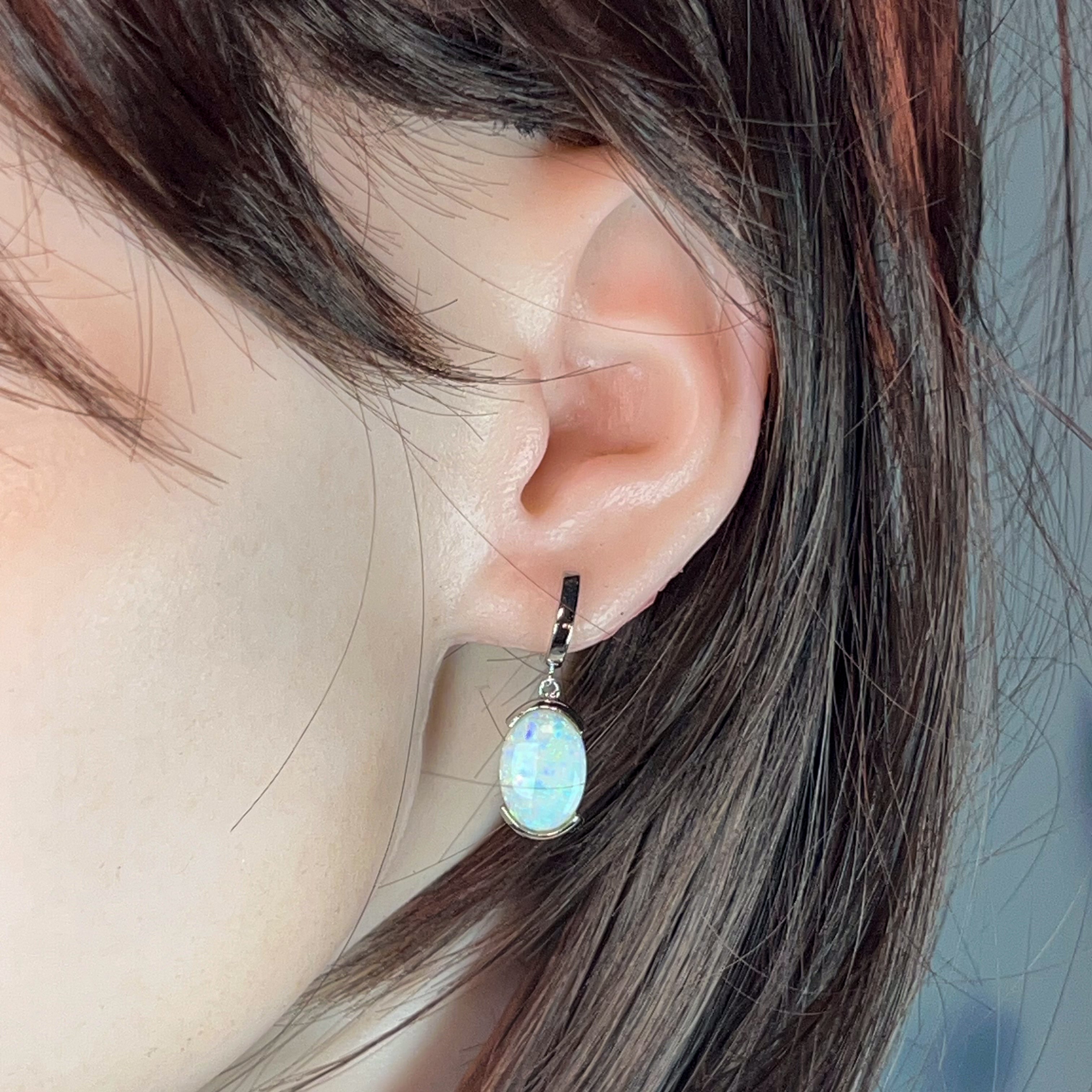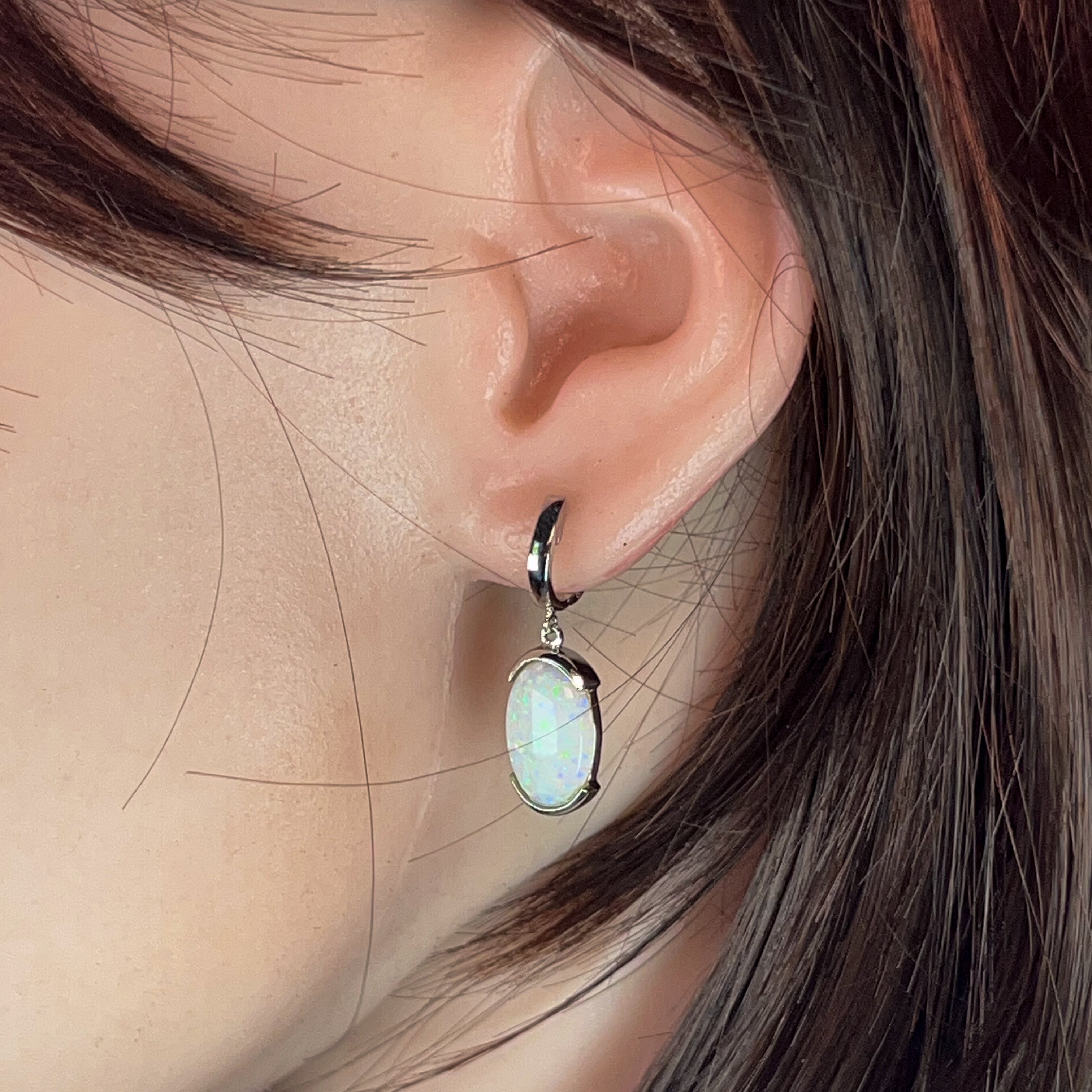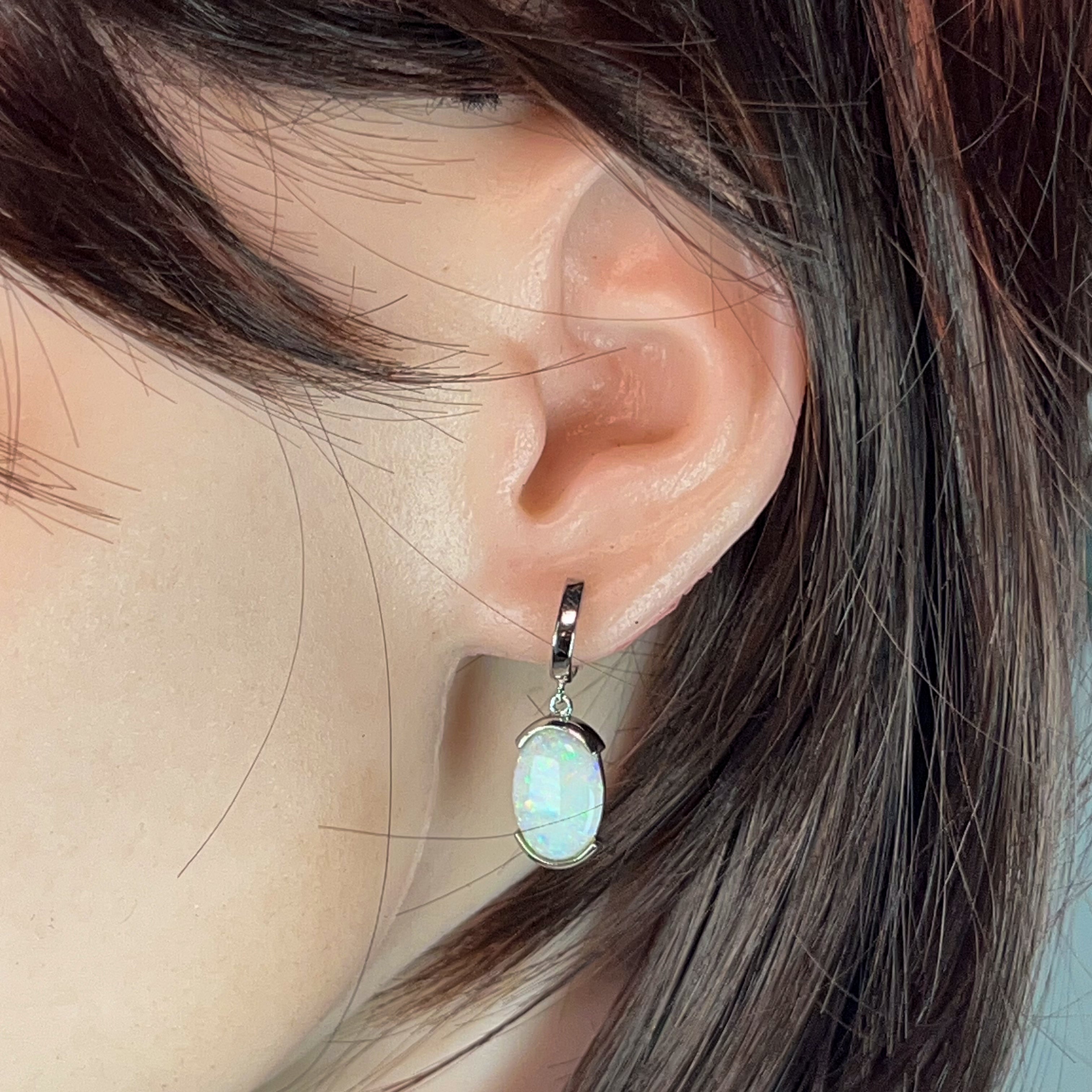 Sterling Silver drop style huggie White Opal 16x10mm half bezel earrings