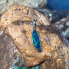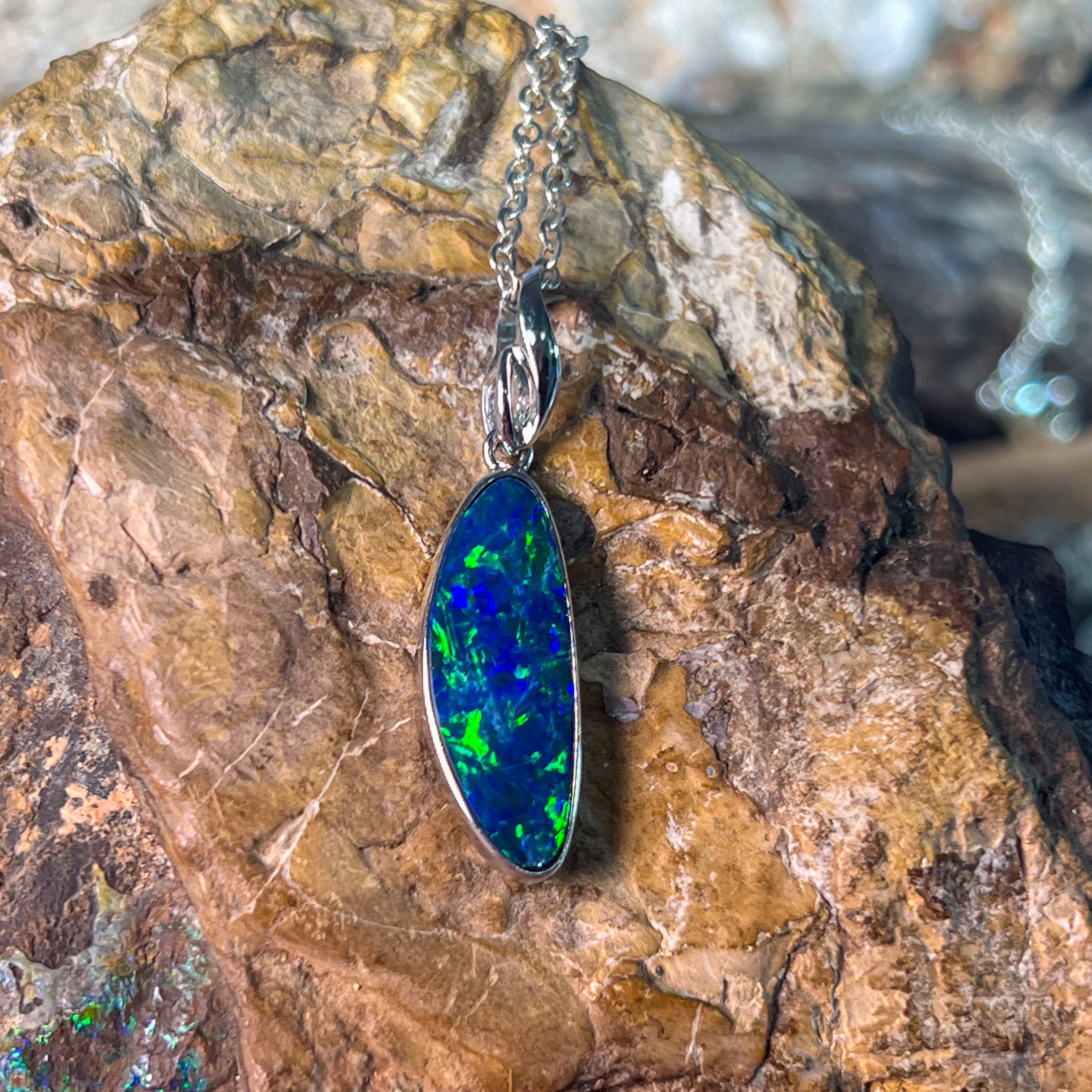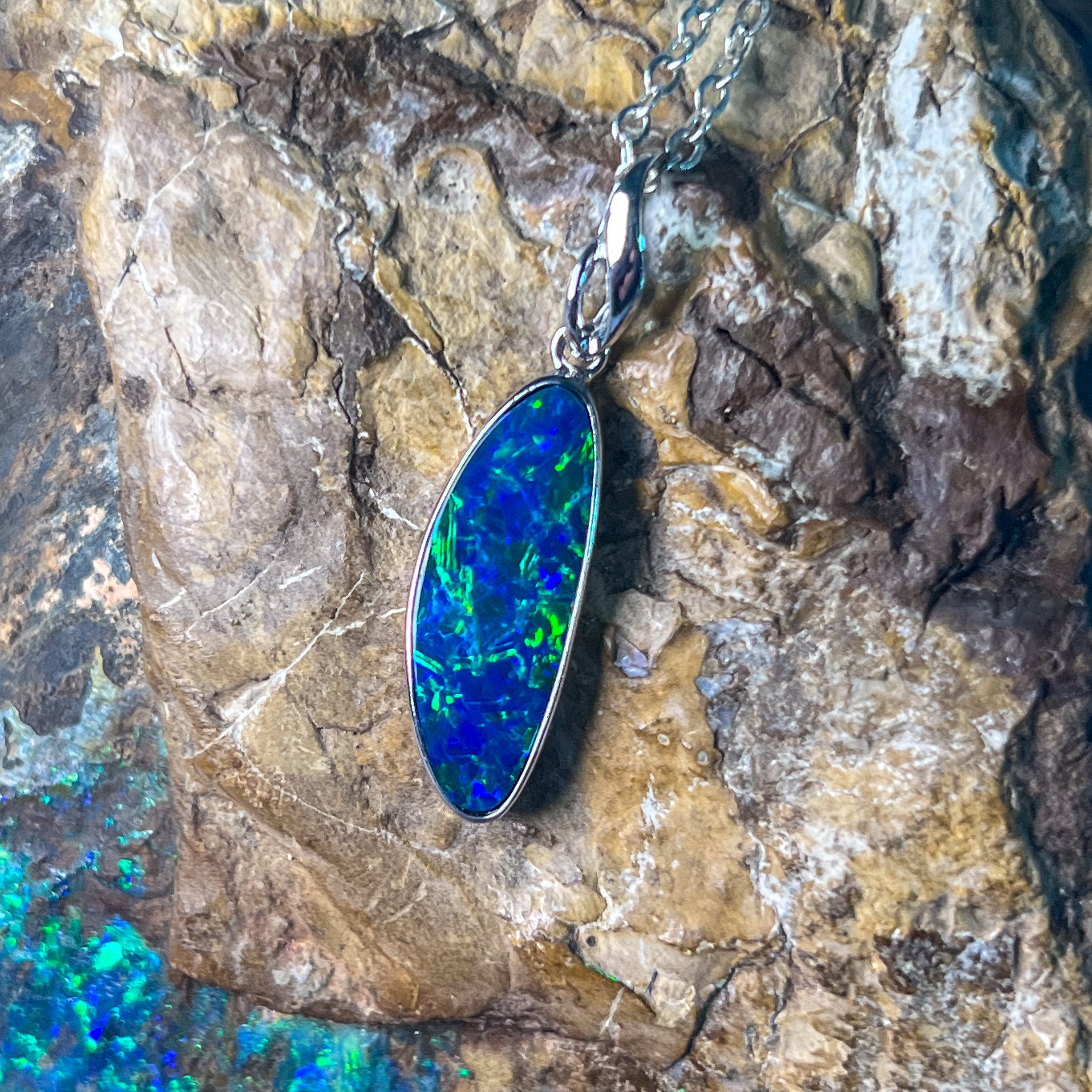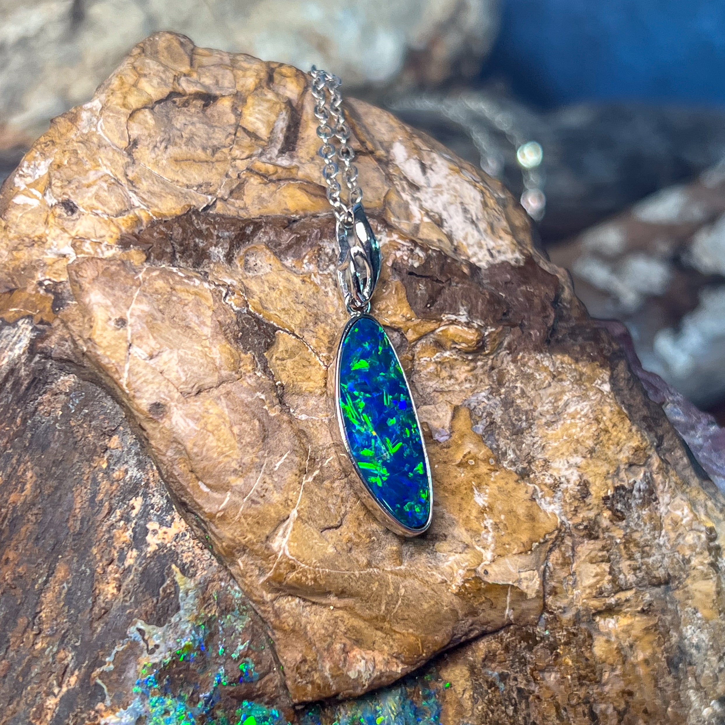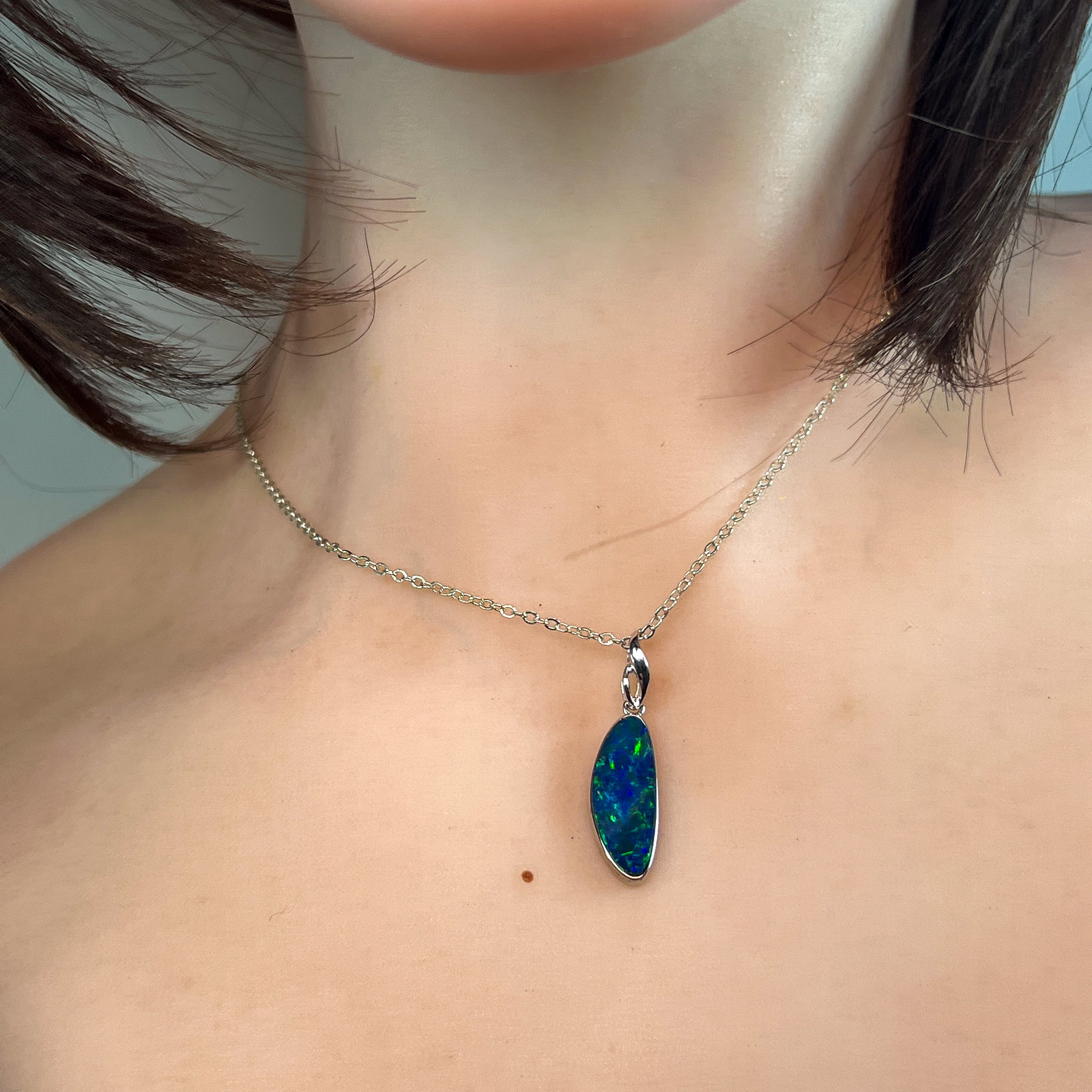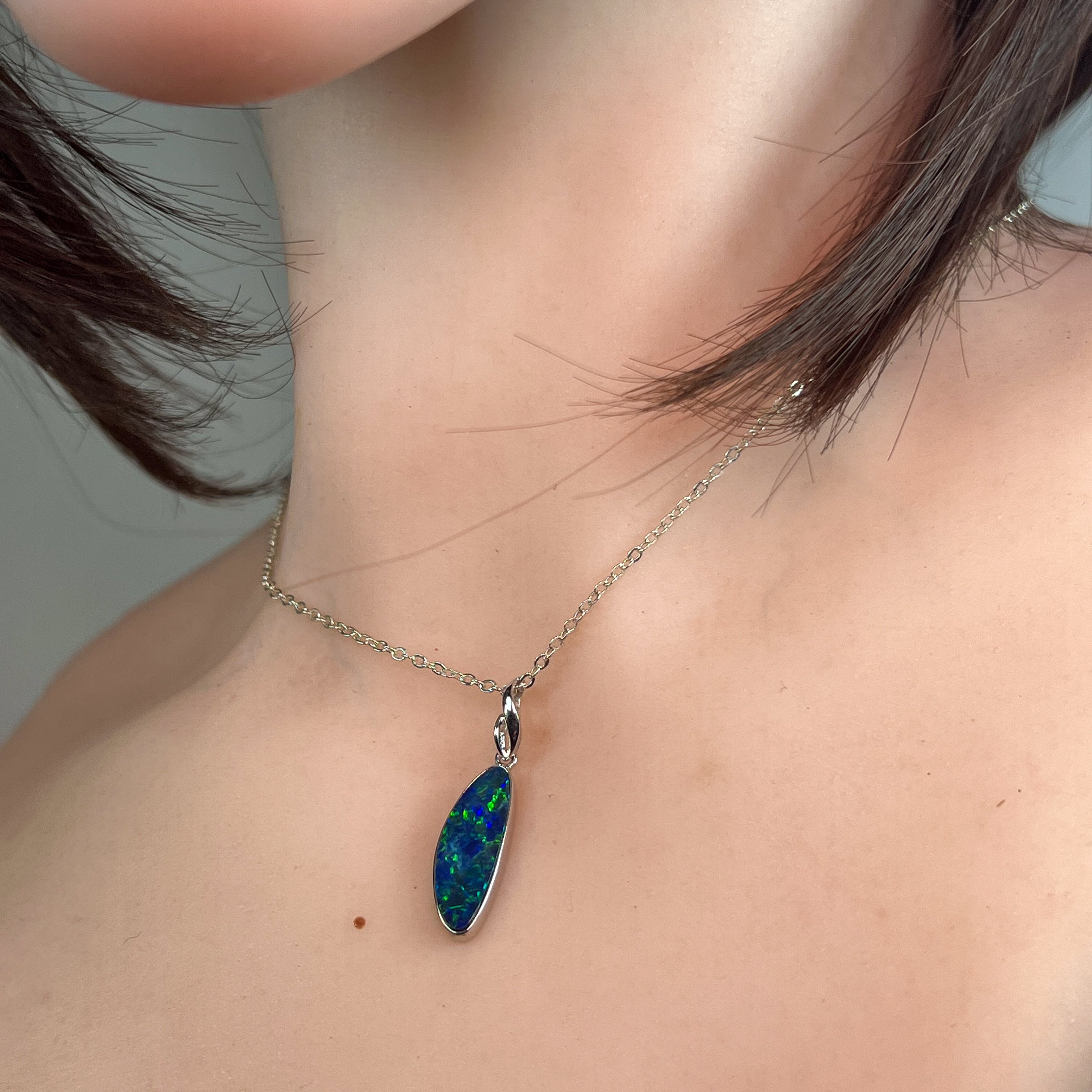 Elevate your style with this Sterling Silver pendant featuring a long, thin freeform design. The deep forest green and rich blue hues of the opal doublet create a captivating contrast that catches the light beautifully. Lightweight yet striking, this pendant adds a touch of elegance and uniqueness to any outfit, perfect for those who appreciate subtle sophistication.