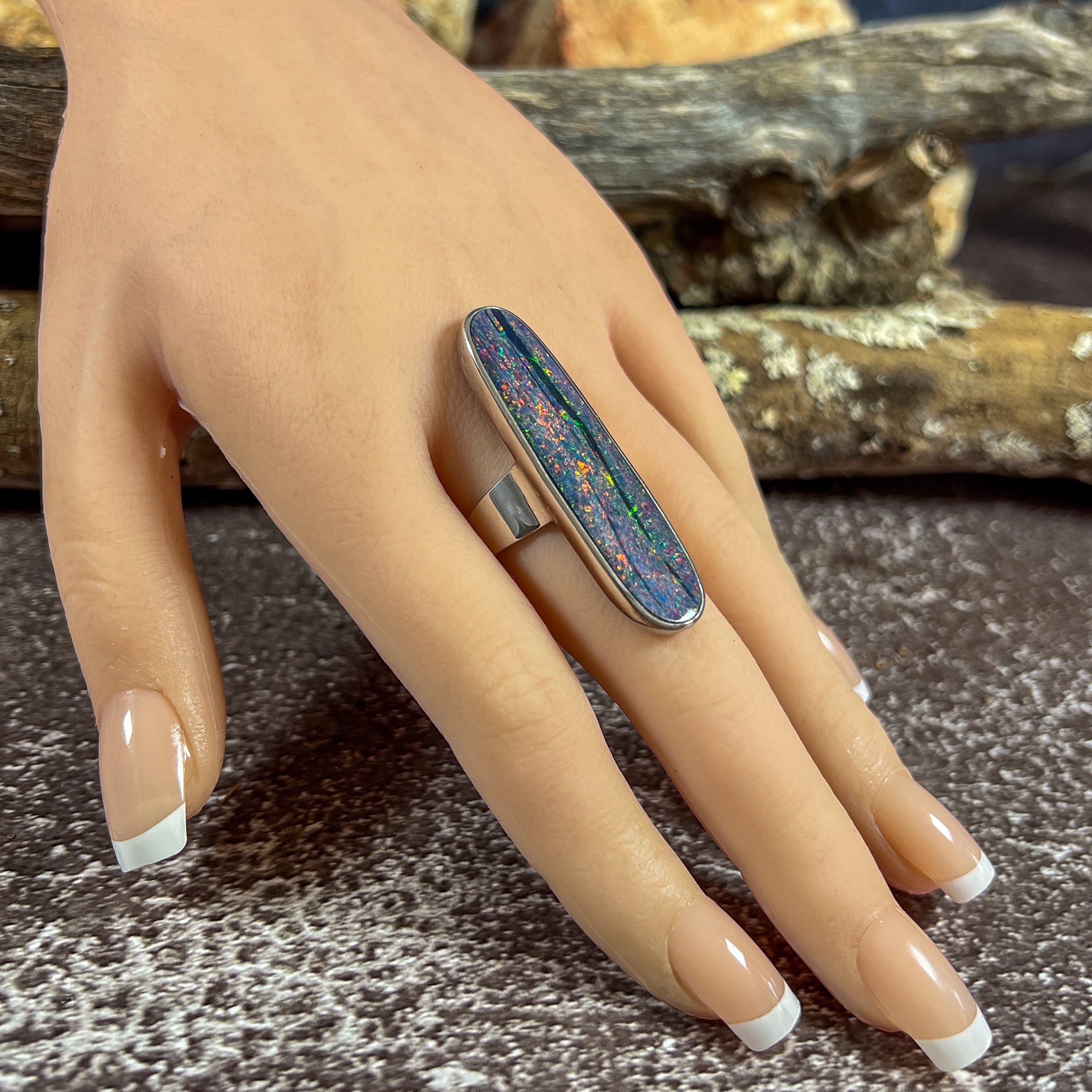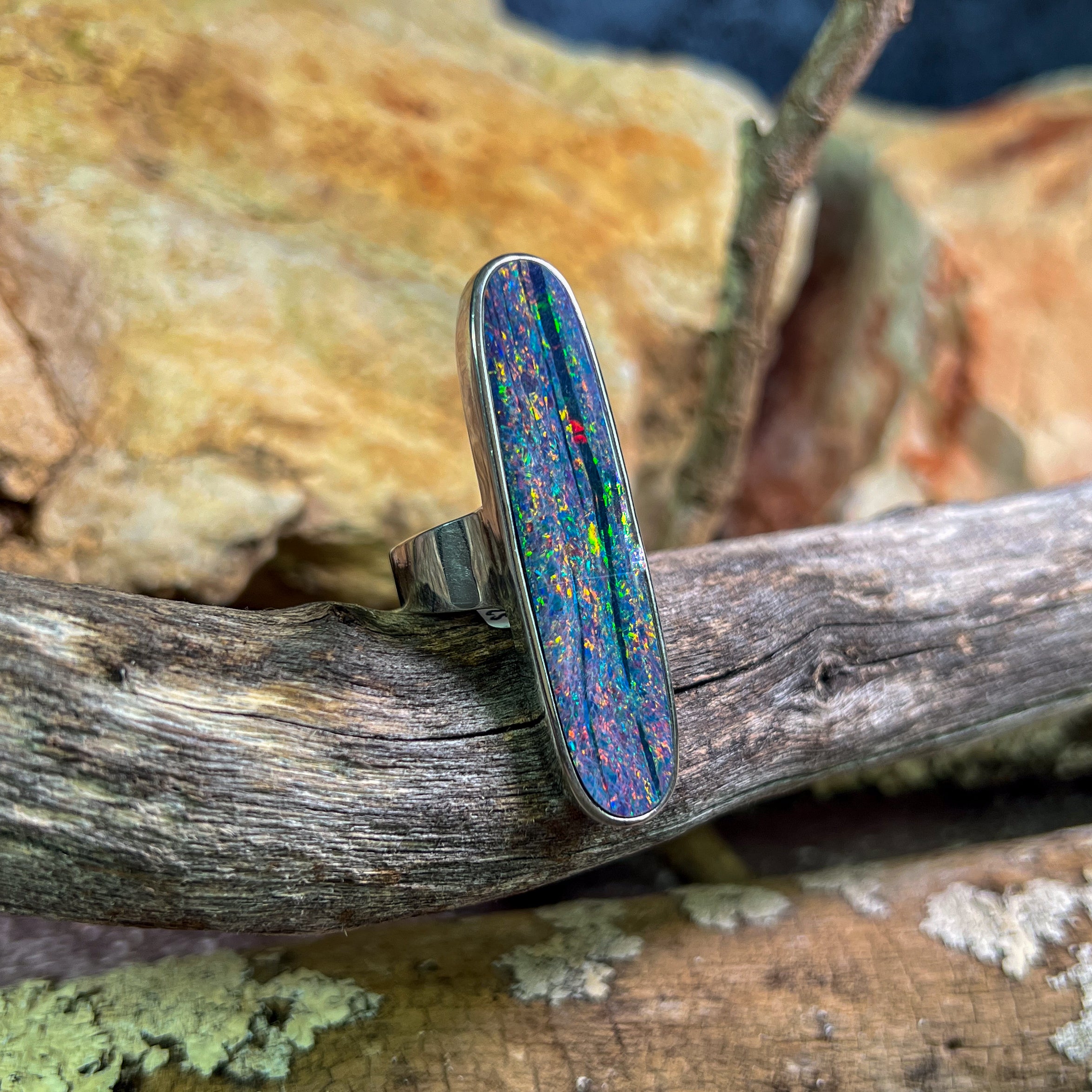 One Sterling Silver 16.5ct Australian Opal doublet bezel set ring with Red Fire and Green Blue colours.