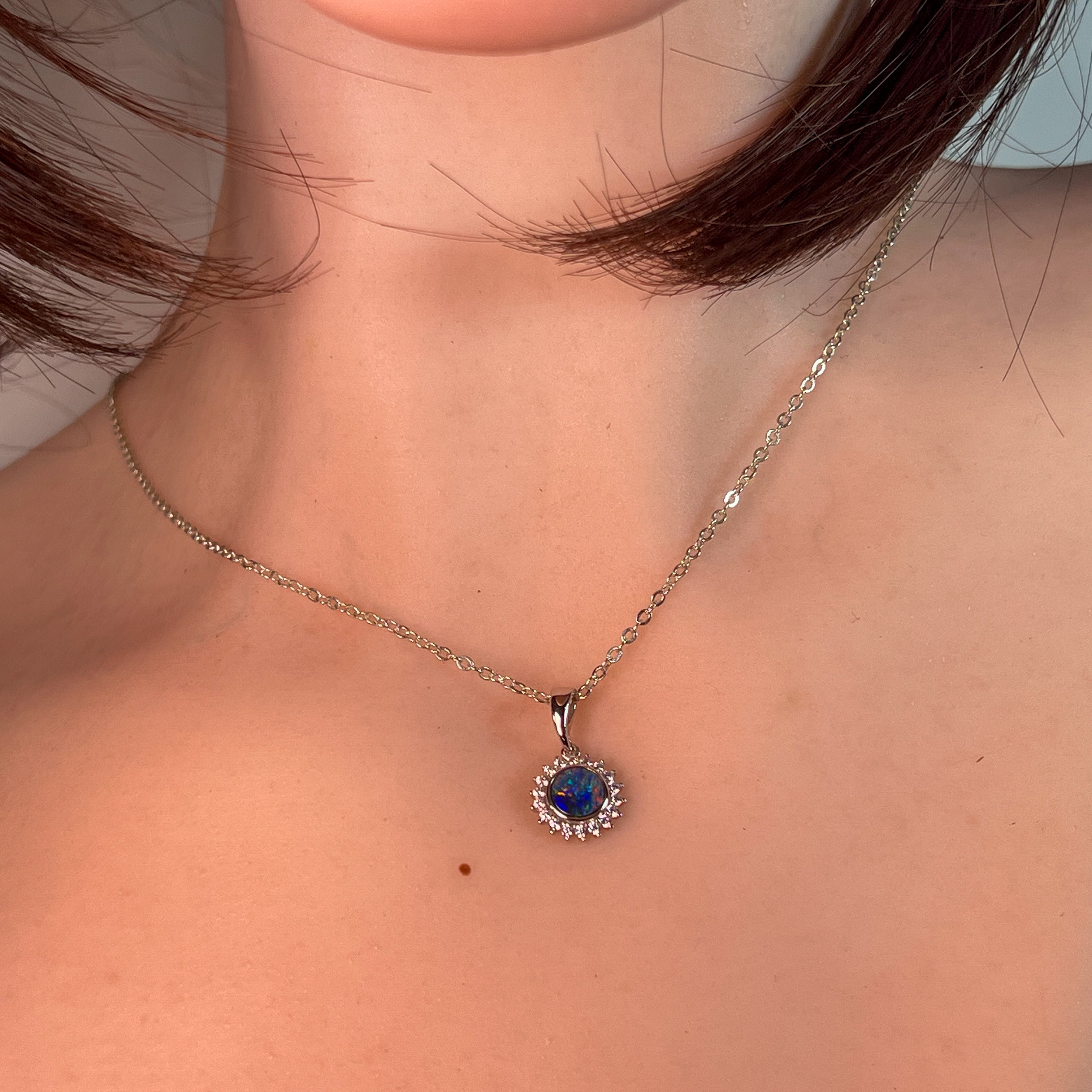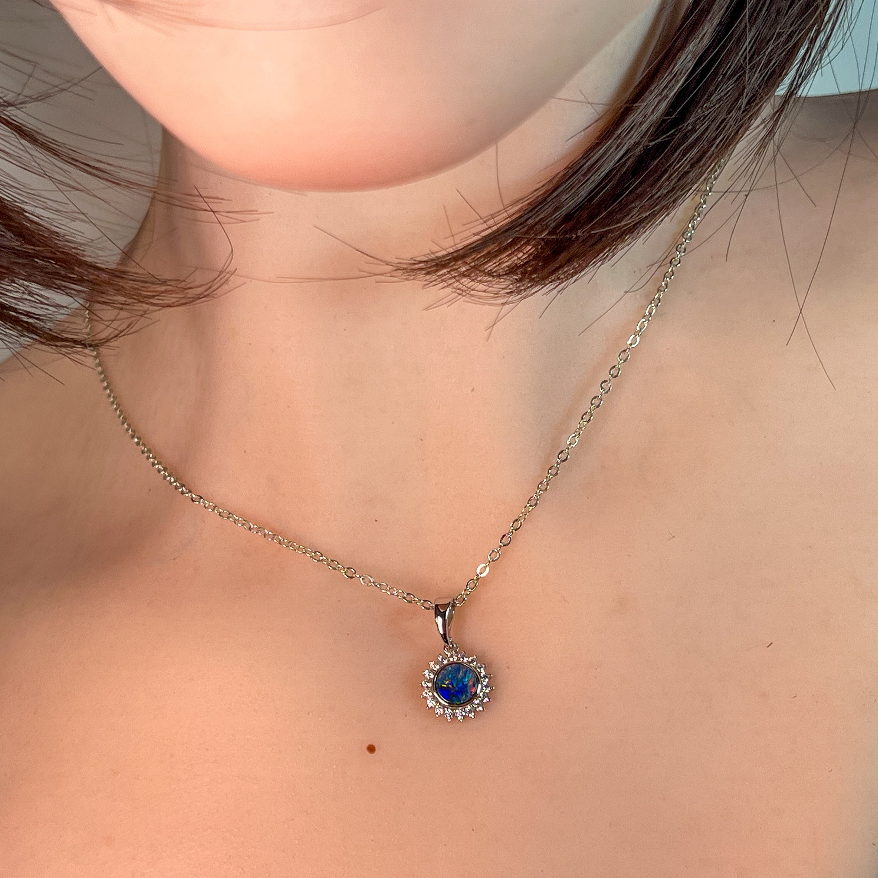 Elevate any outfit with this Sterling Silver Opal round 6mm doublet cluster pendant. Featuring a timeless cluster design that highlights the opal’s vibrant play of color, this pendant offers both elegance and versatility. Crafted from high-quality sterling silver, it promises lasting shine and durability. Perfect for adding a touch of classic sophistication to your everyday look or special occasions.