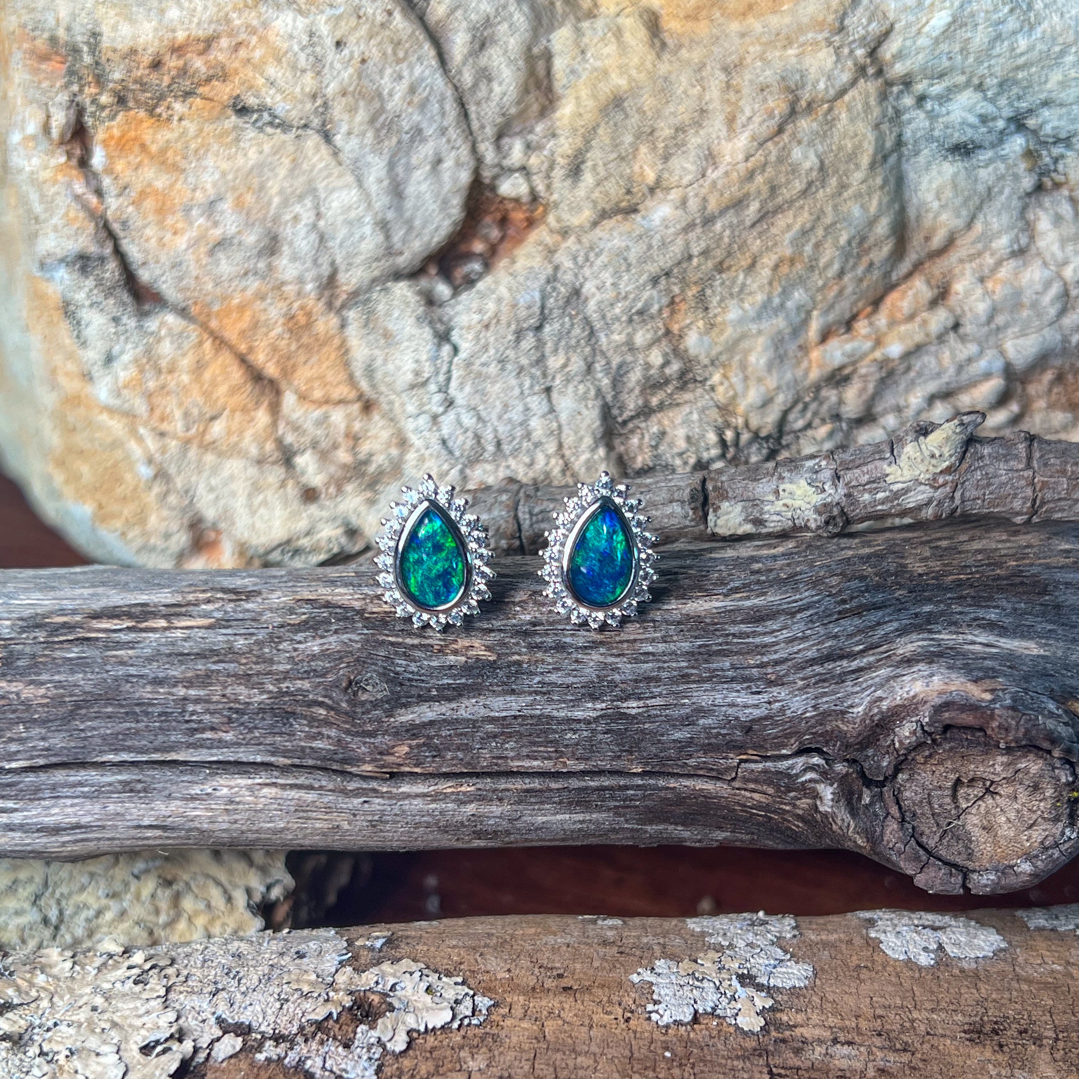 Sterling Silver pearshape Opal triplet 8x5mm cluster stud earrings