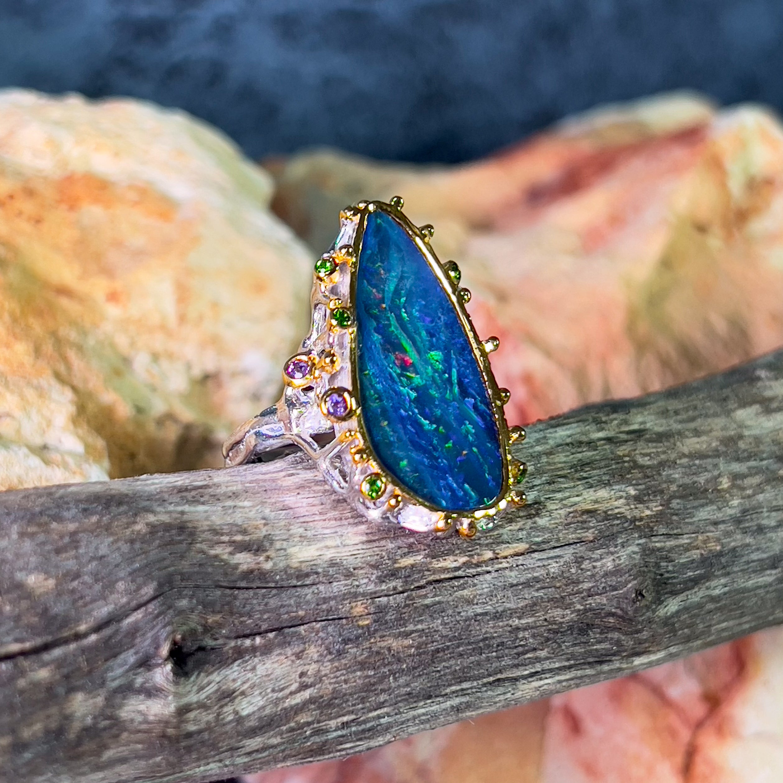 Sterling Silver Two Tone Opal doublet and multi colour Coral design ring
