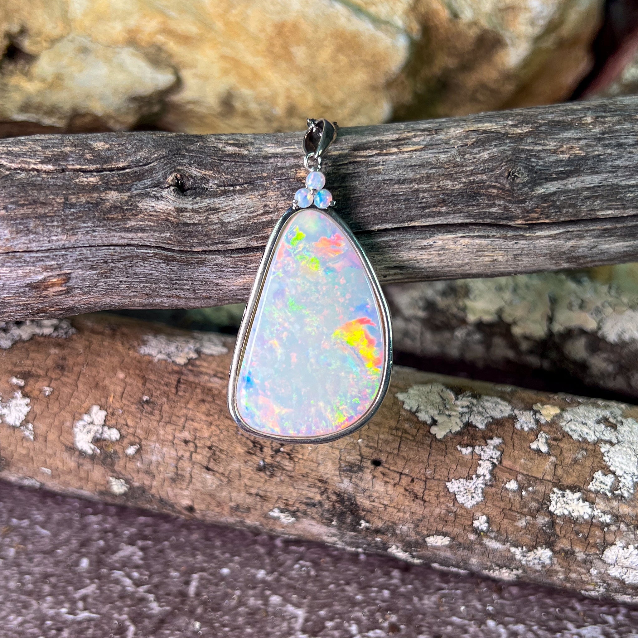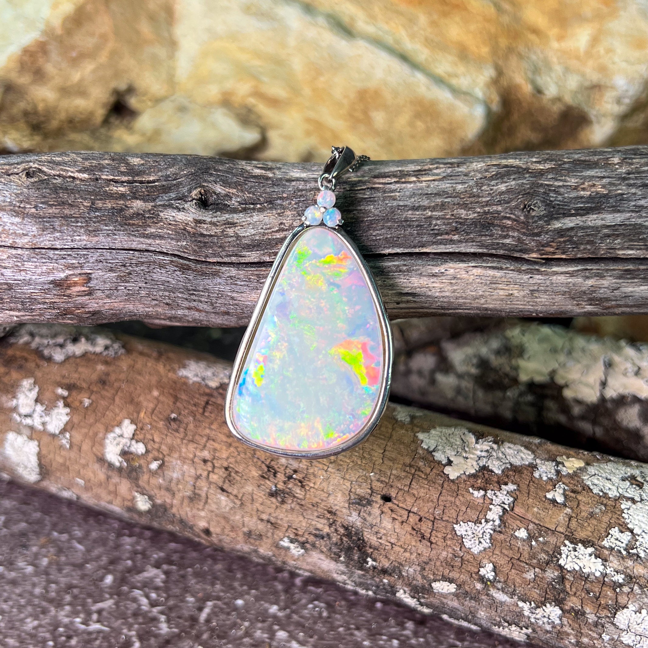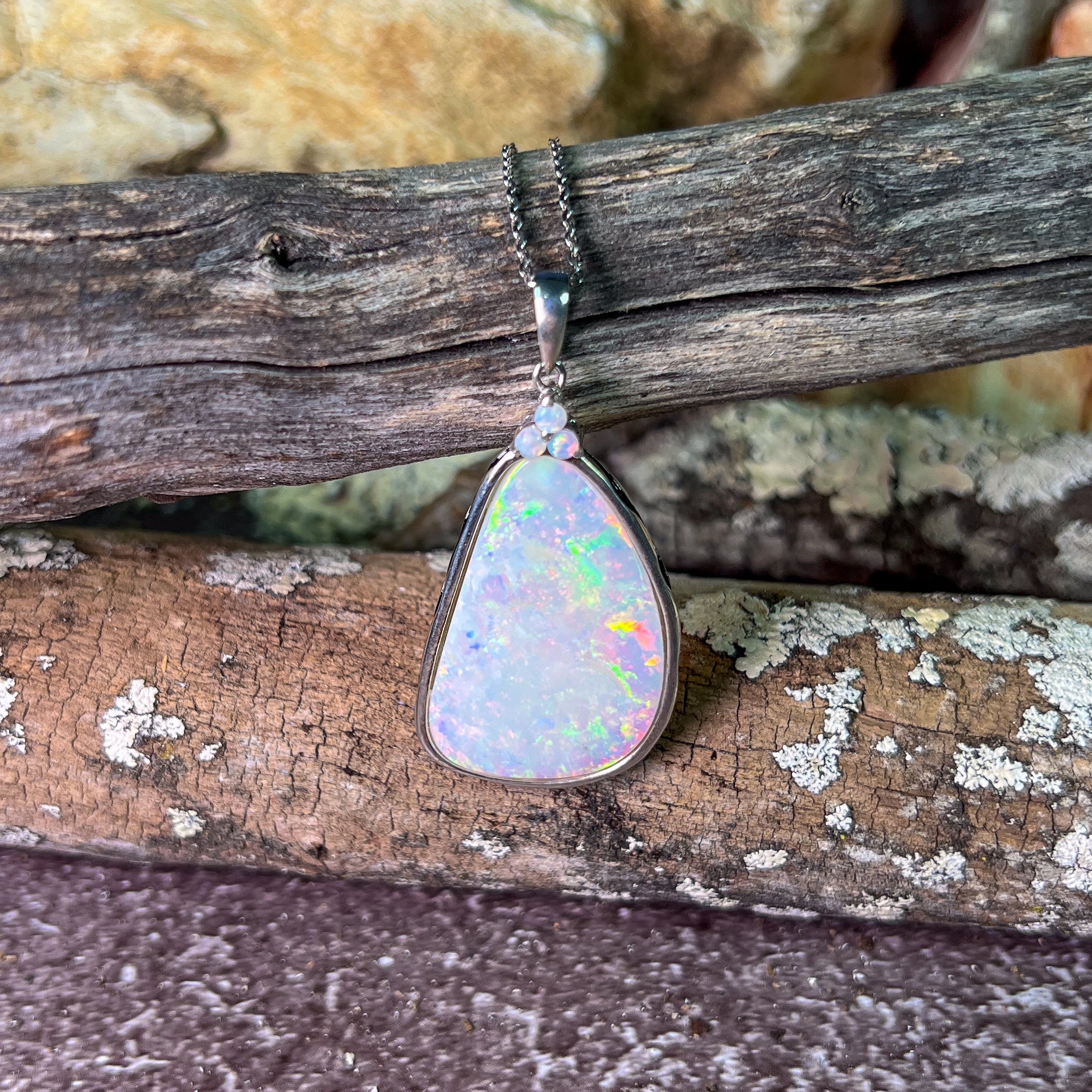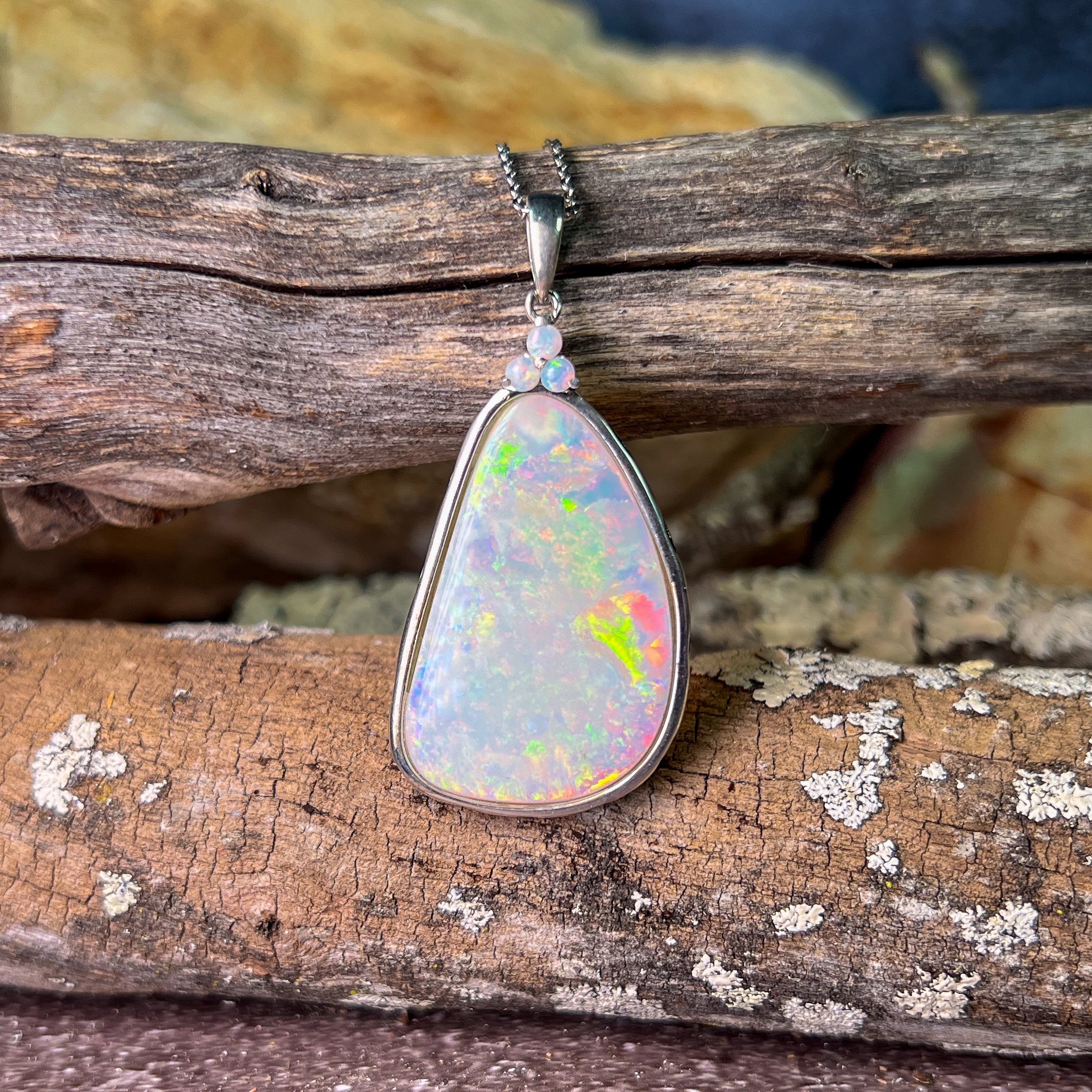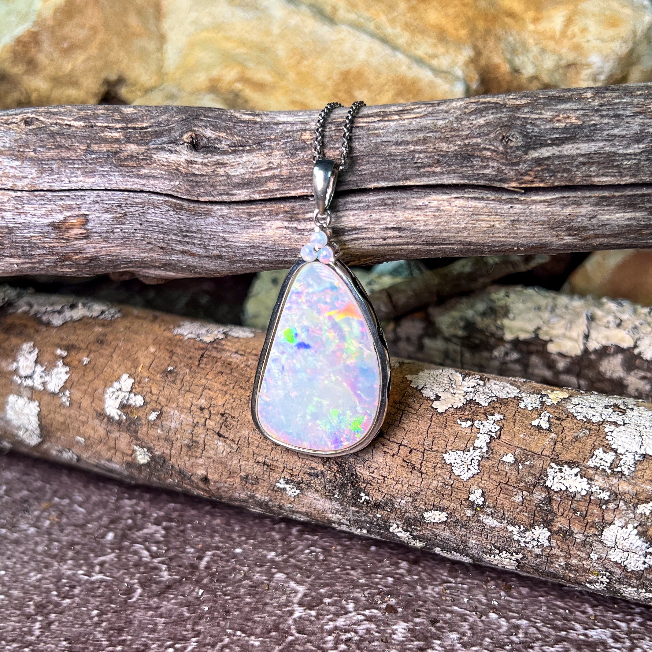 This stunning Sterling Silver White Opal pendant will make a bold and elegant statement. Featuring a beautiful white opal, this pendant is sure to catch the eye and add a touch of sophistication to any outfit. Elevate your style with the shimmering beauty of this opal pendant.