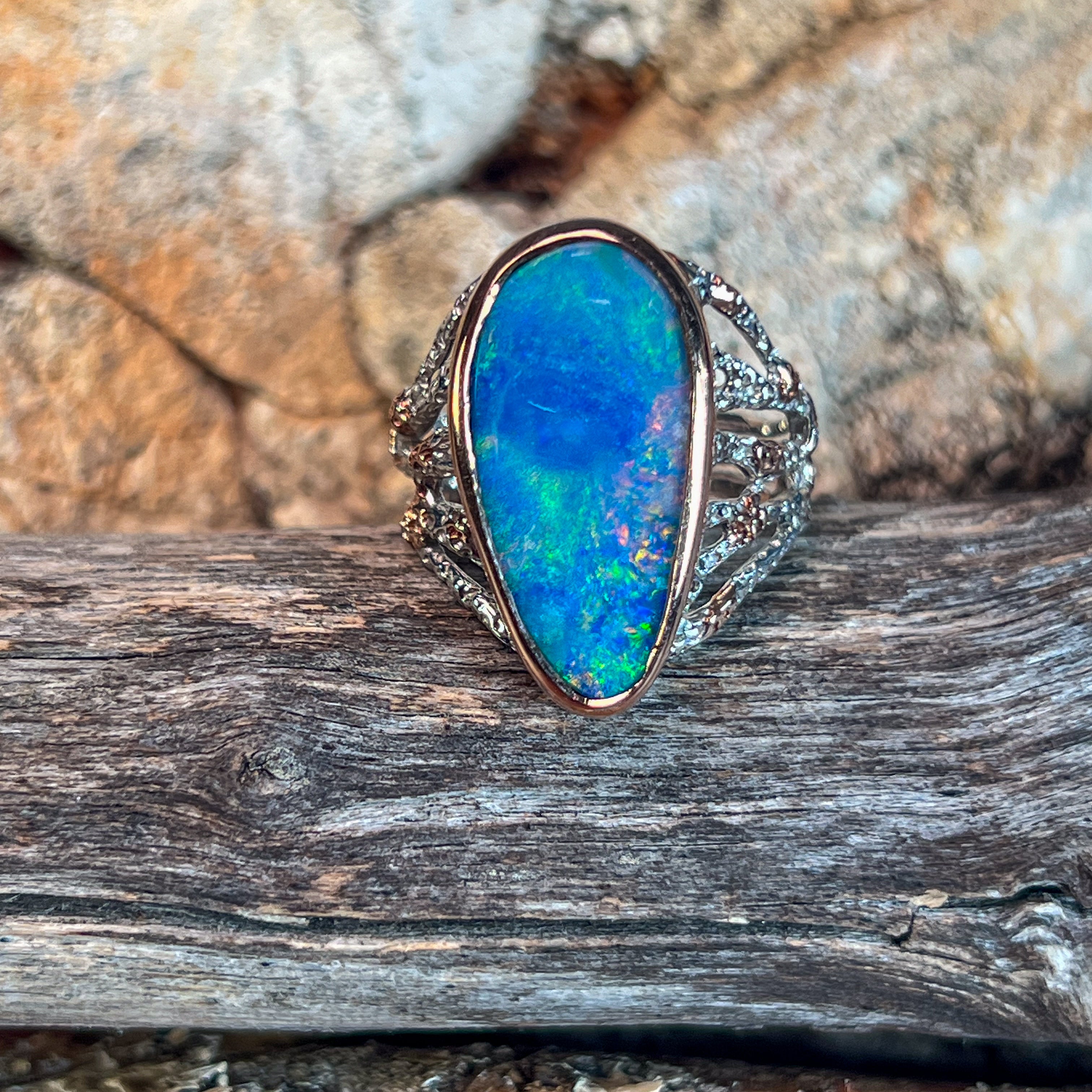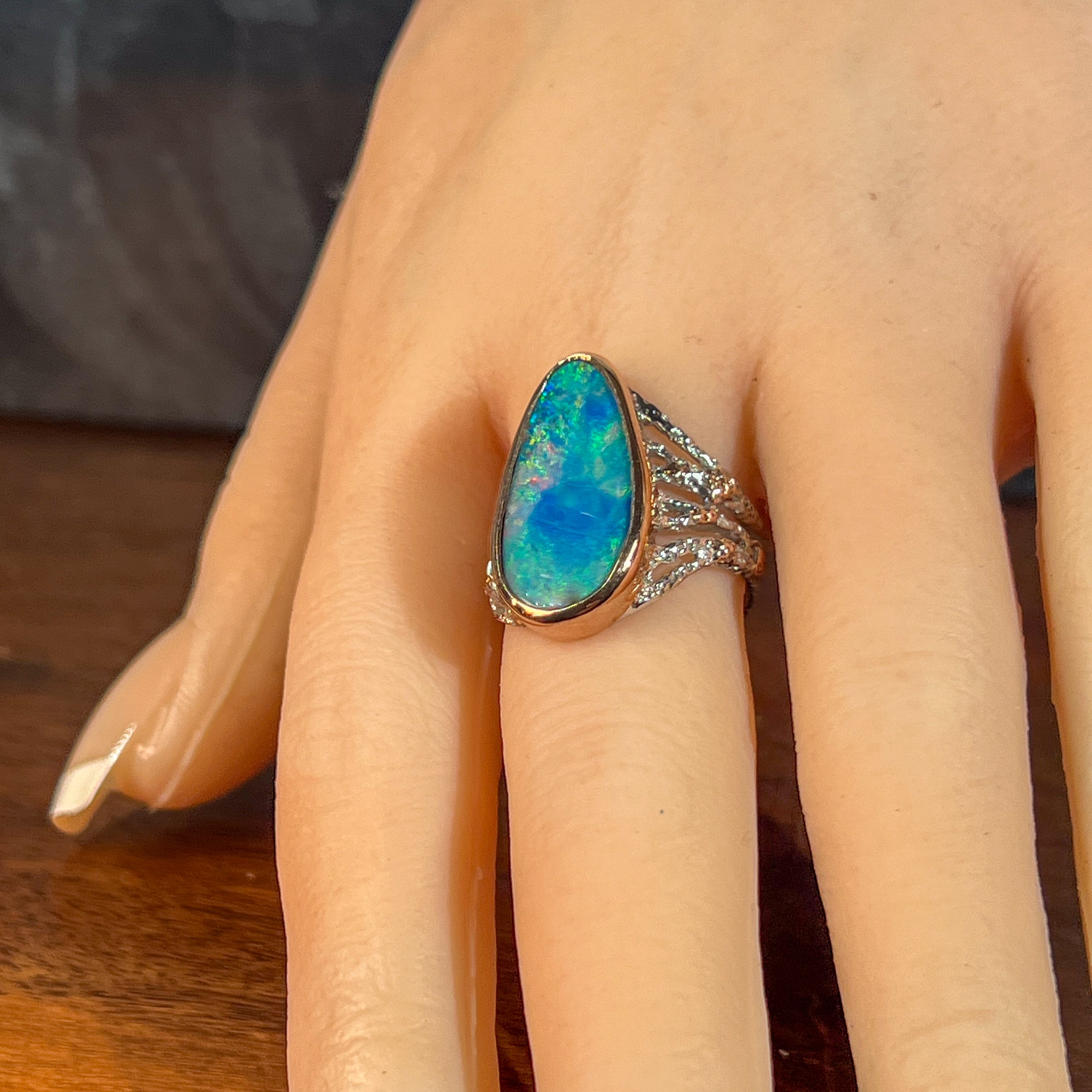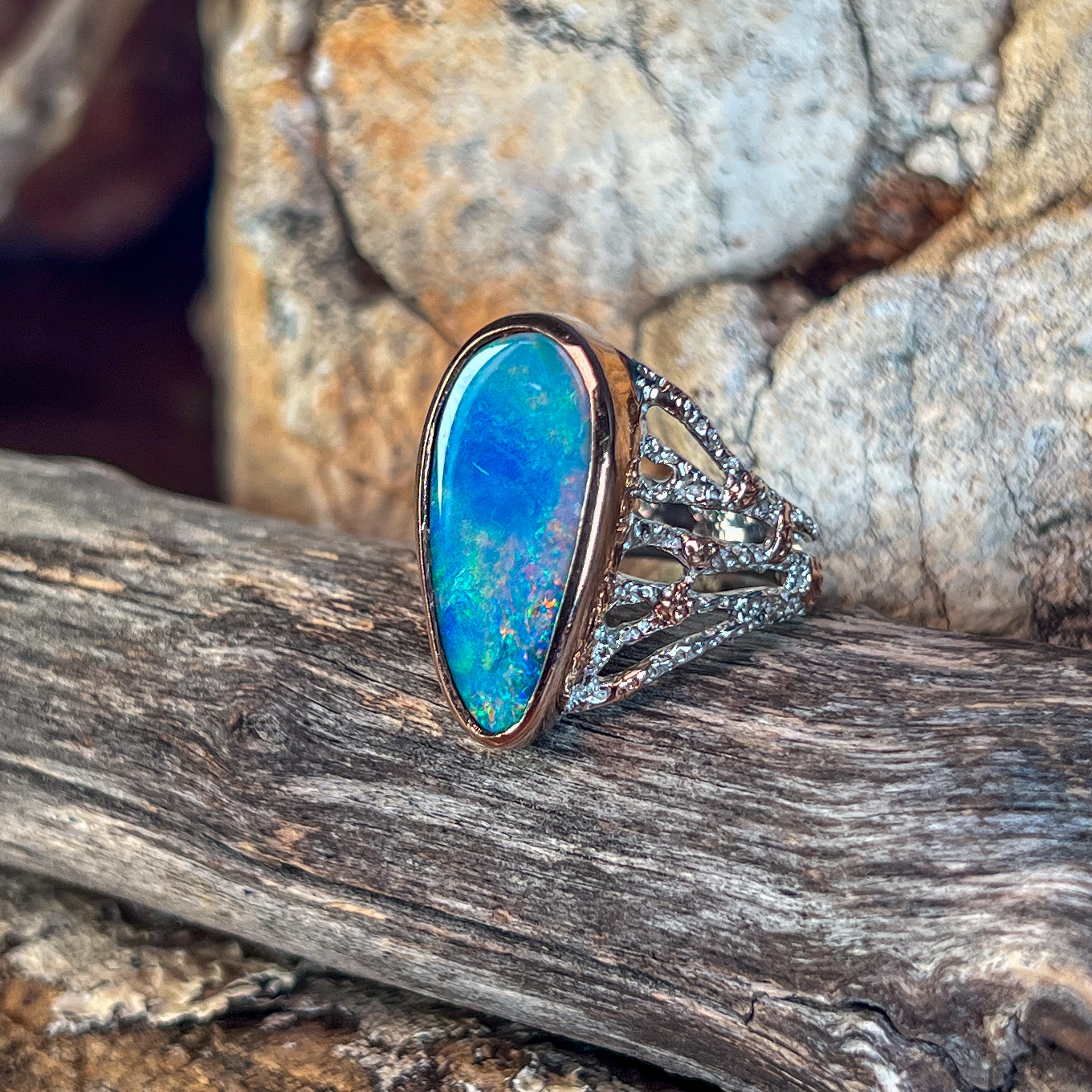 A striking statement ring that commands attention. This sterling silver two-tone design features a substantial 5.63ct Australian opal doublet with vibrant red, blue, and green play-of-colour. The freeform stone (23.1 x 12.7mm) is bezel-set in a broad reef-inspired band with rose gold plating for added warmth and sophistication. Perfect for those who appreciate bold, wearable art. Size P 1/2, weighs 6.37g.