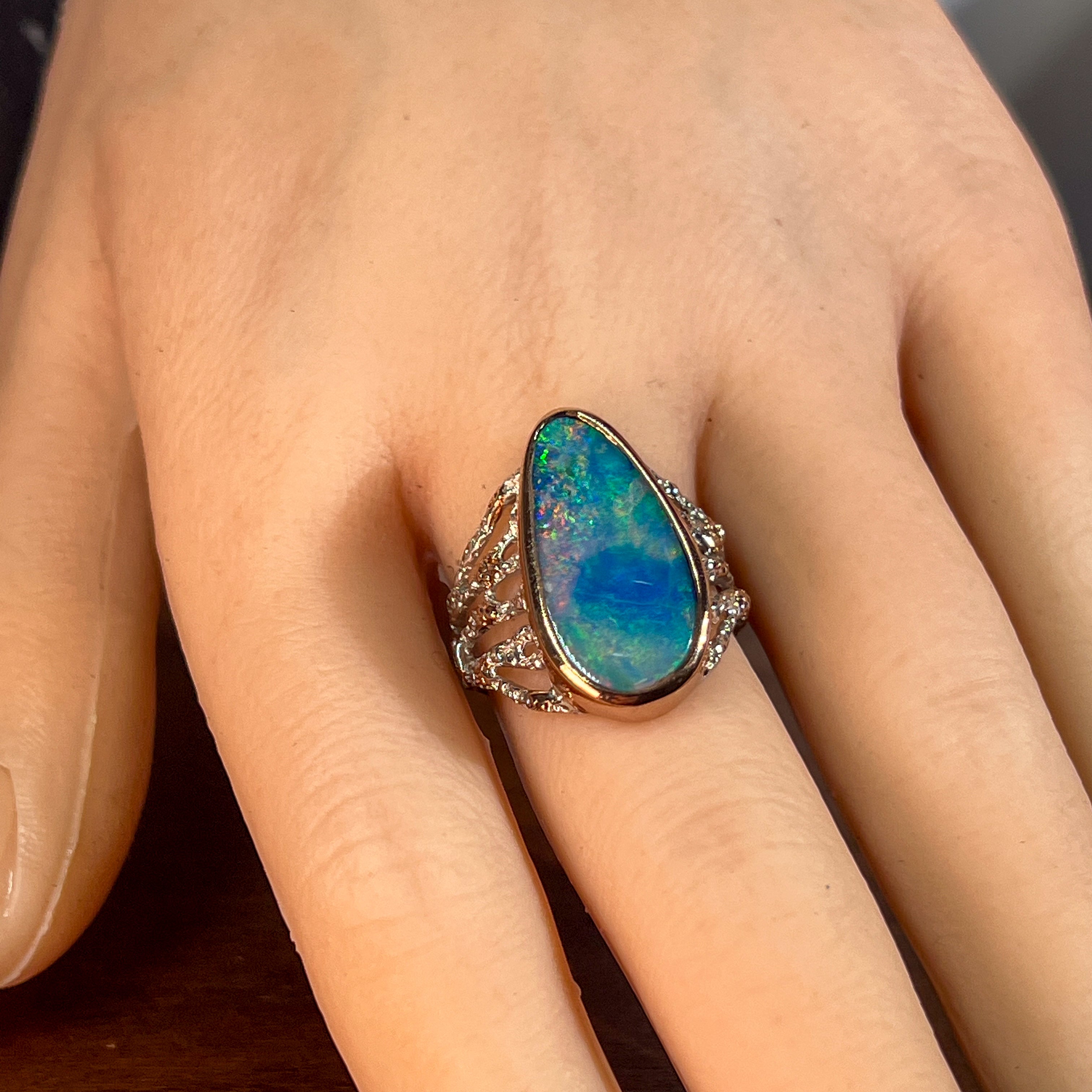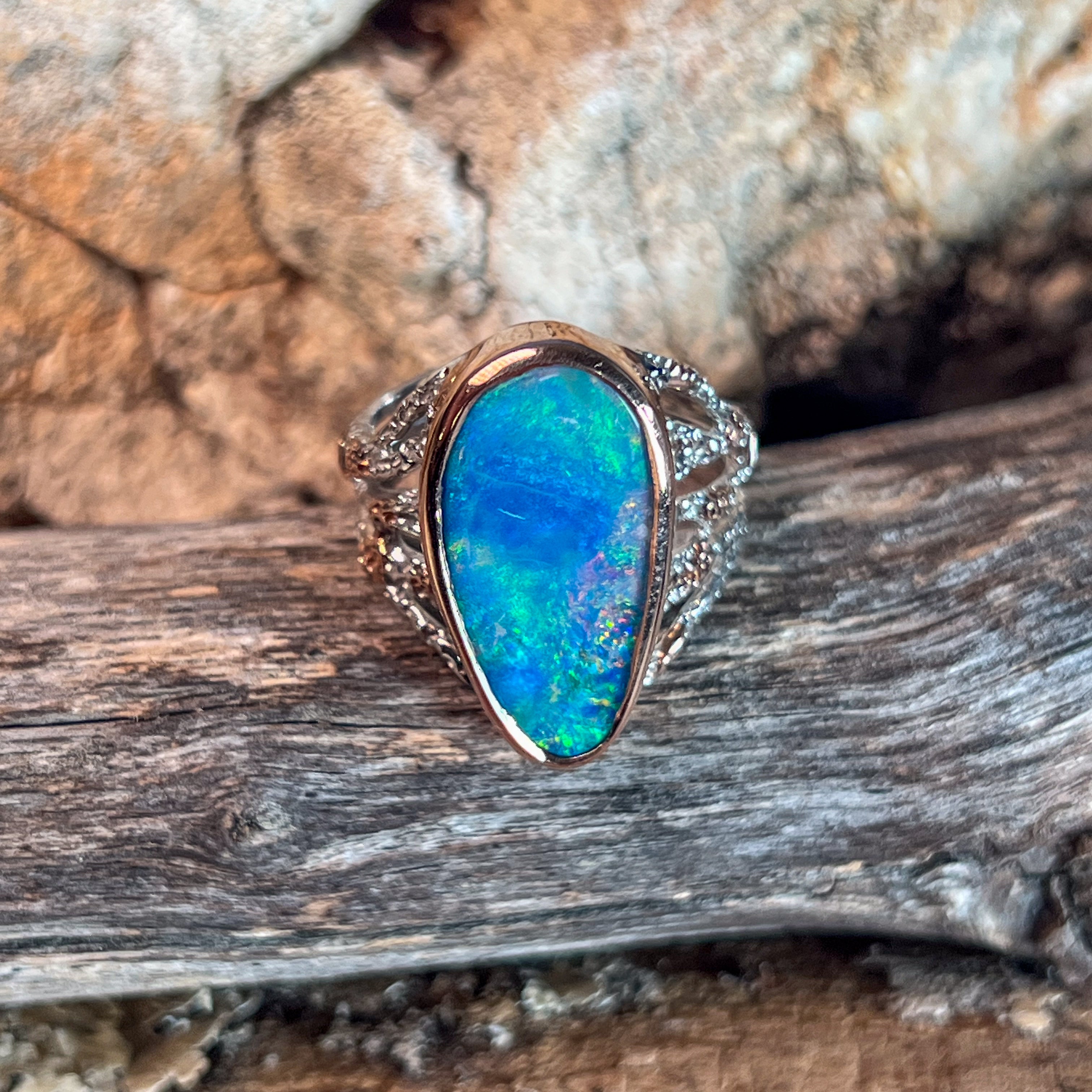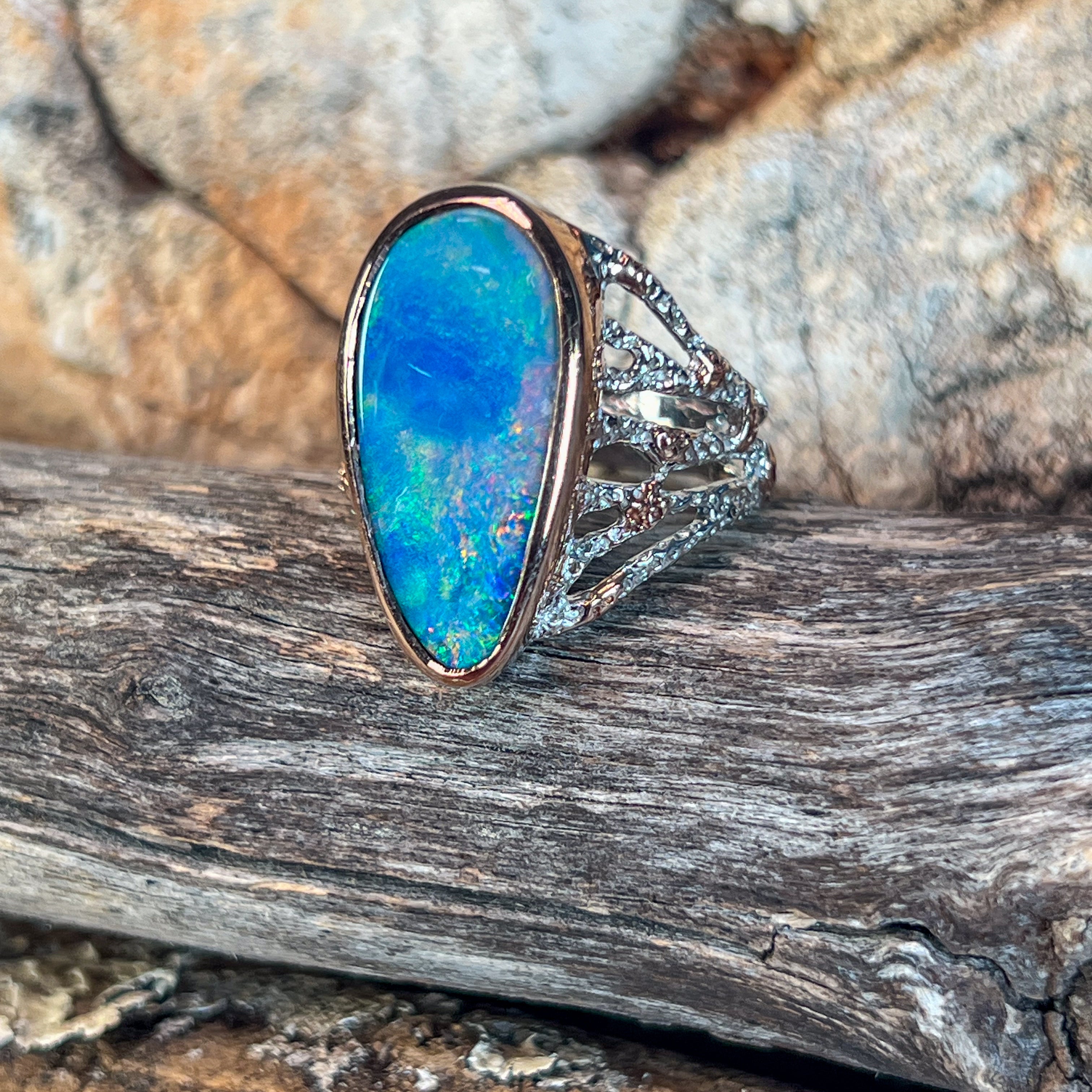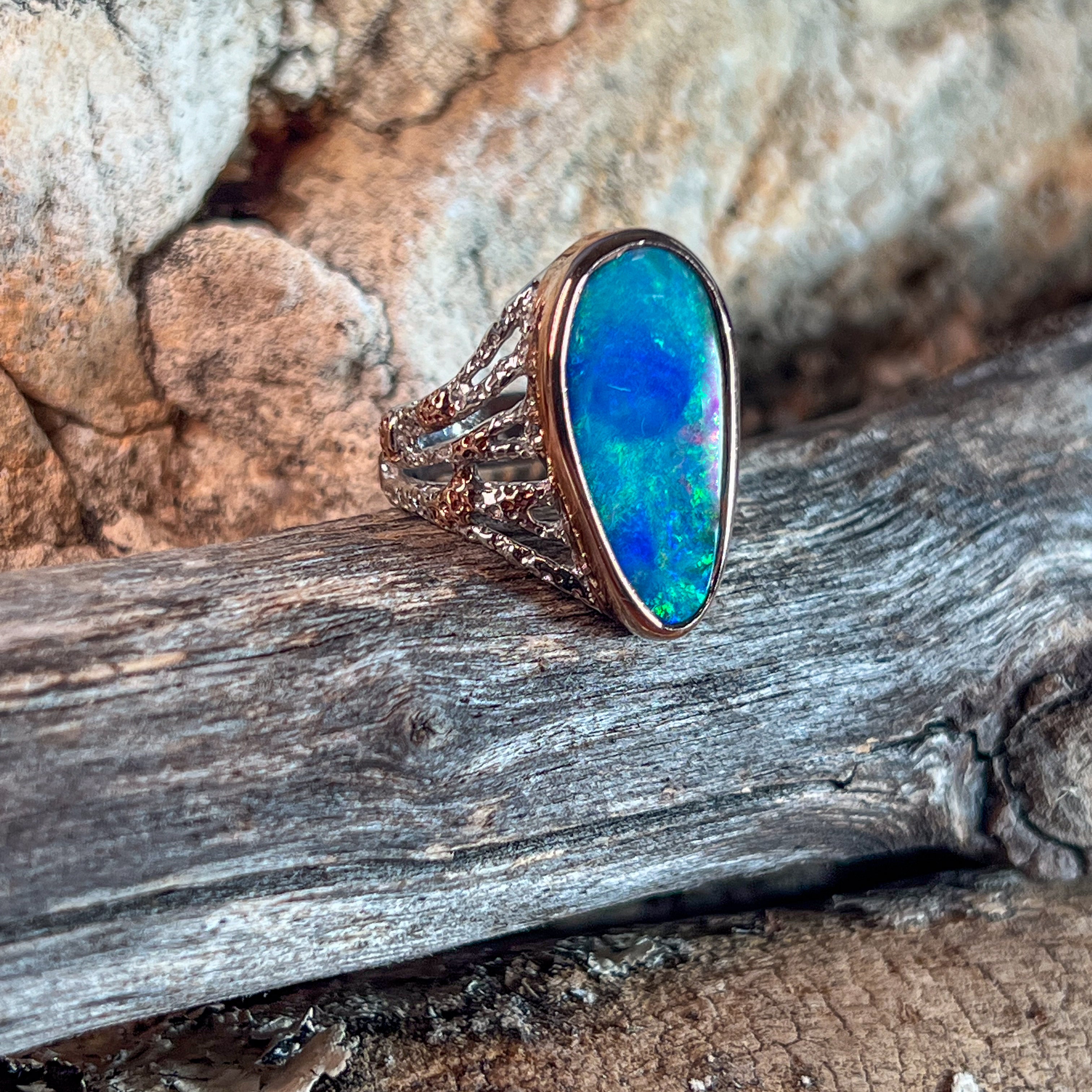 One Sterling Silver Two Tone Rose Gold Plated Reef design Opal Large broad ring